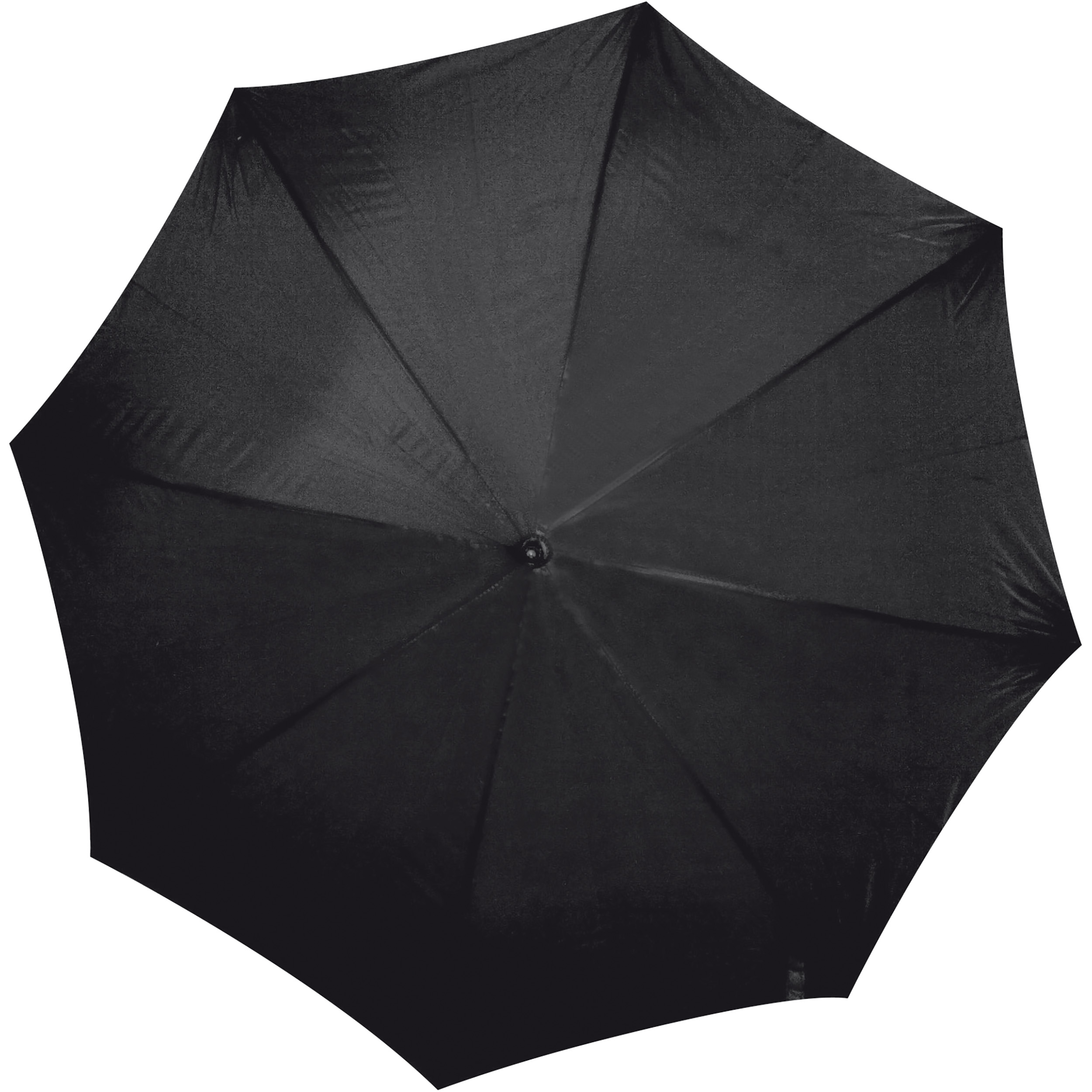 Automatikschirm aus 190T Polyester mit gebogenem Holzgriff und Holzspitzen. Ihre Werbung drucken wir auf den unteren Teil eines Segments.