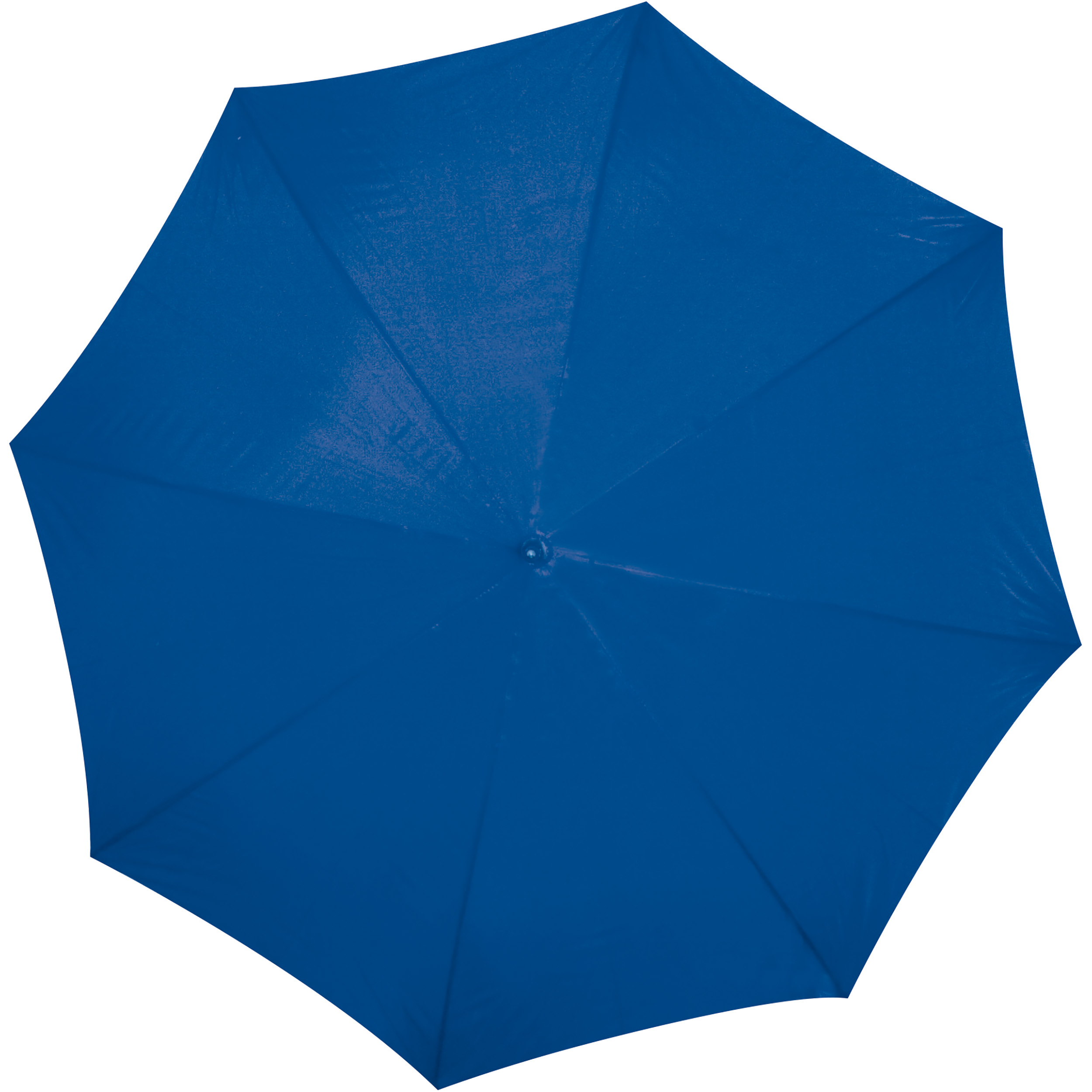 Automatikschirm aus 190T Polyester mit gebogenem Holzgriff und Holzspitzen. Ihre Werbung drucken wir auf den unteren Teil eines Segments.