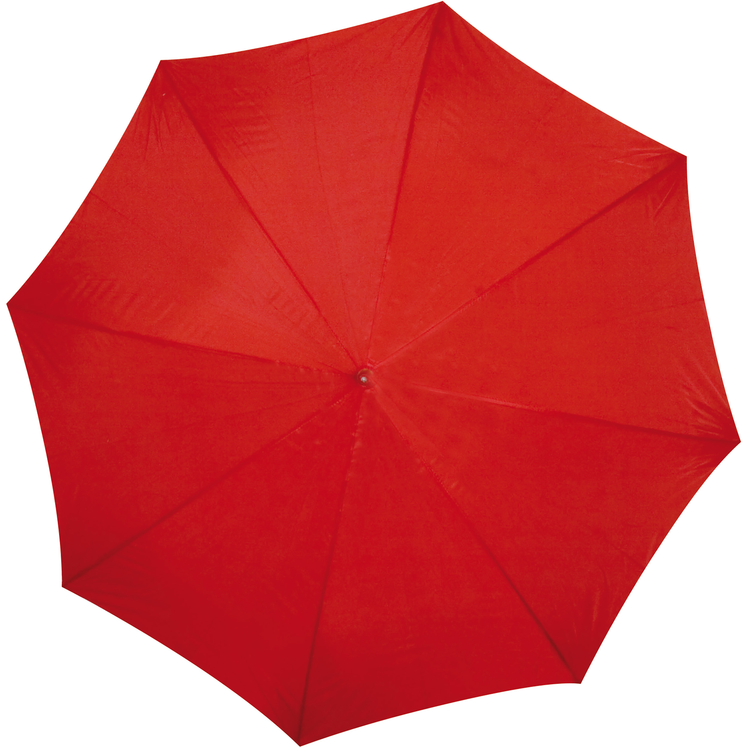 Automatikschirm aus 190T Polyester mit gebogenem Holzgriff und Holzspitzen. Ihre Werbung drucken wir auf den unteren Teil eines Segments.
