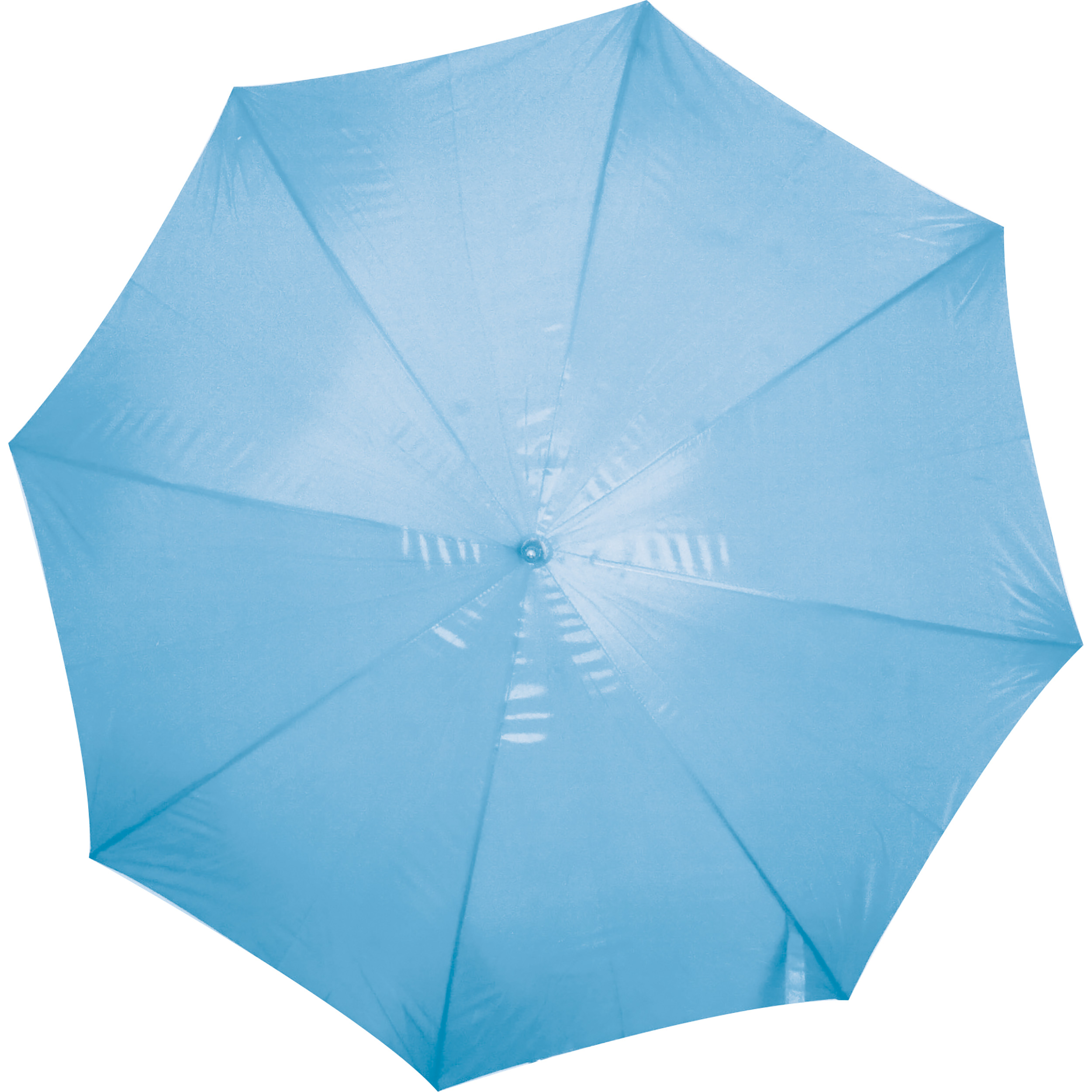 Automatikschirm aus 190T Polyester mit gebogenem Holzgriff und Holzspitzen. Ihre Werbung drucken wir auf den unteren Teil eines Segments.