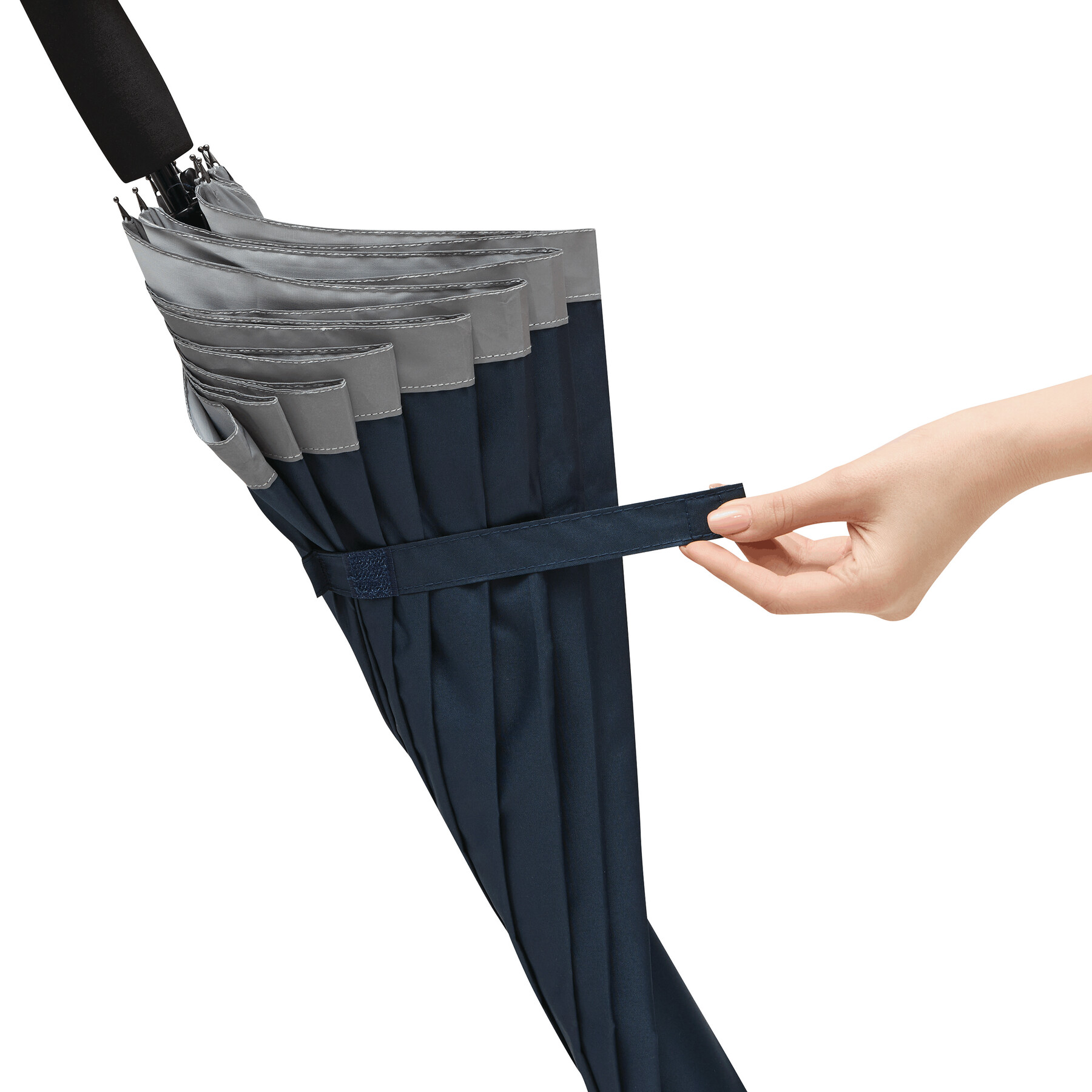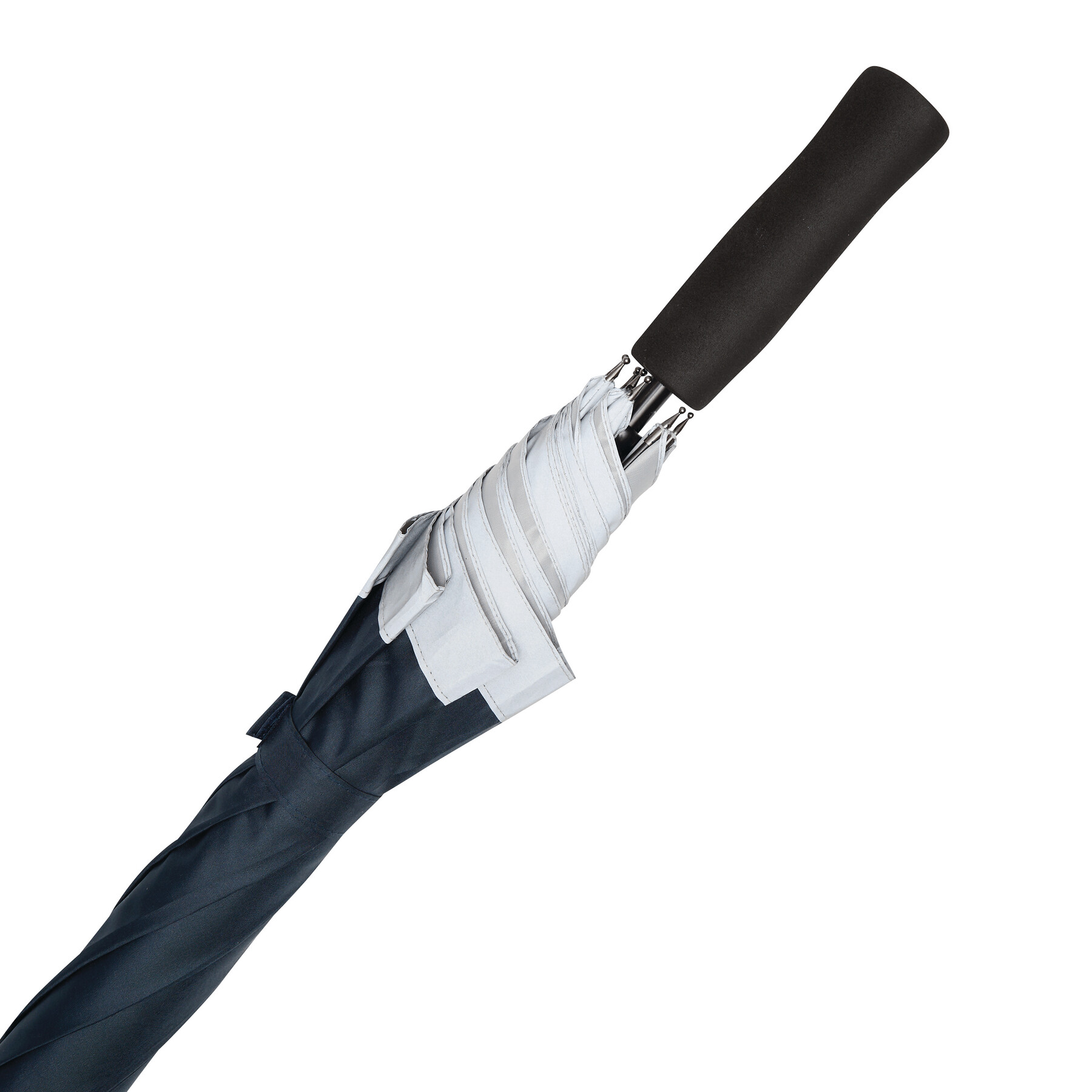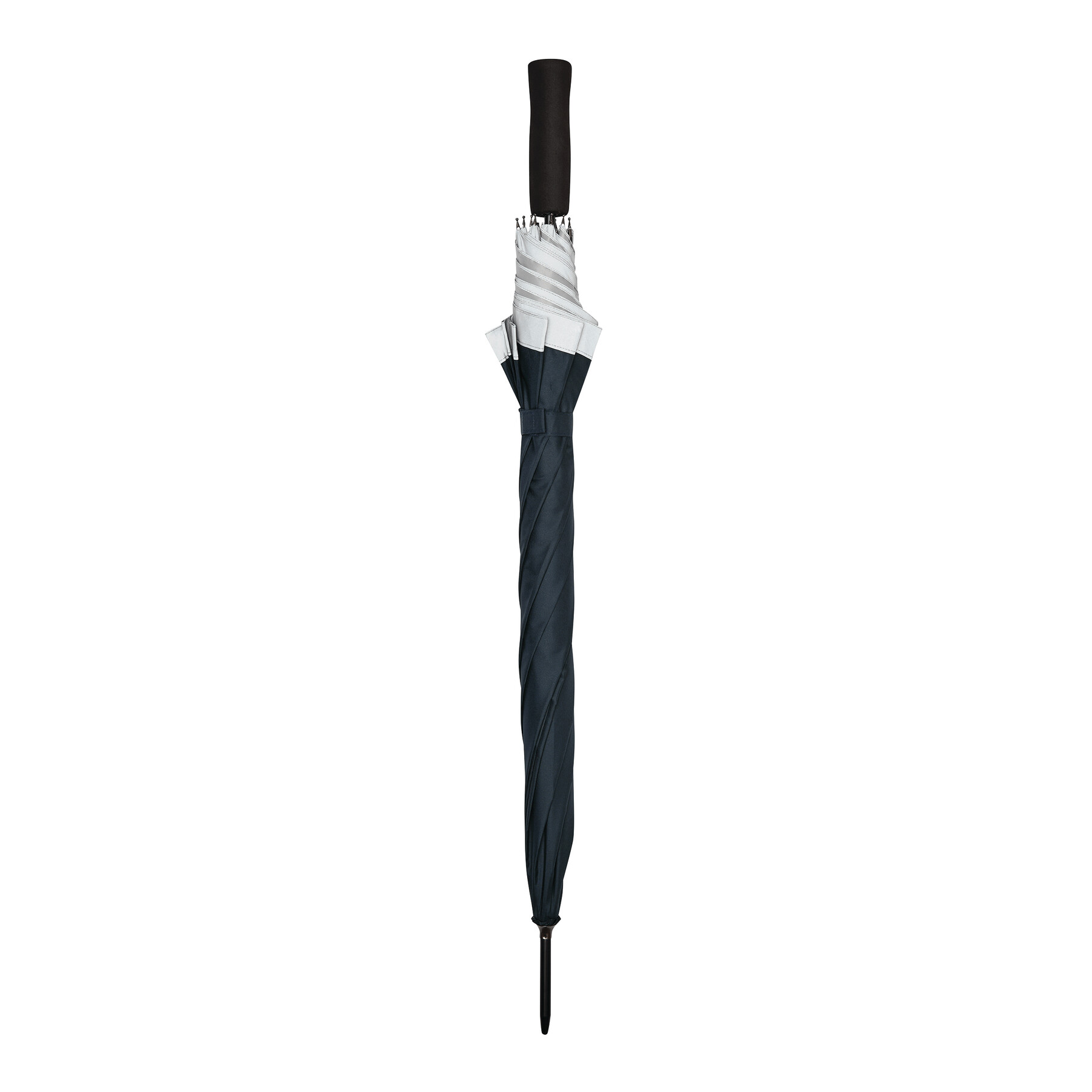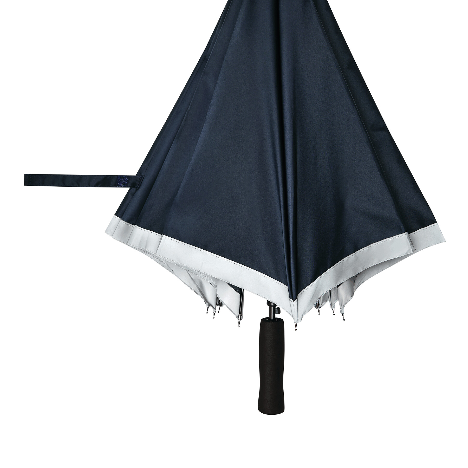 Automatischer Stockschirm CALIMA: Metallstock, Fiberglasspeichen, Metalltips, EVA-Griff, Polyester-Pongee-Bespannung aus recycelten Kunststoffen / RPET, mit silberfarbener, reflektierender Umrandung, Schließband mit Klettverschluss