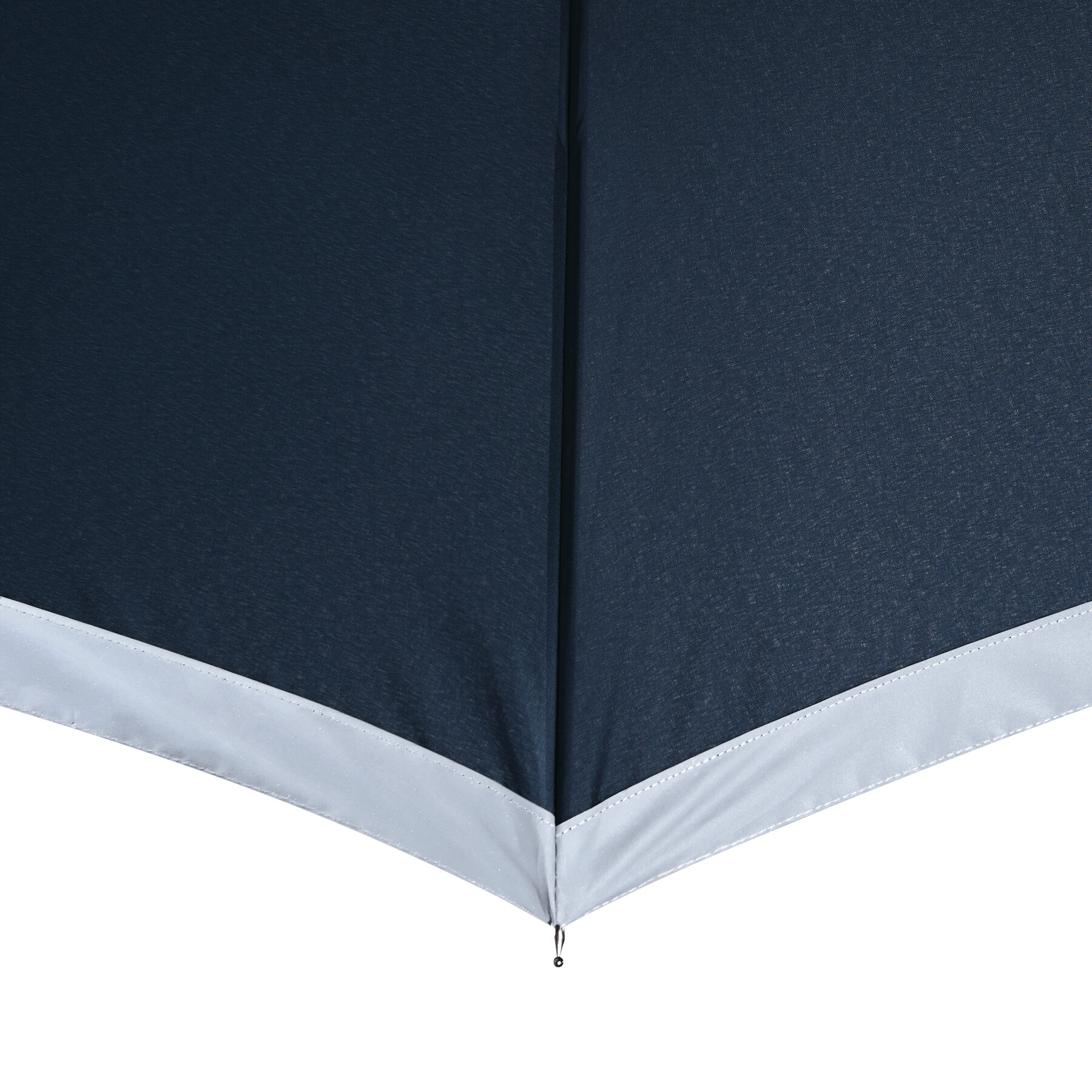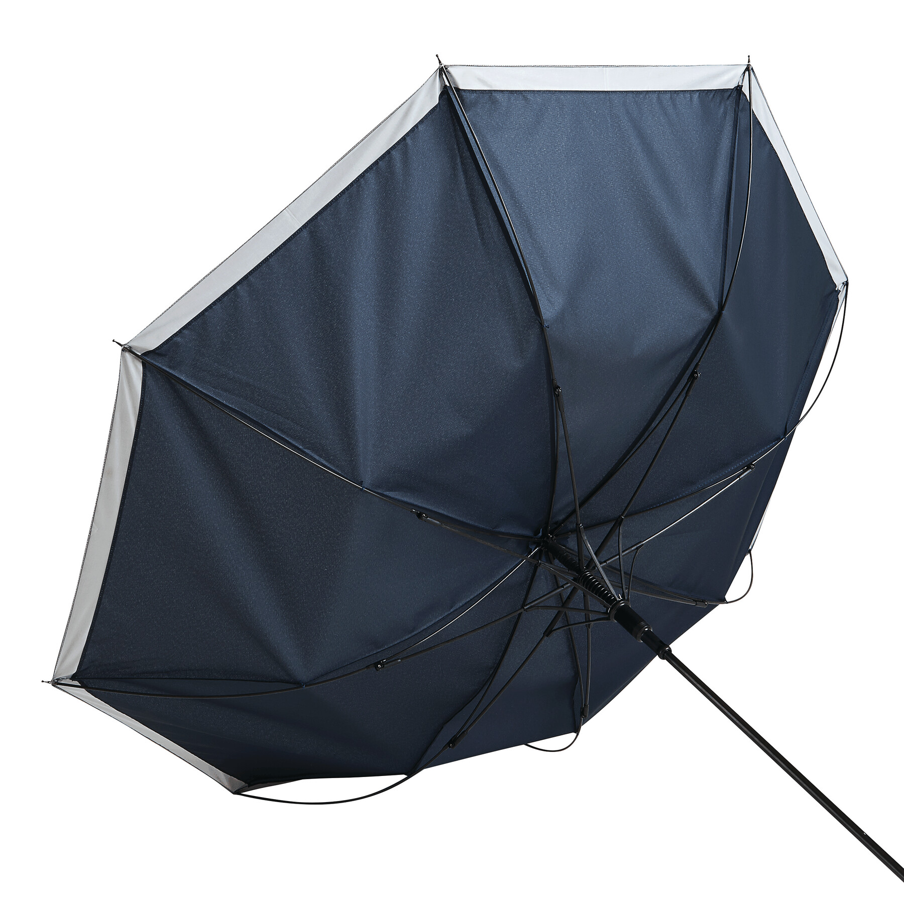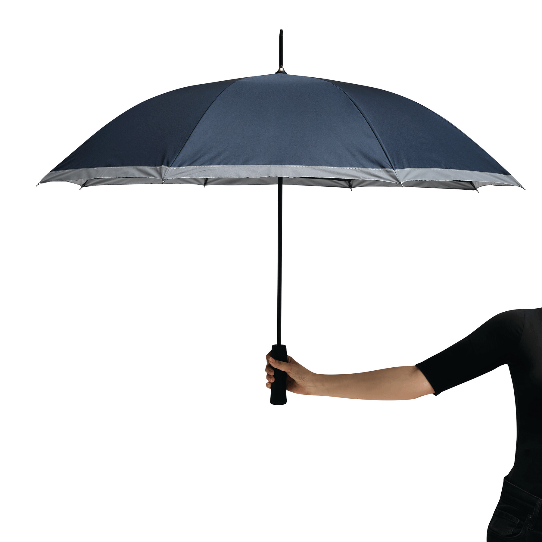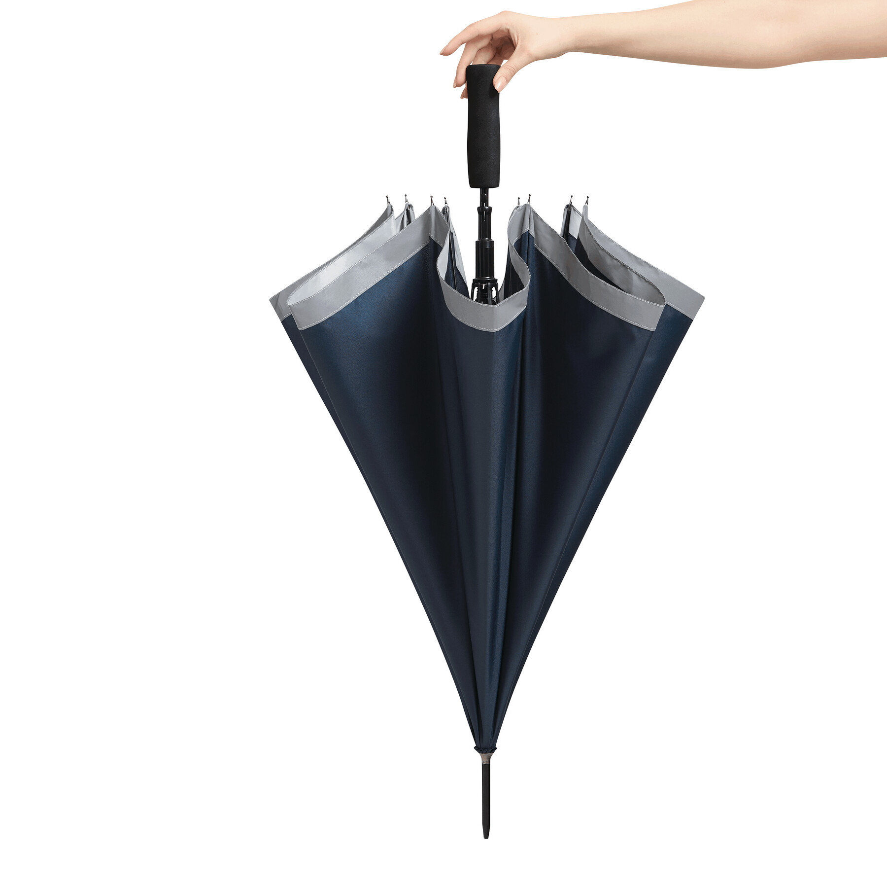 Automatischer Stockschirm CALIMA: Metallstock, Fiberglasspeichen, Metalltips, EVA-Griff, Polyester-Pongee-Bespannung aus recycelten Kunststoffen / RPET, mit silberfarbener, reflektierender Umrandung, Schließband mit Klettverschluss