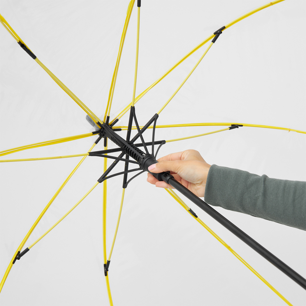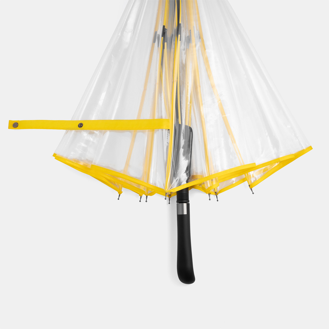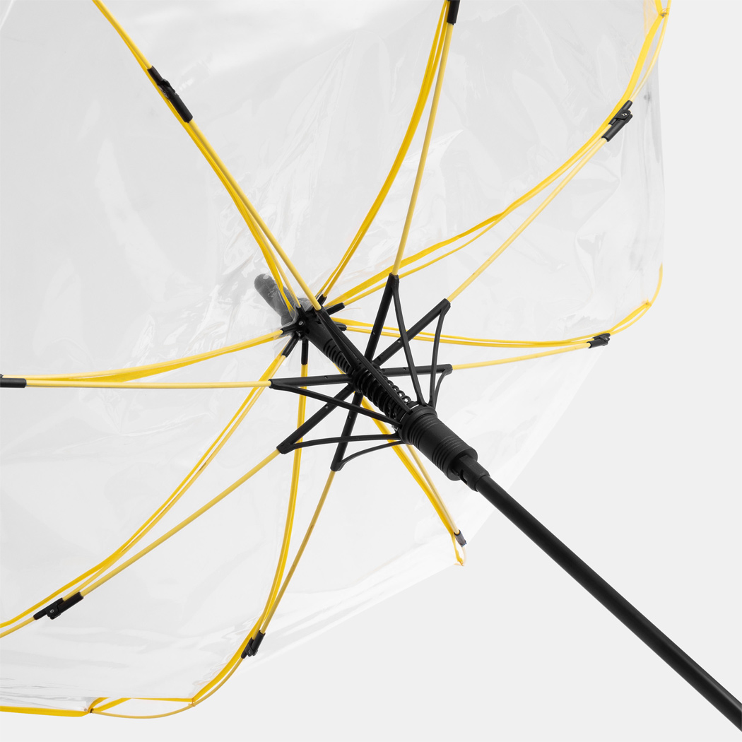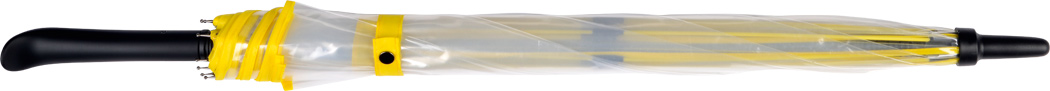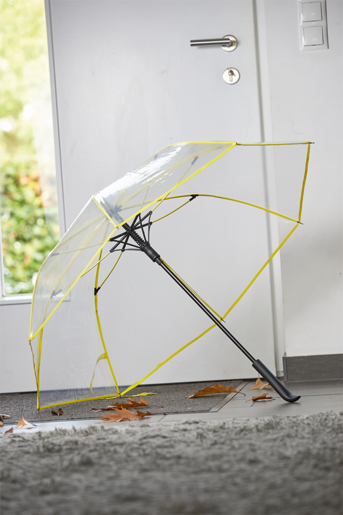 Automatischer Windproof-Stockschirm VIP: Metallstock, farbige Fiberglasspeichen mit Metalltips, Kunststoffspitze, Kunststoffgriff mit integrierter Auslösetaste, transparente POE-Bespannung mit farbiger Paspelierung, Schließband mit Druckknopf