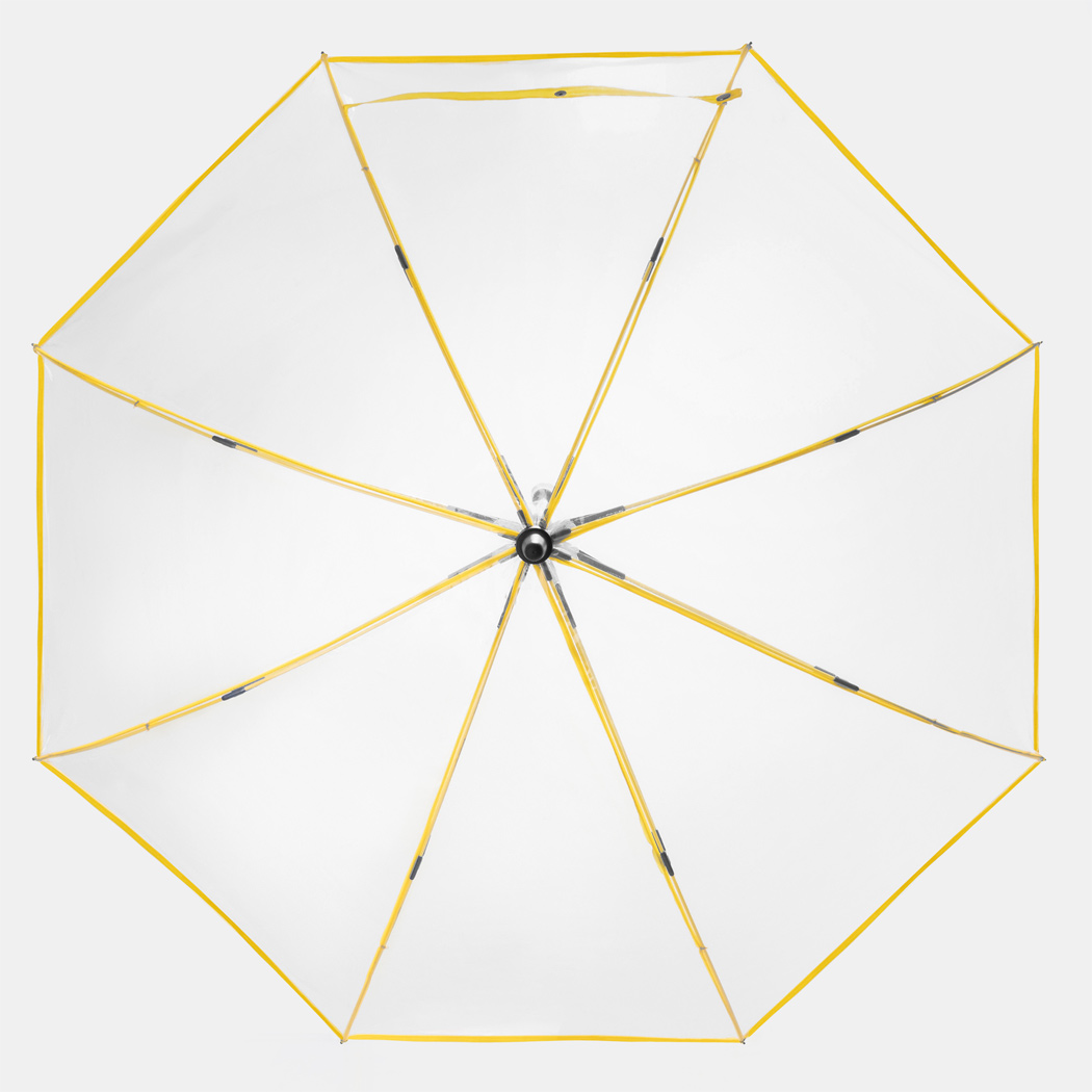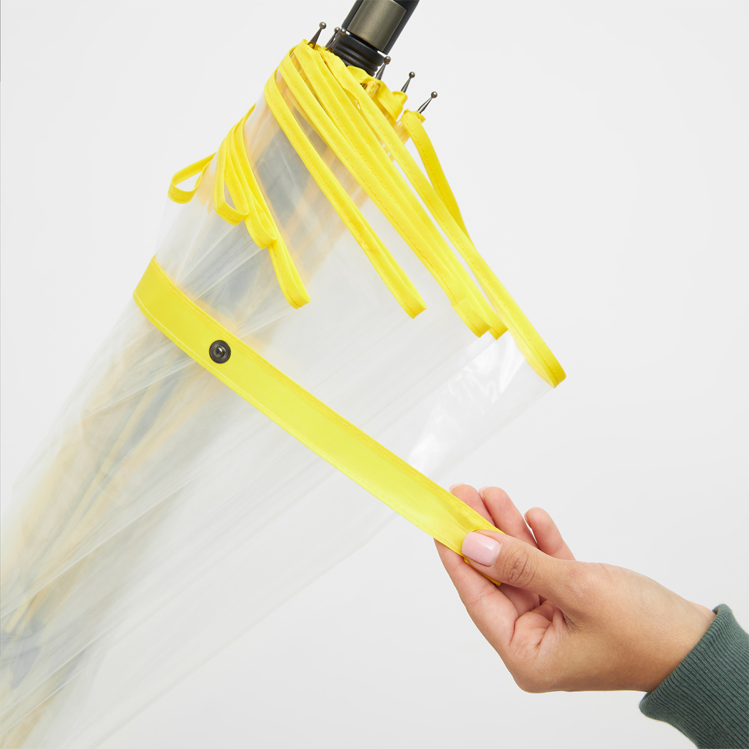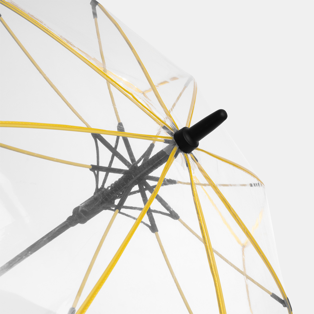 Automatischer Windproof-Stockschirm VIP: Metallstock, farbige Fiberglasspeichen mit Metalltips, Kunststoffspitze, Kunststoffgriff mit integrierter Auslösetaste, transparente POE-Bespannung mit farbiger Paspelierung, Schließband mit Druckknopf