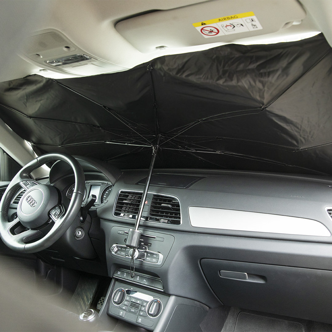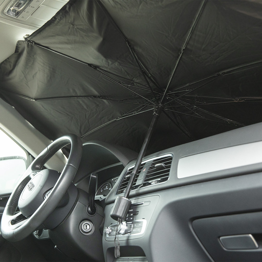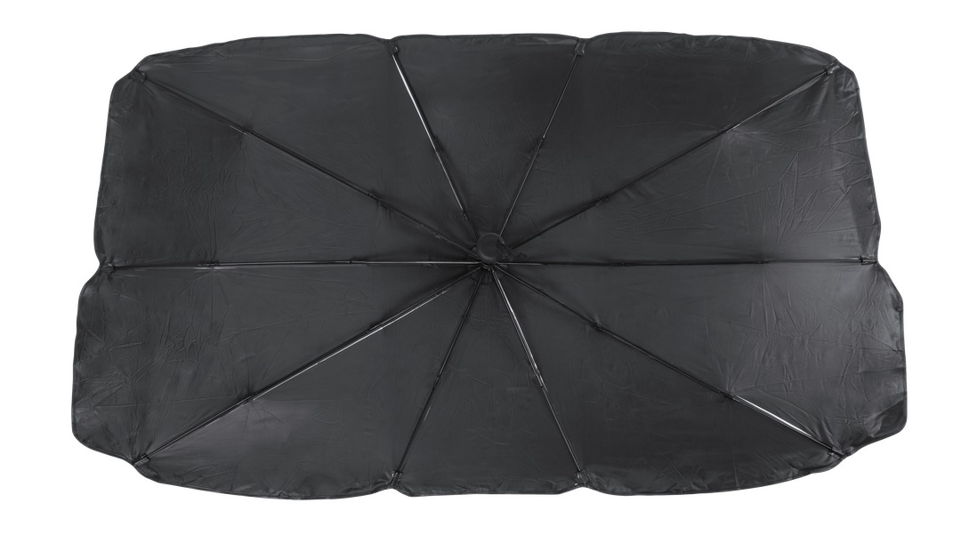 Faltbare Auto-Sonnenschutz. Größe 140 x 78cm. Mit manuellem Öffnungsmechanismus und Polyesterhülle im Lieferumfang.
