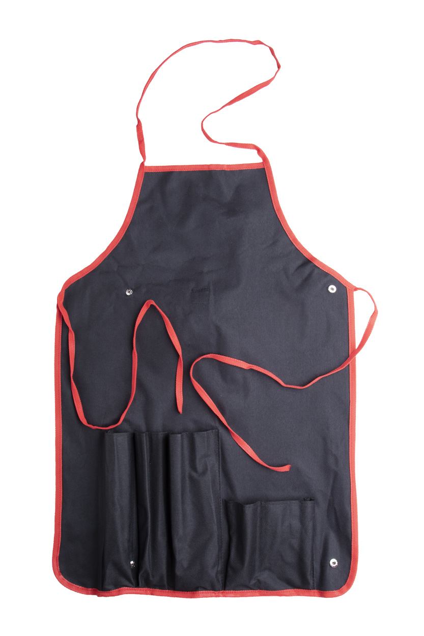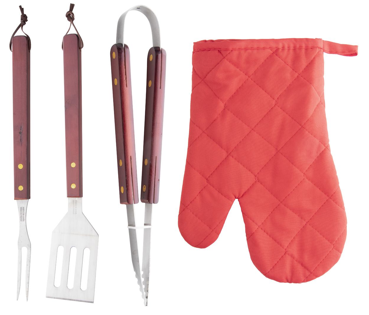 5 teiliges Barbeque-Set mit 3 Teilen aus Edelstahl mit Holzgriff (Fleischgabel, Bratenwender und Grillzange) sowie Handschuh und Schürze aus Polyester.