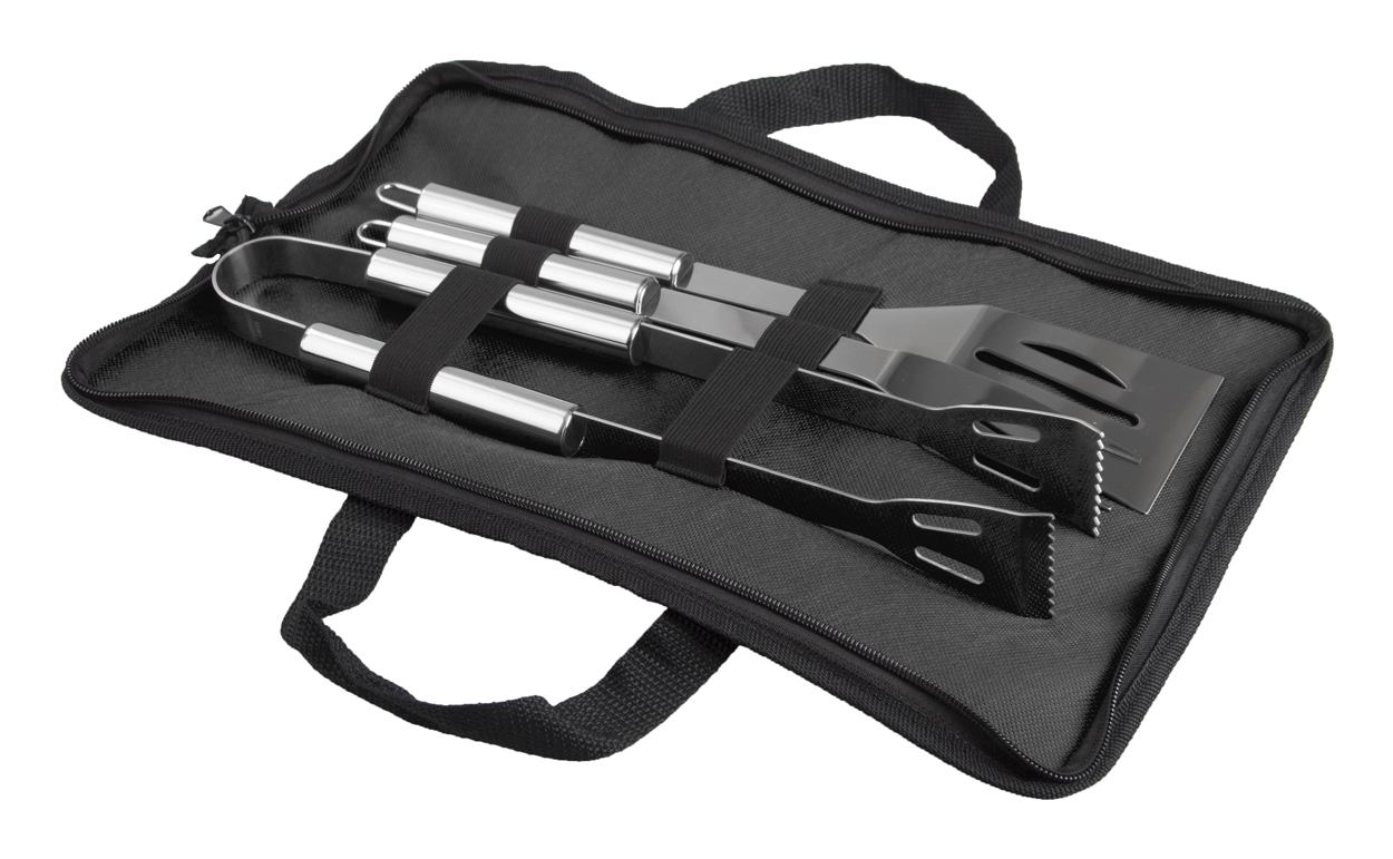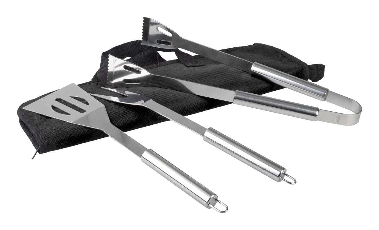 3-teiliges Barbeque-Set aus Edelstahl (Fleischgabel, Bratenwender und Grillzange) in einer Tasche mit Reißverschluss.