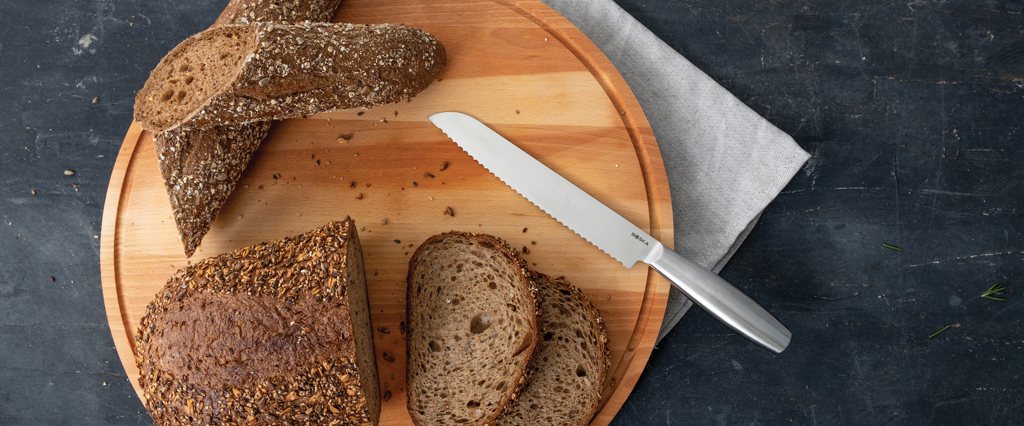 Brancusi Schneidebrett aus Bambus mit Küchenmessern