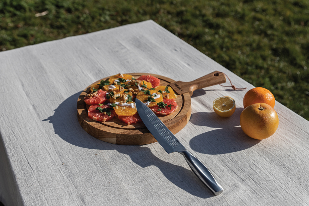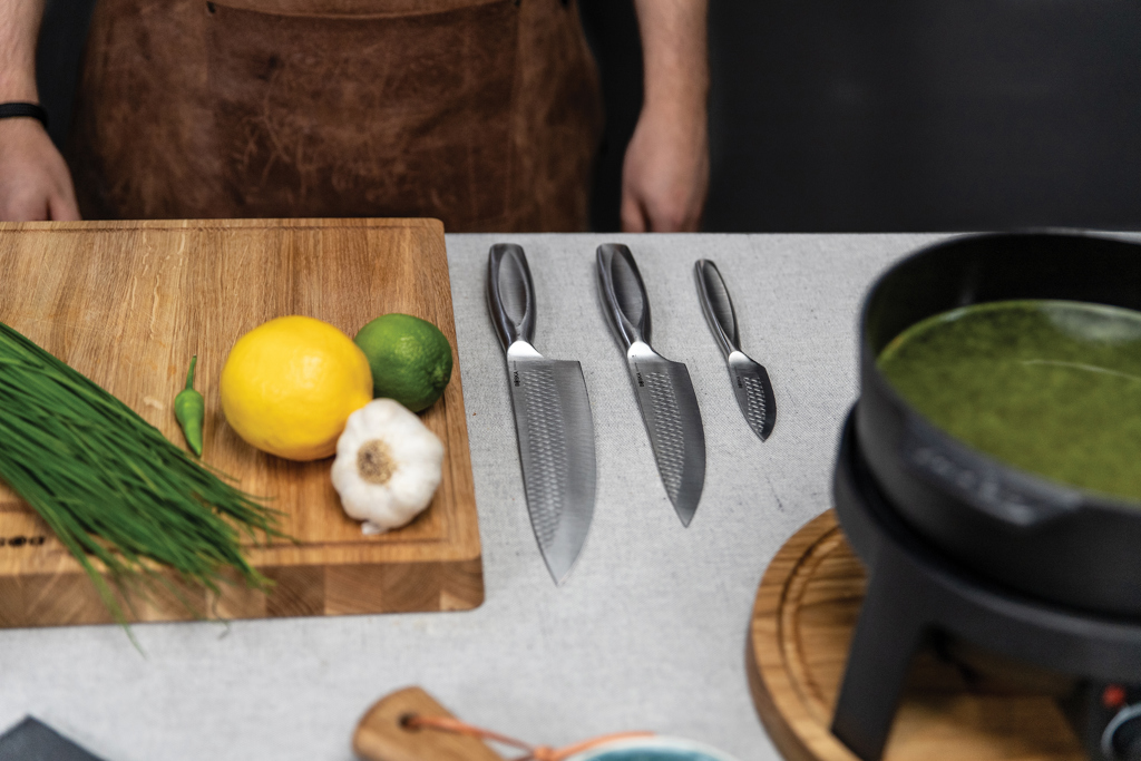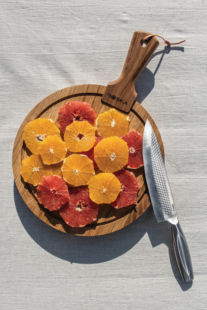 Brancusi Schneidebrett aus Bambus mit Küchenmessern