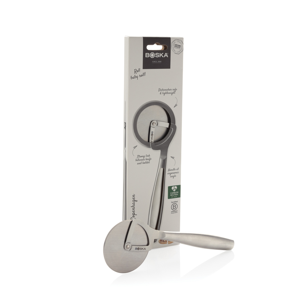 Schneiden Sie Ihre Pizza mit dem Pizzaschneider Copenhagen der Marke BOSKA – einem von B Corporation zertifizierten Unternehmen – in perfekte Stücke. Dieses Pizzarad ist vollständig aus Edelstahl gefertigt und spülmaschinen- und kühlschrankgeeignet. Das Werkzeug ist leicht, aber dennoch sehr robust und wackelt beim Schneiden nicht. Mit einer lebenslangen Garantie – was will man mehr?