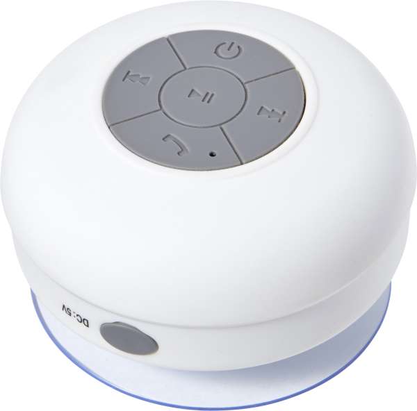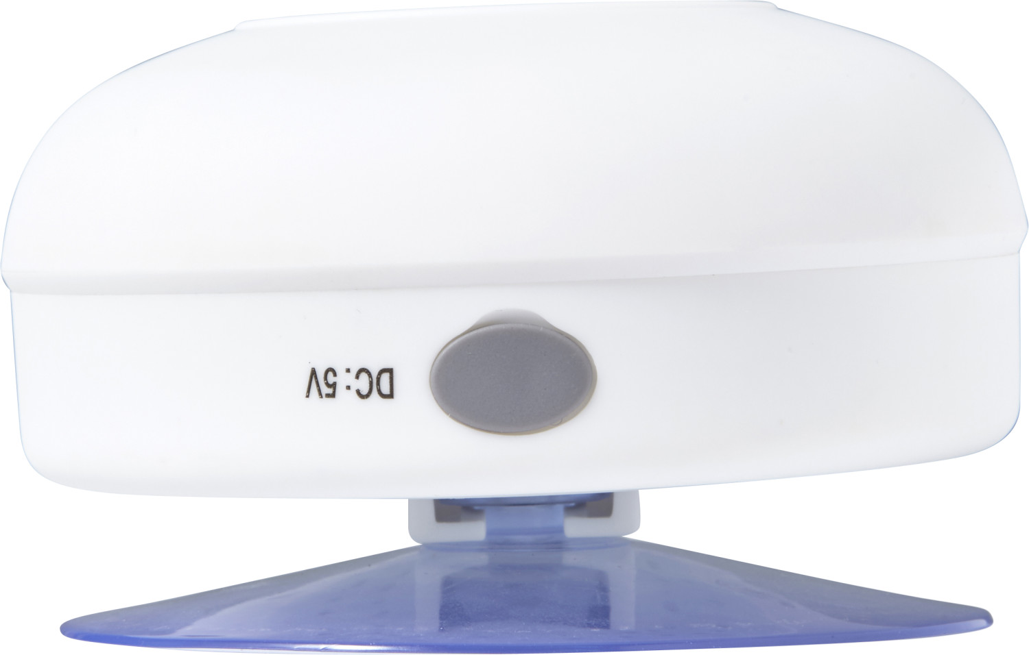 BT / Wireless-Lautsprecher aus Kunststoff, wasserabweisend, Saugnapf zur Befestigung an glatten Oberflächen, inkl. Akku (3,7V Li-ion 400mAh), Output: 3W/5V, Ladezeit: ca. 4,5 Std., Laufzeit: ca. 2 Std.