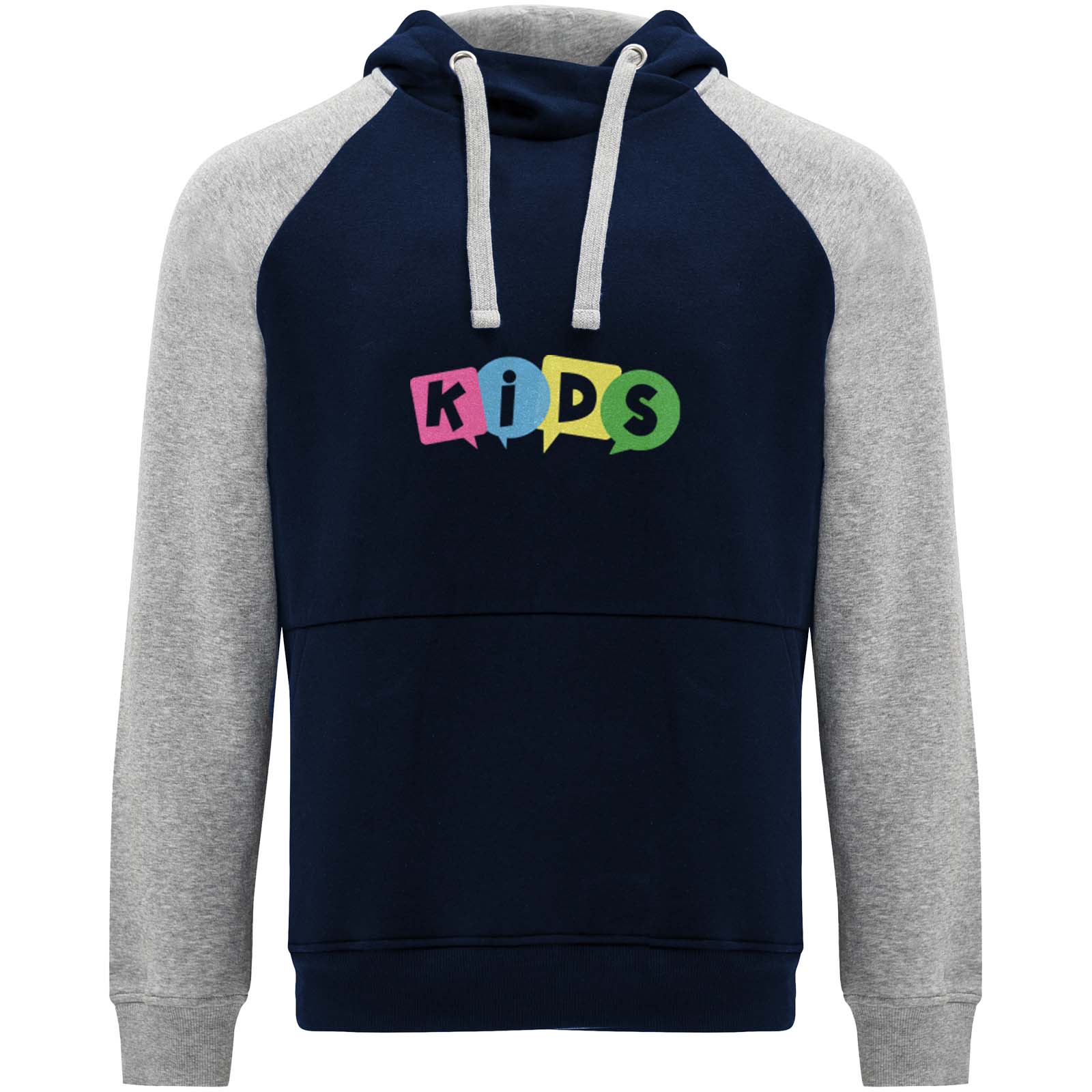 Zweifarbiger Unisex Kapuzenpulli. Kapuze mit gekreuztem Kragen und Metallösen. Innenkapuze, Kordelzug und Raglanärmel in Kontrastfarbe. Kängurutasche. Bündchen und Saum aus elastischem 1×1-Rippstrick. Abnehmbares Etikett.
