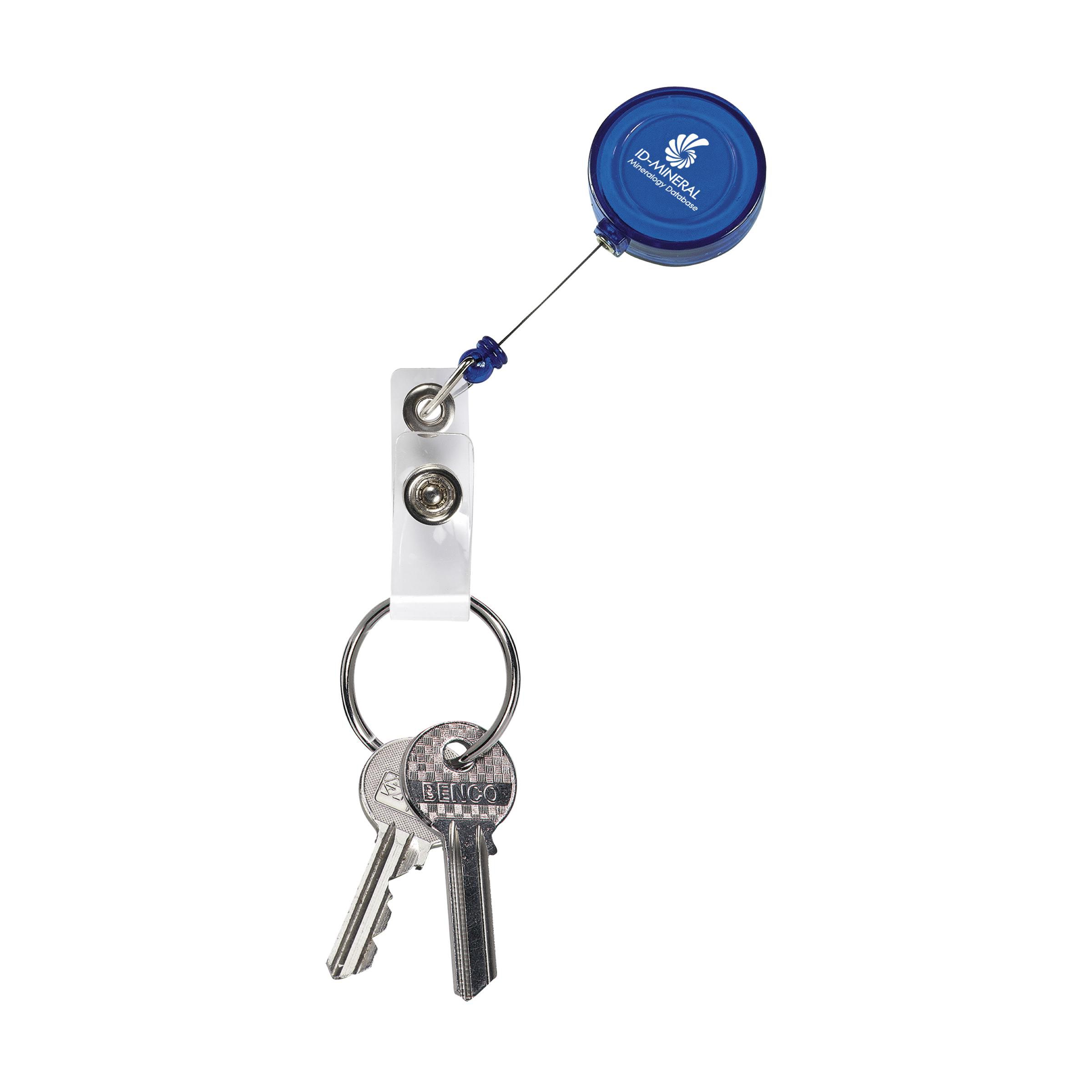 Badgehalter mit metallenem Befestigungsclip, aufrollbarem Nylonband und Badgeclip mit Druckknopf.