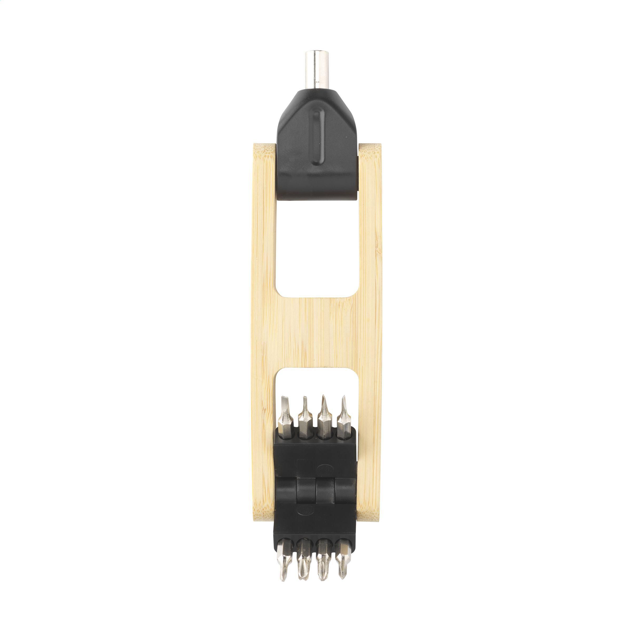 9-teiliges Schraubendreher-Bit-Set mit stabilem Bambushalter. Inklusive magnetischem Bithalter und 8 Tools aus Stahl: 4 Bits für Kreuzschlitzschrauben und 4 Bits für Schlitzschrauben. Ein kompaktes und praktisches Set, das man bequem mitnehmen kann.
