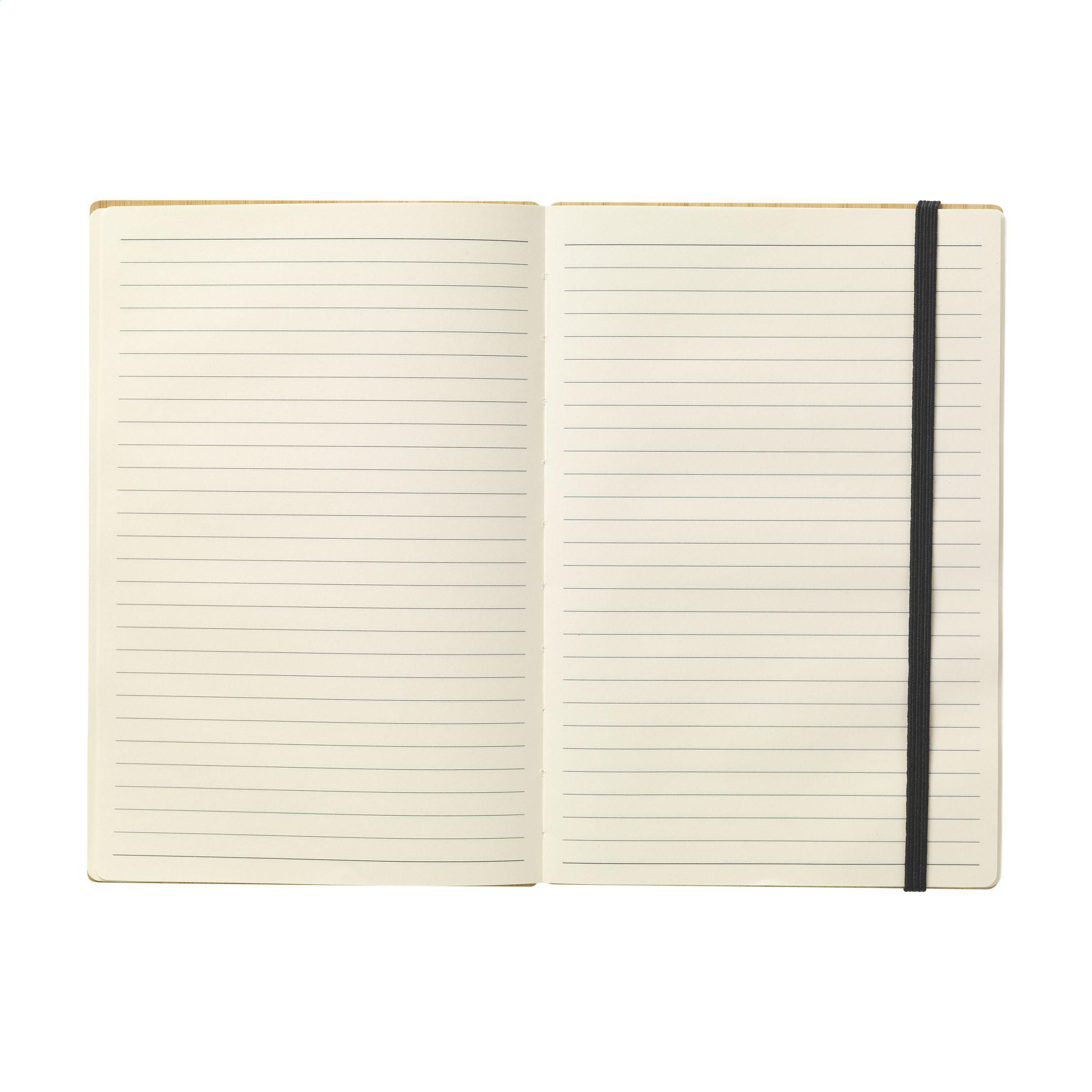 Notizbuch im A5-Format mit stabilem, Hardcover aus FSC 100% zertifiziertem Bambus. Besonders auffallend ist die so genannte „Naked Spine“-Bindung. Diese wurde speziell entwickelt, um das Notizbuch vollständig öffnen und so flach wie möglich hinlegen zu können. So lassen sich Notizen und Skizzen leichter anfertigen. Mit praktischem Verschlussgummi und ca. 96 Blatt/192 Seiten cremefarbenem, liniertem, FSC Mix zertifiziertem Papier (70 g/m²).