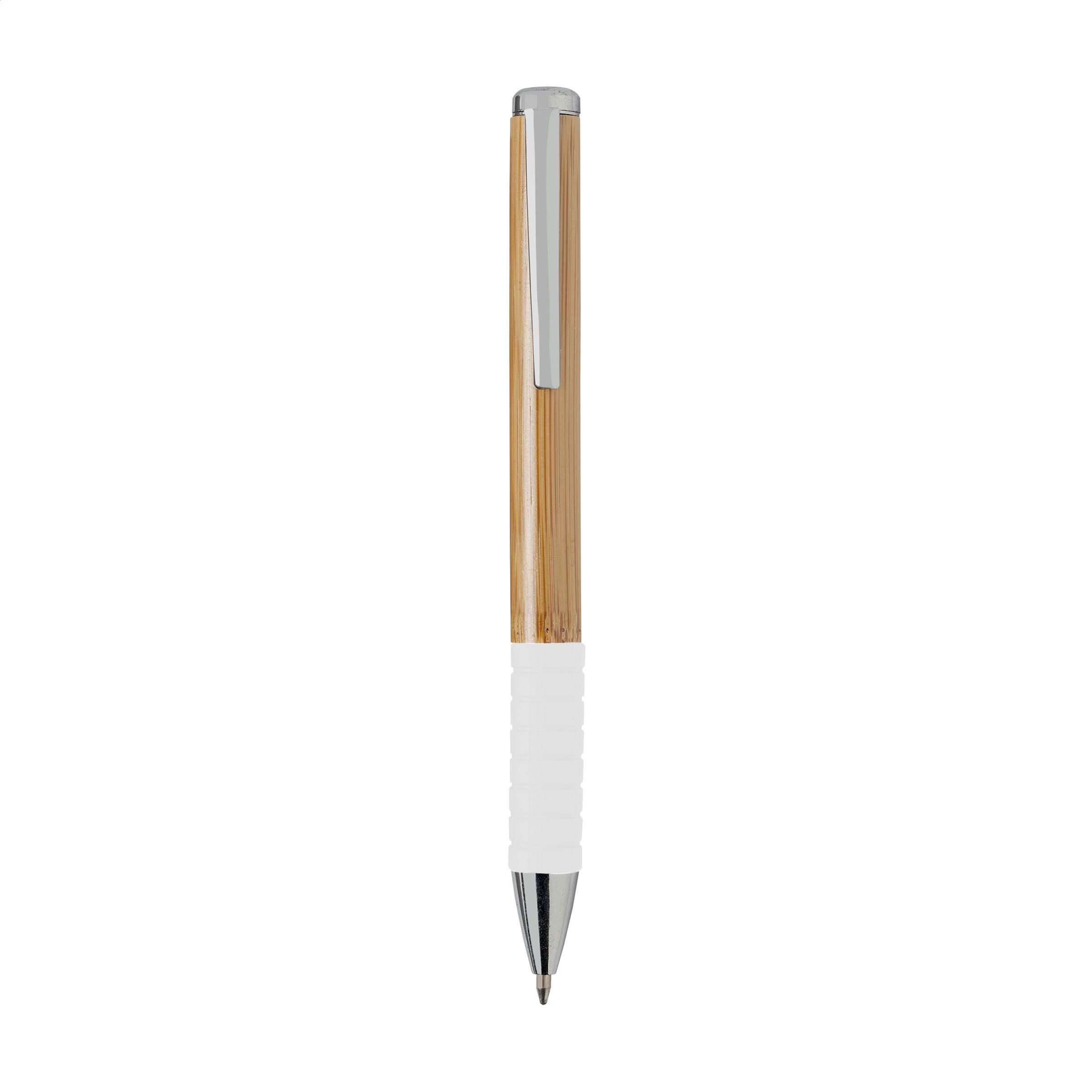 Beschreibung: Blauschreibender Kugelschreiber mit Gehäuse aus Bambus, Metallclip, Dreh-Klicksystem und farbigem, gummiertem, grifffestem Vorderteil.