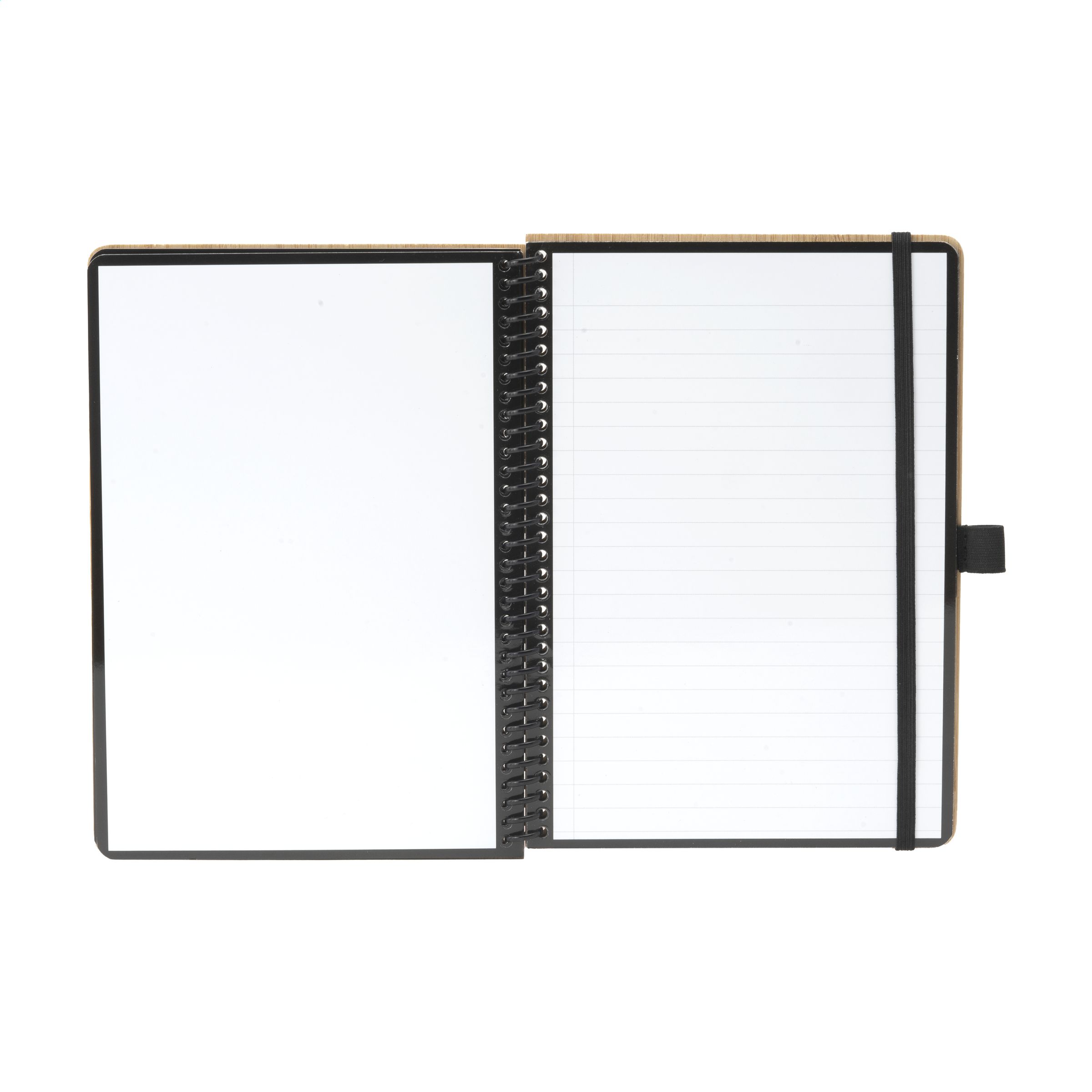 Bambook Classic Hardcover-Notizbuch im A5-Format, das sich ausradieren lässt. Mit stabilem Bambus-Hardcover und 20 Blatt/40 Seiten ausradierbarem, liniertem Papier. Schreiben Sie mit dem Spezialmarker auf die Whiteboard-Seiten, scannen Sie Ihre Notizen mit der Bambook-App und wischen Sie Ihre Seiten zur Wiederverwendung sauber mit einem feuchten Tuch. Mit Wire-O-Bindung, Stiftschlaufe und Verschlussgummi. Inklusive Stift mit Radiergummi. Das Notizbuch ist handgefertigt. Hergestellt in den Niederlanden.