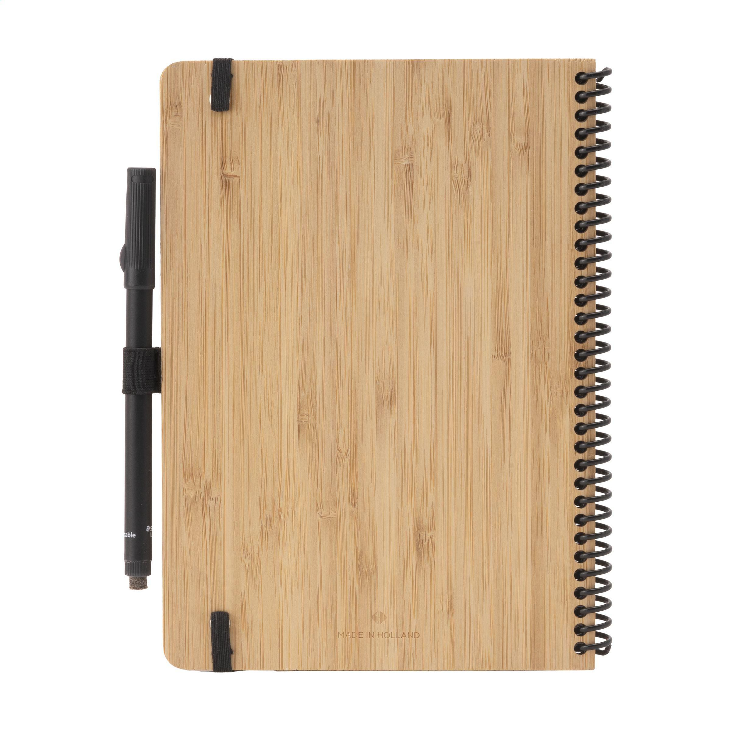Bambook Classic Hardcover-Notizbuch im A5-Format, das sich ausradieren lässt. Mit stabilem Bambus-Hardcover und 20 Blatt/40 Seiten ausradierbarem, liniertem Papier. Schreiben Sie mit dem Spezialmarker auf die Whiteboard-Seiten, scannen Sie Ihre Notizen mit der Bambook-App und wischen Sie Ihre Seiten zur Wiederverwendung sauber mit einem feuchten Tuch. Mit Spiralbindung, Stiftschlaufe und Verschlussgummi. Inklusive Stift mit Radiergummi. Das Notizbuch ist handgefertigt. Hergestellt in den Niederlanden. Bambook ist B-Corp-zertifiziert; die Kollektion wird nach den höchstmöglichen ökologischen und sozialen B-Corp-Standards hergestellt.