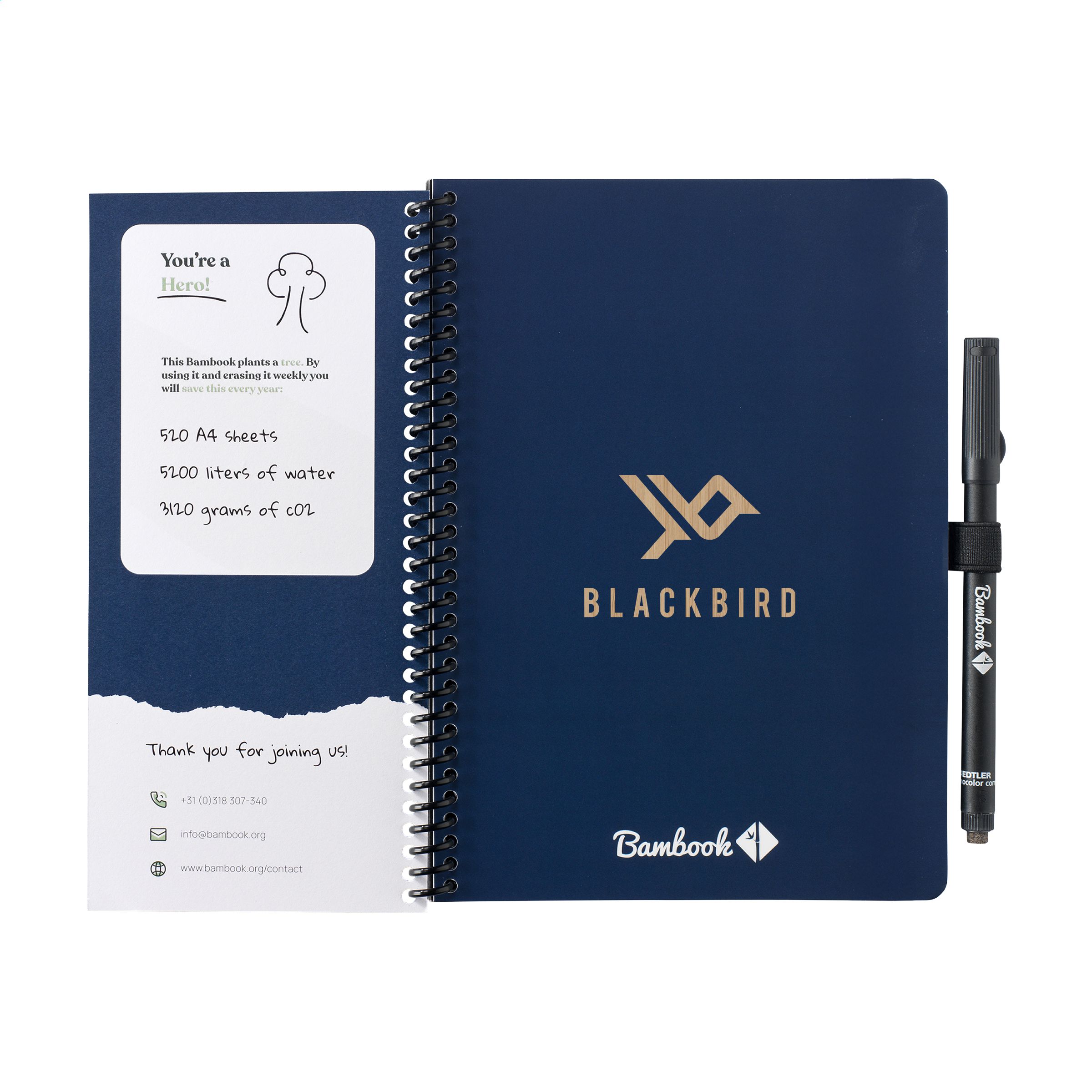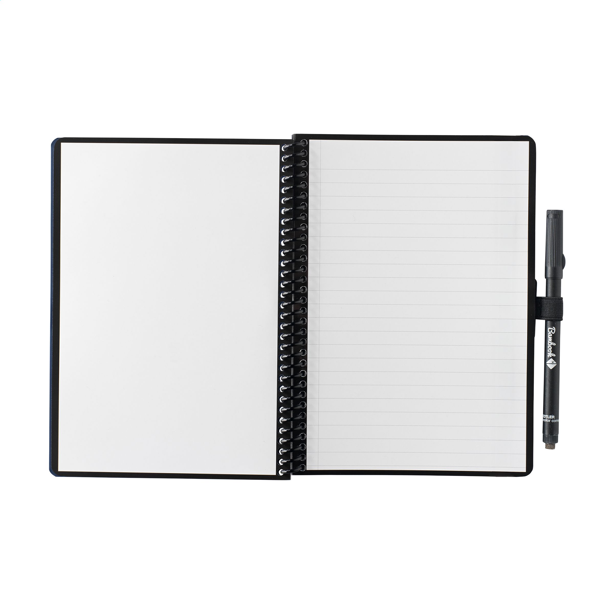 Bambook Classic Original-Notizbuch im A5-Format, das sich ausradieren lässt. Mit stabilem, biegsamem Einband aus FSC-zertifiziertem Karton, der mit einem dezenten Bambusmuster bedruckt ist, und 20 Blatt/40 Seiten ausradierbarem Papier mit Punktraster. Schreiben Sie mit dem Spezialmarker auf die Whiteboard-Seiten, scannen Sie Ihre Notizen mit der Bambook-App und wischen Sie Ihre Seiten zur Wiederverwendung sauber mit einem feuchten Tuch. Mit Wire-O-Bindung und Stiftschlaufe. Inklusive Stift mit Radiergummi. Das Notizbuch ist handgefertigt. Hergestellt in den Niederlanden.