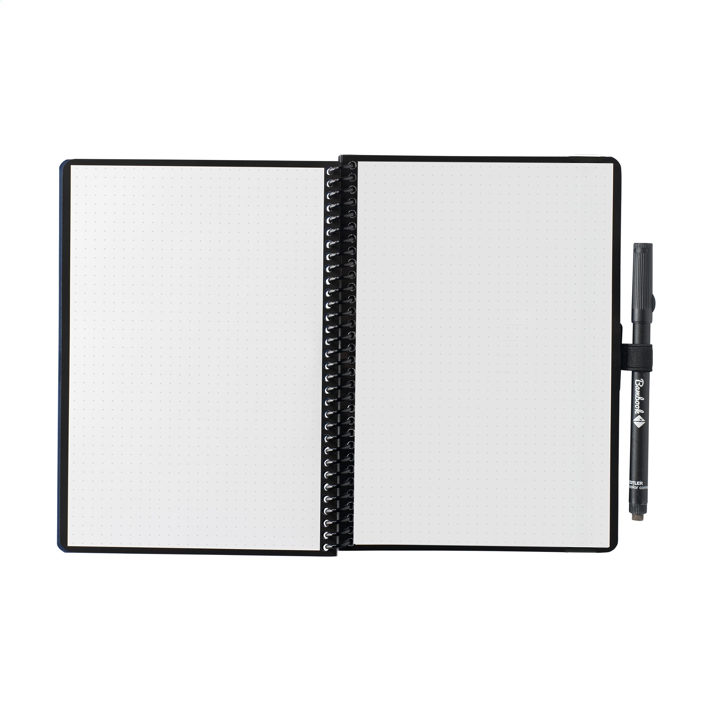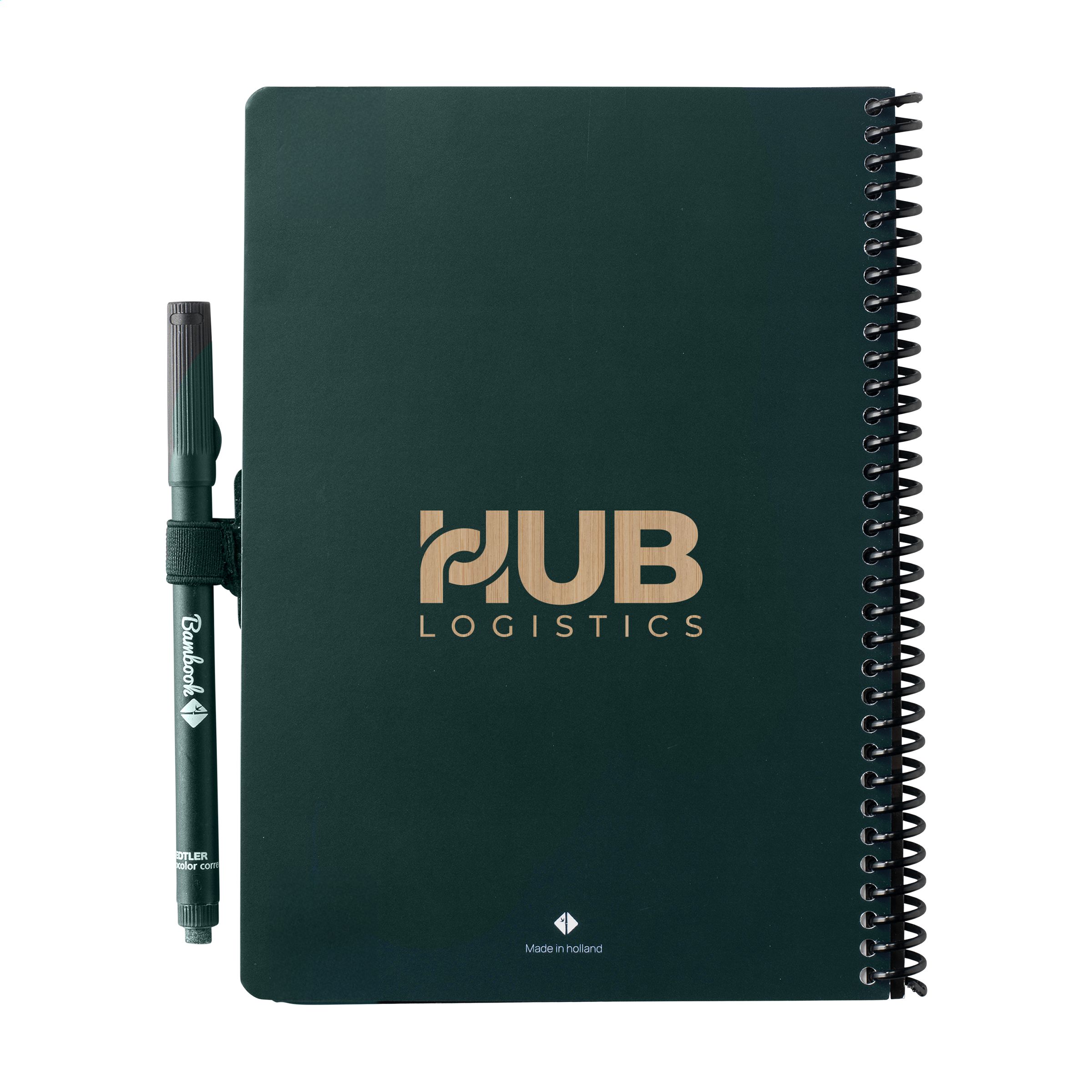 Bambook Classic Original-Notizbuch im A5-Format, das sich ausradieren lässt. Mit stabilem, biegsamem Einband aus FSC-zertifiziertem Karton, der mit einem dezenten Bambusmuster bedruckt ist, und 20 Blatt/40 Seiten ausradierbarem Papier mit Punktraster. Schreiben Sie mit dem Spezialmarker auf die Whiteboard-Seiten, scannen Sie Ihre Notizen mit der Bambook-App und wischen Sie Ihre Seiten zur Wiederverwendung sauber mit einem feuchten Tuch. Mit Wire-O-Bindung und Stiftschlaufe. Inklusive Stift mit Radiergummi. Das Notizbuch ist handgefertigt. Hergestellt in den Niederlanden.