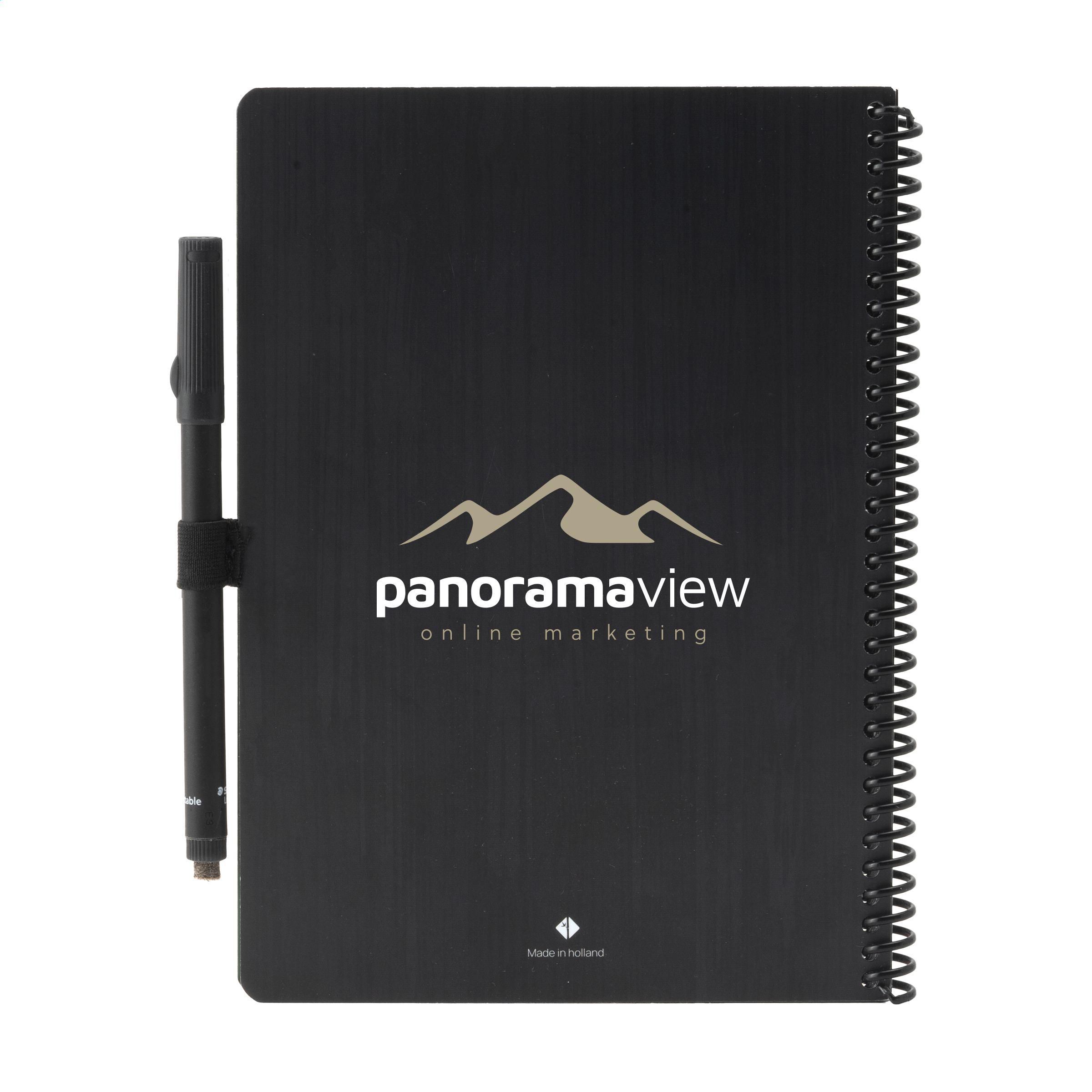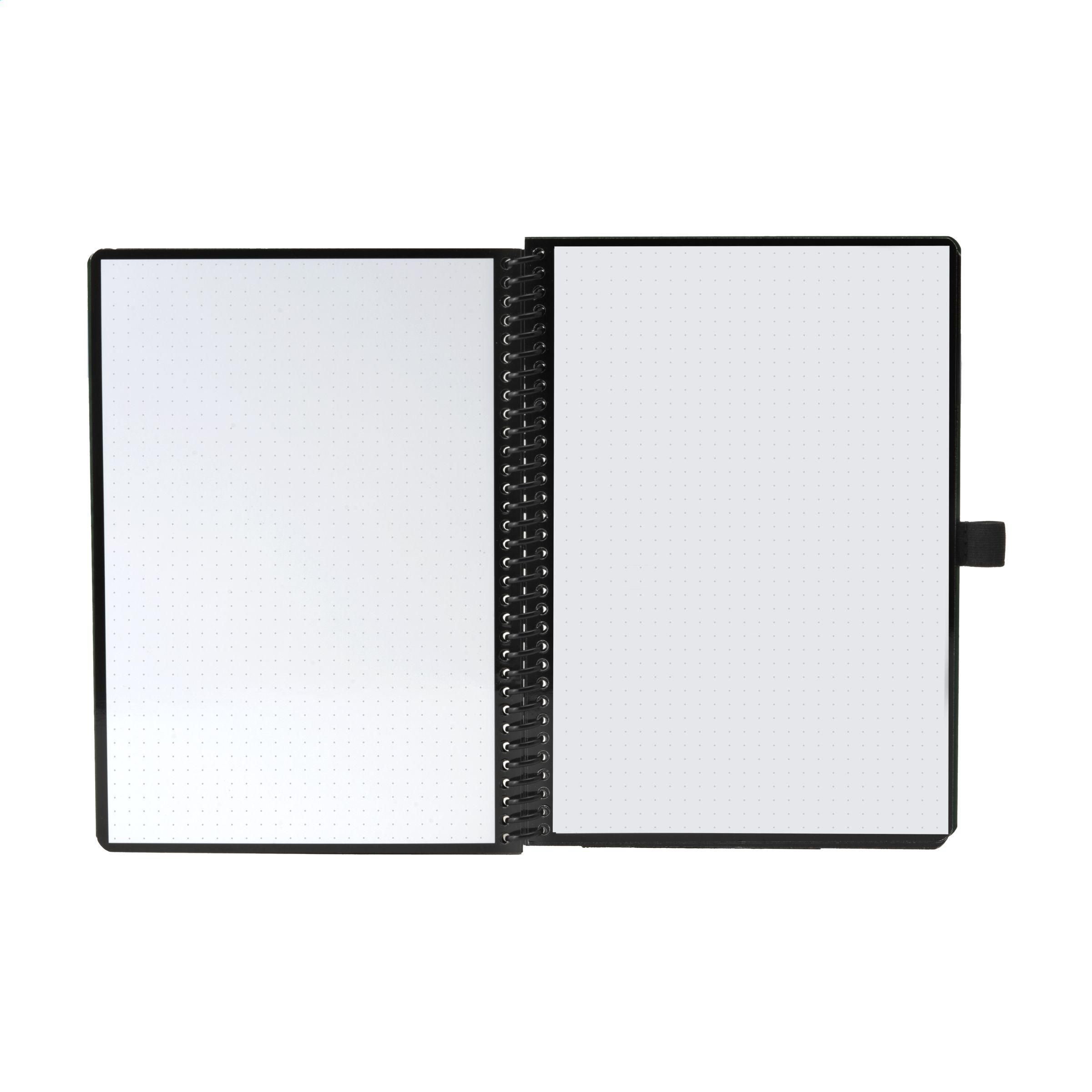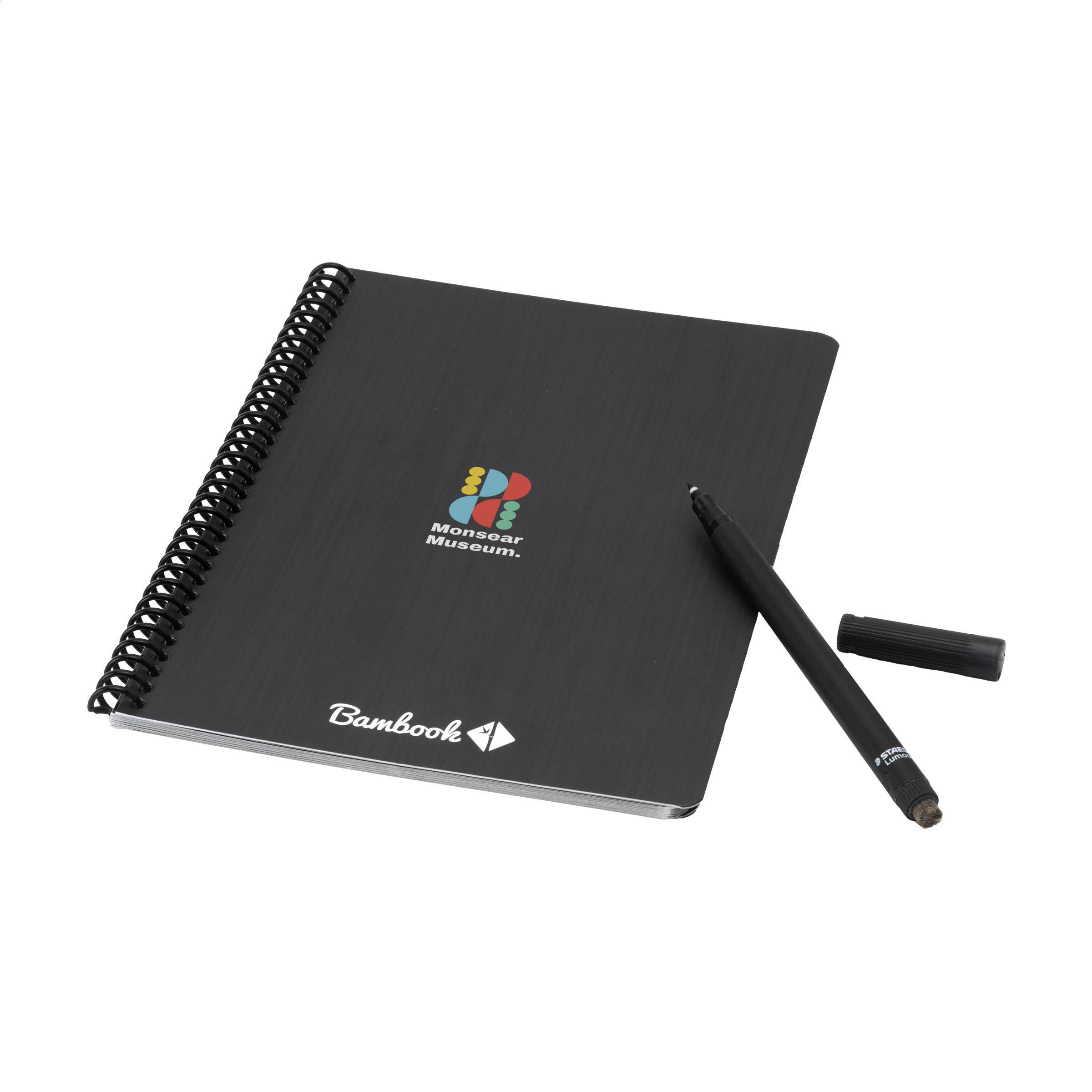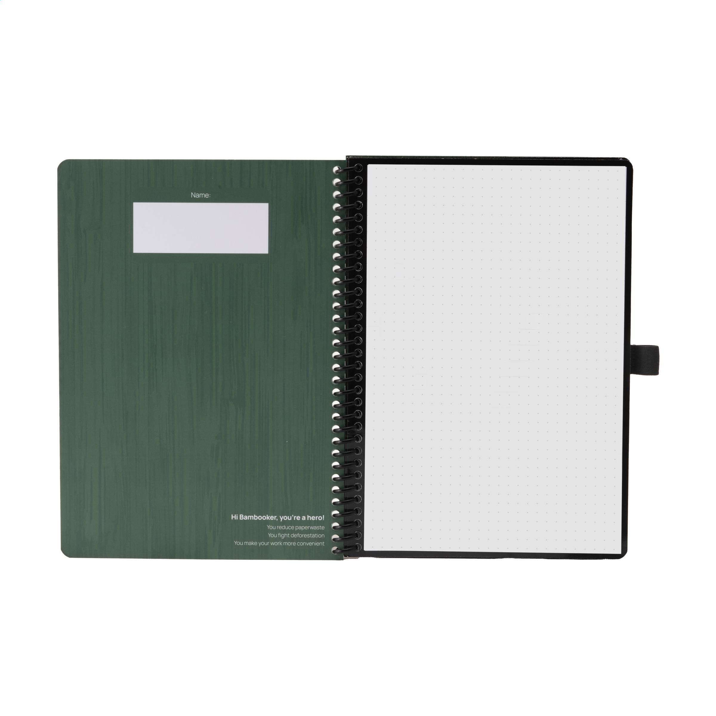Bambook Classic Original-Notizbuch im A5-Format, das sich ausradieren lässt. Mit stabilem, biegsamem Einband aus FSC-zertifiziertem Karton, der mit einem dezenten Bambusmuster bedruckt ist, und 20 Blatt/40 Seiten ausradierbarem Papier mit Punktraster. Schreiben Sie mit dem Spezialmarker auf die Whiteboard-Seiten, scannen Sie Ihre Notizen mit der Bambook-App und wischen Sie Ihre Seiten zur Wiederverwendung sauber mit einem feuchten Tuch. Mit Spiralbindung und Stiftschlaufe. Inklusive Stift mit Radiergummi. Das Notizbuch ist handgefertigt. Hergestellt in den Niederlanden. Bambook ist B-Corp-zertifiziert; die Kollektion wird nach den höchstmöglichen ökologischen und sozialen B-Corp-Standards hergestellt.