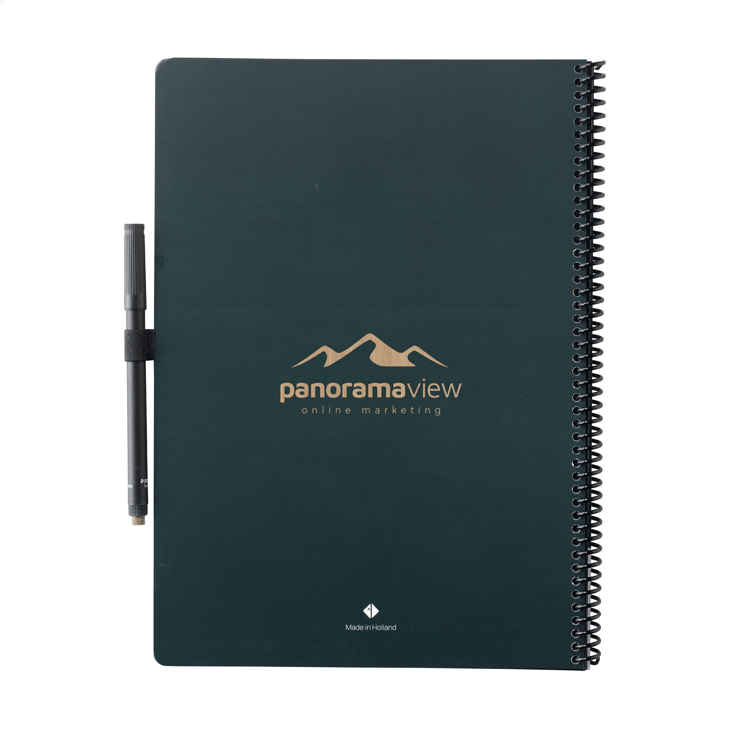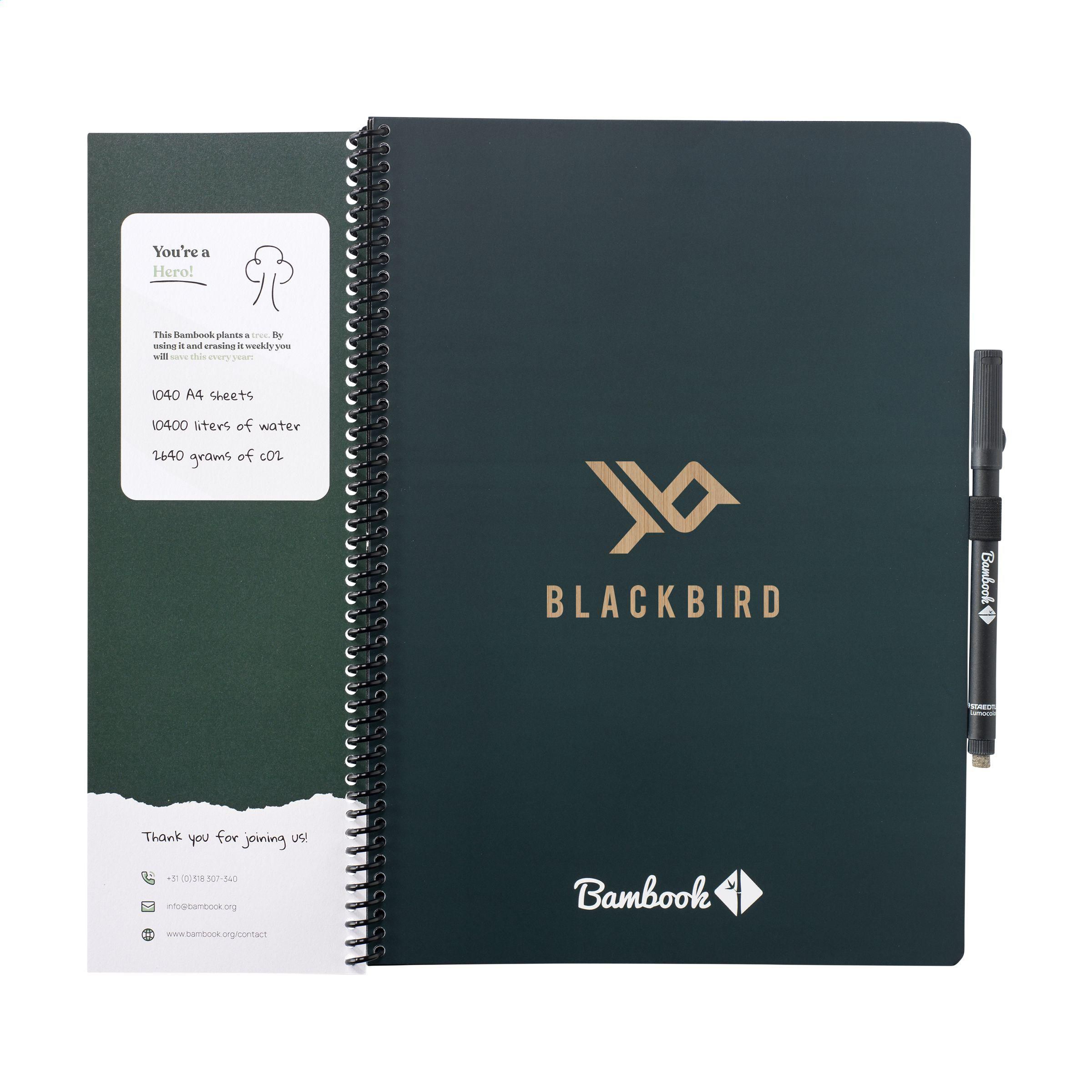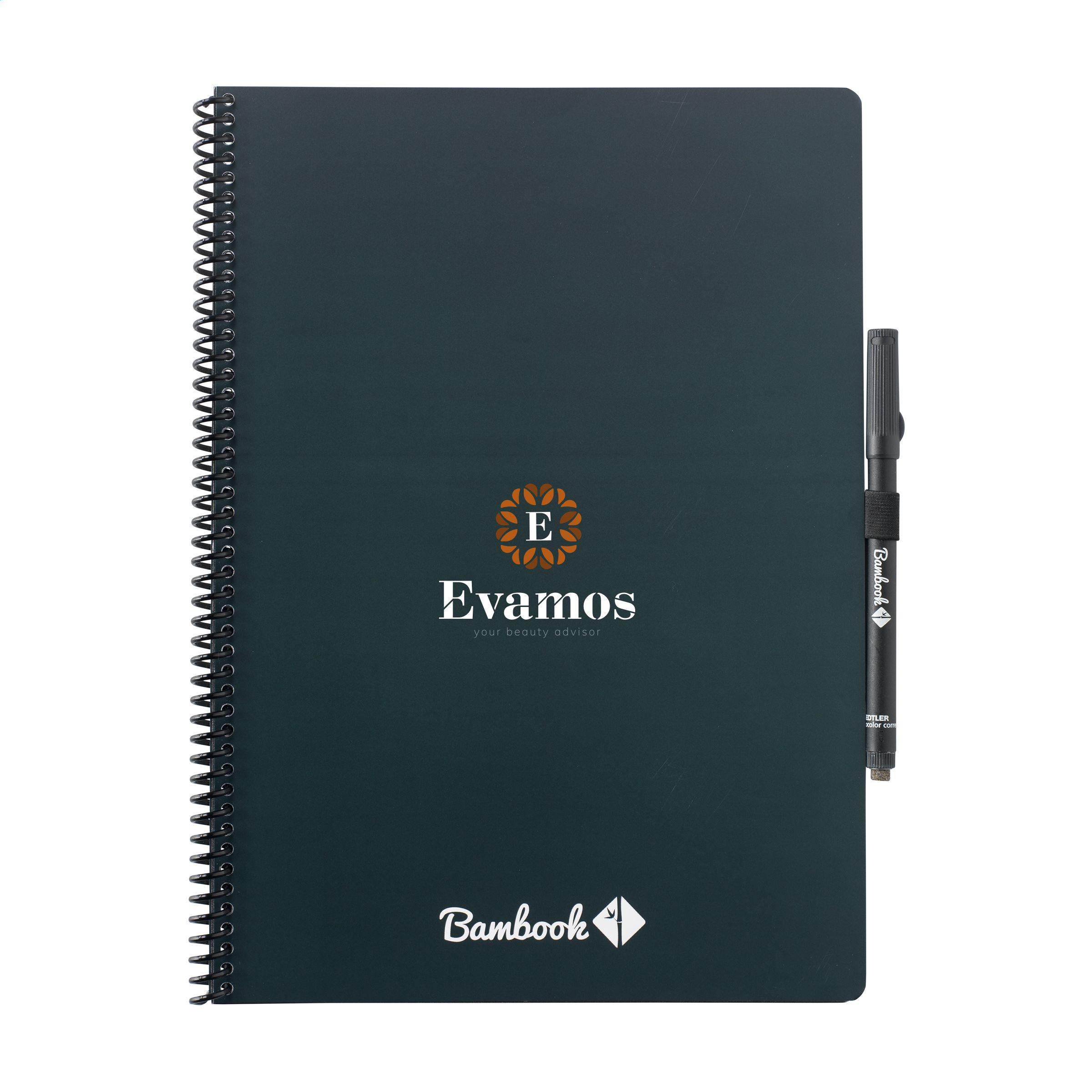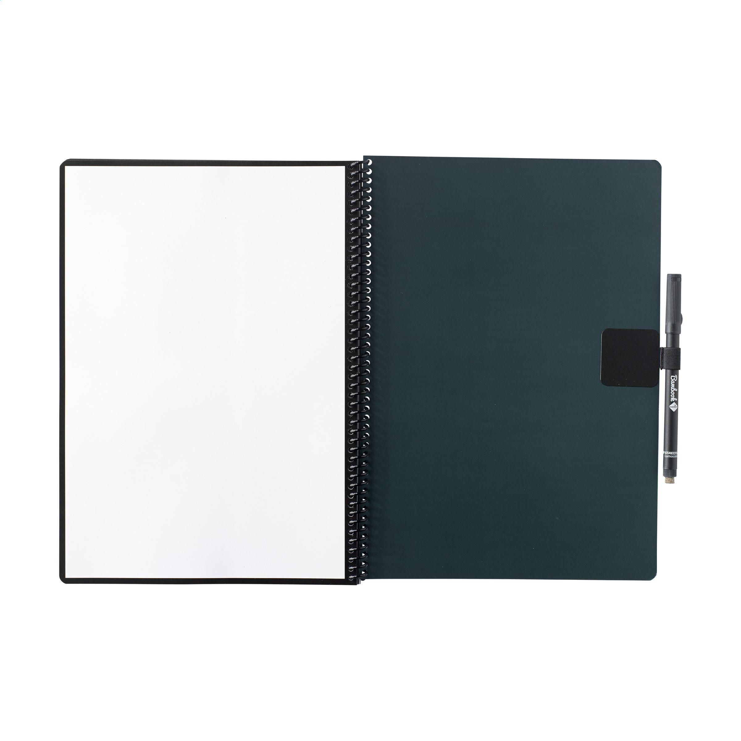 Bambook Classic Original-Notizbuch im A4-Format, das sich ausradieren lässt. Mit stabilem, biegsamem Einband aus FSC-zertifiziertem Karton, der mit einem dezenten Bambusmuster bedruckt ist, und 20 Blatt/40 Seiten ausradierbarem, liniertem Papier. Schreiben Sie mit dem Spezialmarker auf die Whiteboard-Seiten, scannen Sie Ihre Notizen mit der Bambook-App und wischen Sie Ihre Seiten zur Wiederverwendung sauber mit einem feuchten Tuch. Mit Spiralbindung und Stiftschlaufe. Inklusive Stift mit Radiergummi. Das Notizbuch ist handgefertigt. Hergestellt in den Niederlanden. Bambook ist B-Corp-zertifiziert; die Kollektion wird nach den höchstmöglichen ökologischen und sozialen B-Corp-Standards hergestellt.