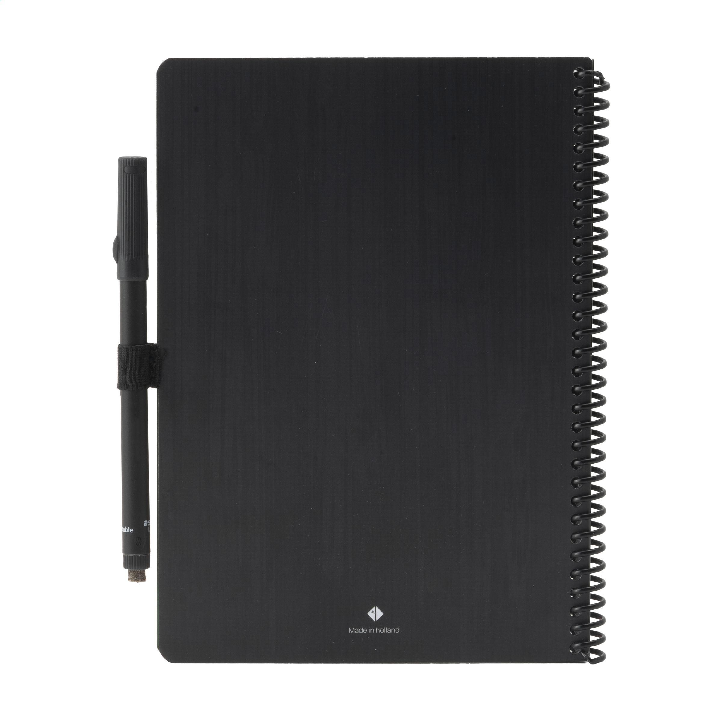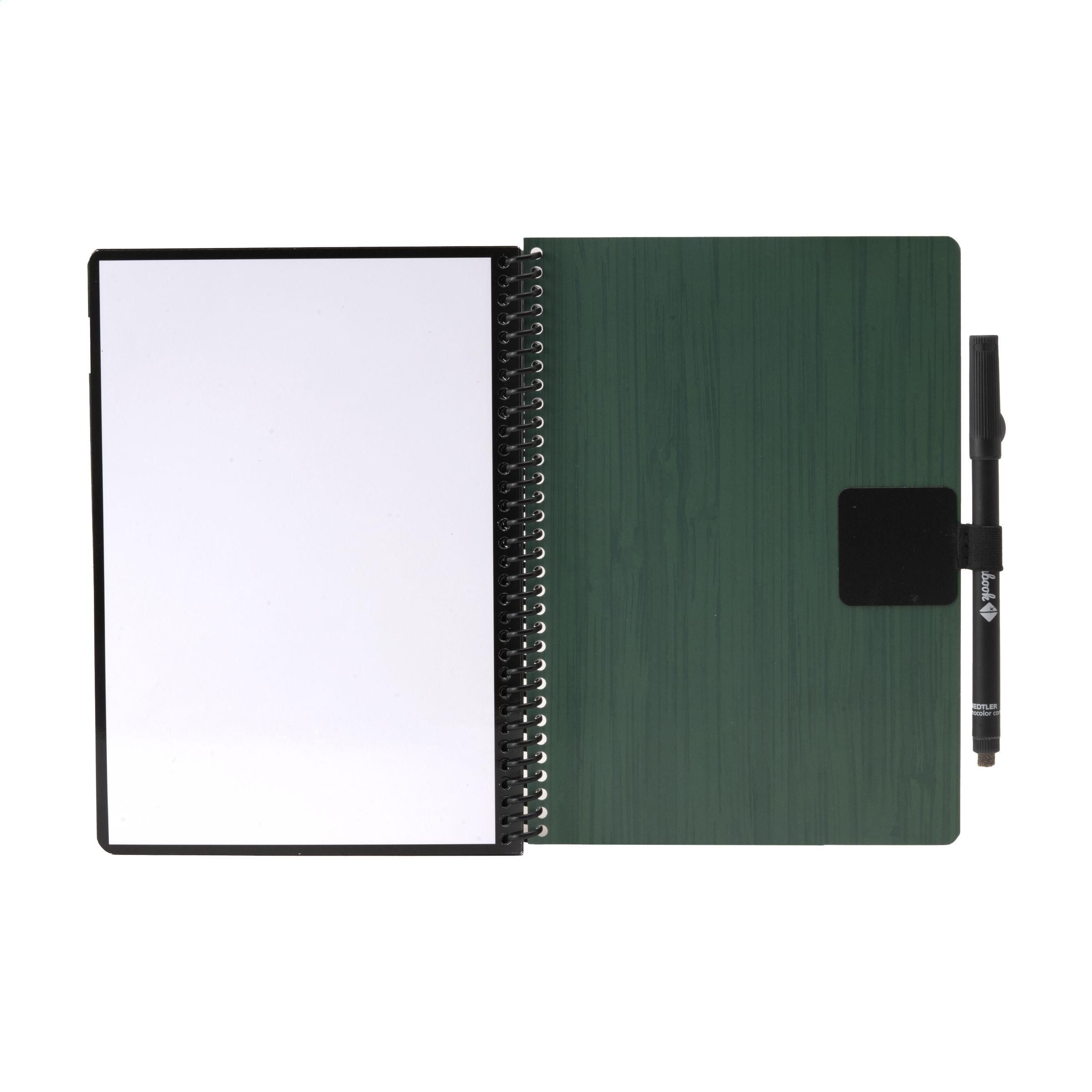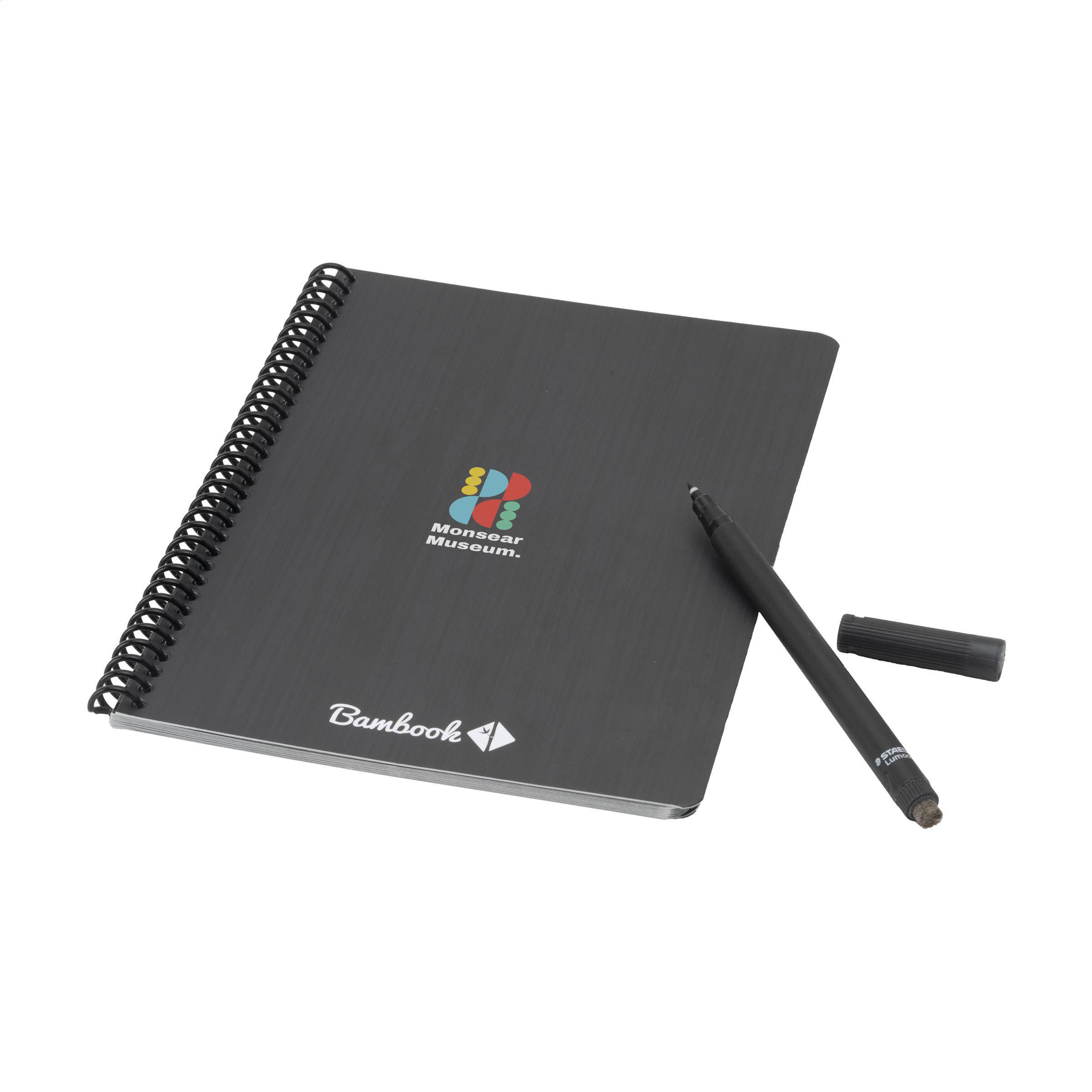 Bambook Classic Original-Notizbuch im A5-Format, das sich ausradieren lässt. Mit stabilem, biegsamem Einband aus FSC-zertifiziertem Karton, der mit einem dezenten Bambusmuster bedruckt ist, und 20 Blatt/40 Seiten ausradierbarem, liniertem Papier. Schreiben Sie mit dem Spezialmarker auf die Whiteboard-Seiten, scannen Sie Ihre Notizen mit der Bambook-App und wischen Sie Ihre Seiten zur Wiederverwendung sauber mit einem feuchten Tuch. Mit Spiralbindung und Stiftschlaufe. Inklusive Stift mit Radiergummi. Das Notizbuch ist handgefertigt. Hergestellt in den Niederlanden. Bambook ist B-Corp-zertifiziert; die Kollektion wird nach den höchstmöglichen ökologischen und sozialen B-Corp-Standards hergestellt.