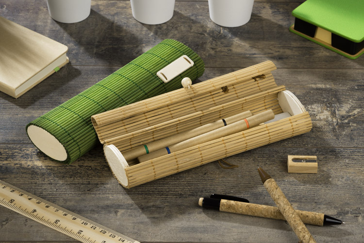 Die Bambus-Federtasche mit umweltfreundlichen Utensilien beinhaltet zwei beidseitige Kugelschreiber (rot, blau, grün und schwarz), zwei Bleistifte, Lineal, Anspitzer, Radiergummi und selbstklebende Zettel. Dahinter steht Umweltschutz, schönes Aussehen und praktischer Gebrauch in einem Produkt.
