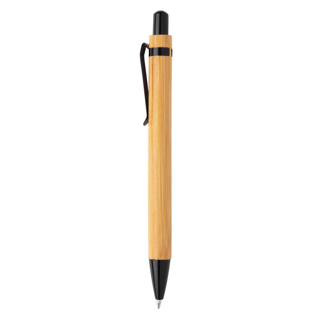 Schwarzschreibender Kugelschreiber mit Schaft aus Bambusholz mit Metall-Clip.
