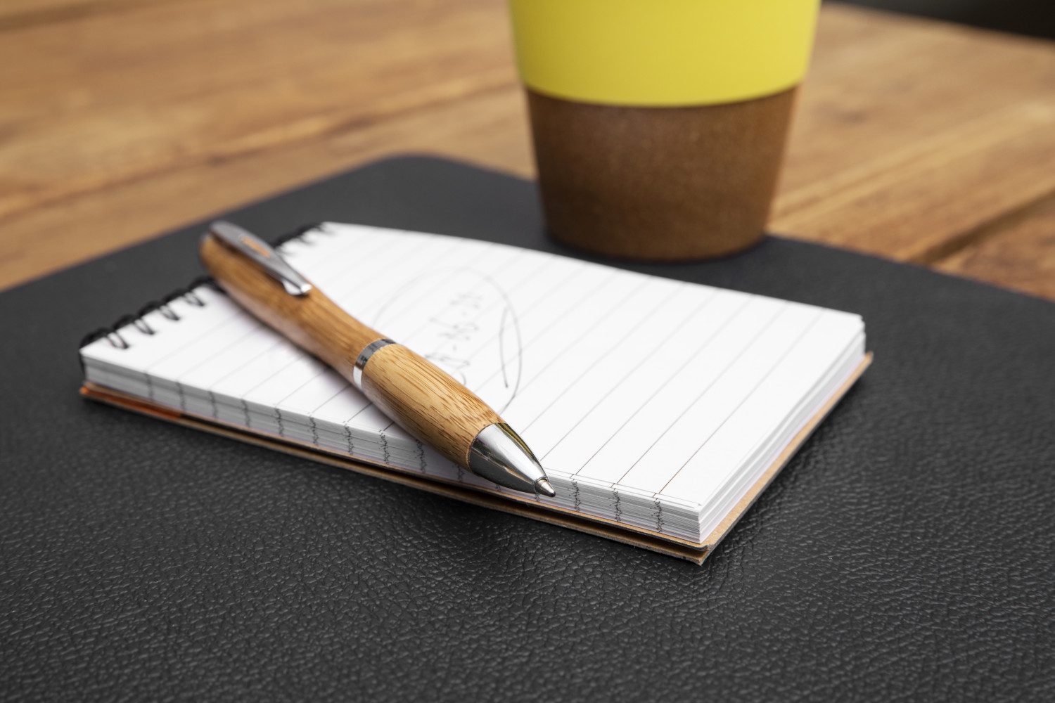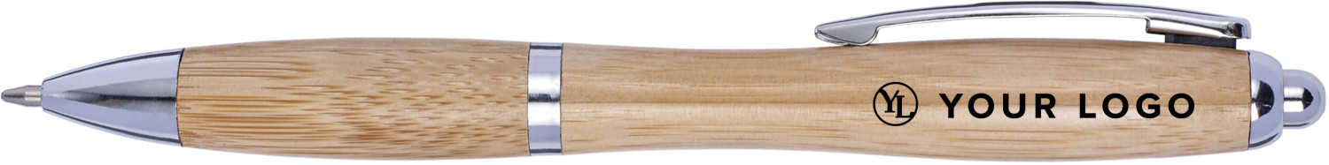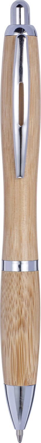 Kugelschreiber 'Bali' aus Bambus mit silberfarbener Spitze, Clip, Ring und Stiftende. Minenfarbe: Schwarz.