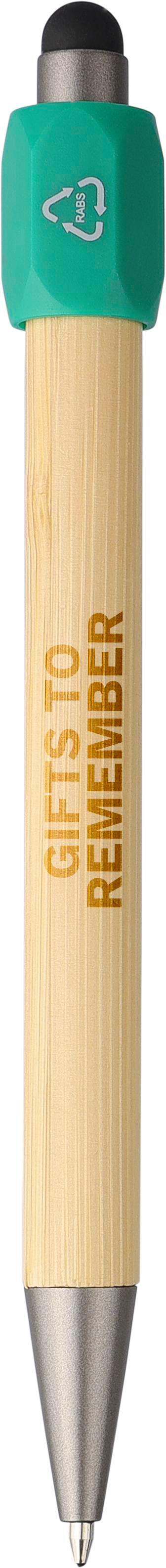 Kugelschreiber aus Bambus mit Drehmechanik aus recyceltem ABS und schwarzer Stiftspitze am Drücker. Ausgestattet mit Druckmechanik, 1,0 mm Mine und blauer Tinte mit einer Strichlänge von ca. 800 m. Mit Reycling-Logo.