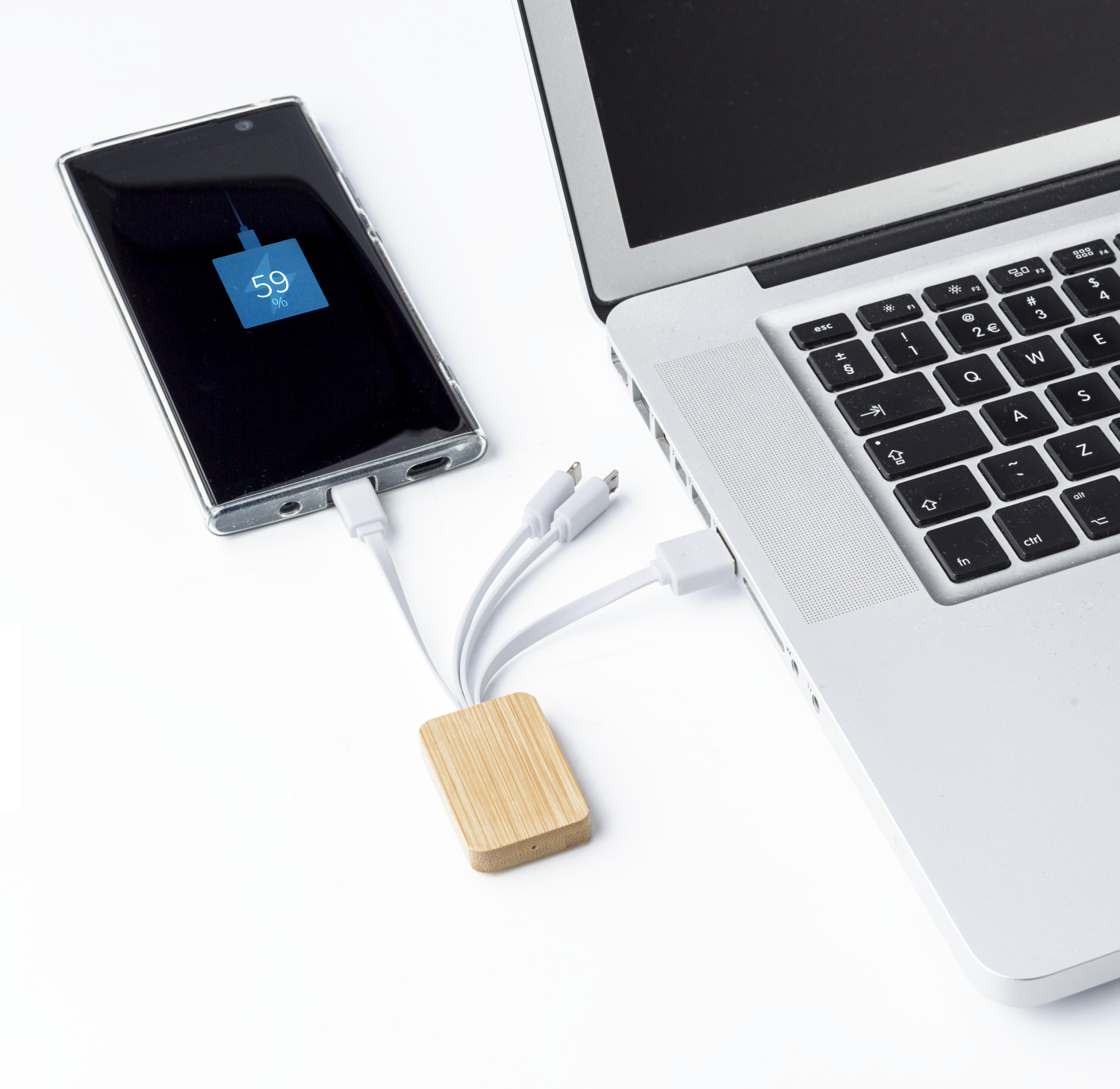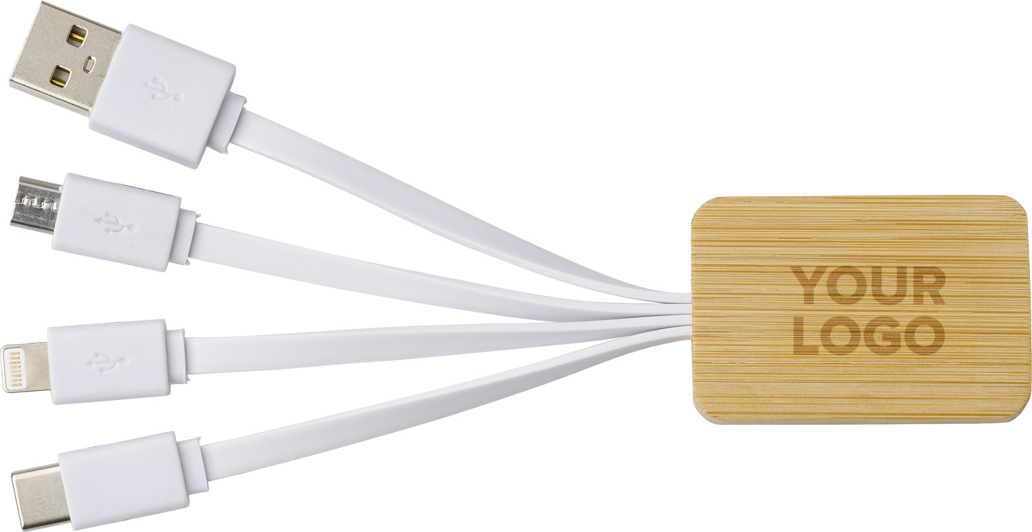 Bambus Drei-in-Eins-Ladekabel mit Standard-USB-, Micro-USB-, USB-C- und Lightning-Stecker. Dieses Ladegerät ist nur für Laptops / Handys geeignet und funktioniert nicht mit einem Ladeadapter.