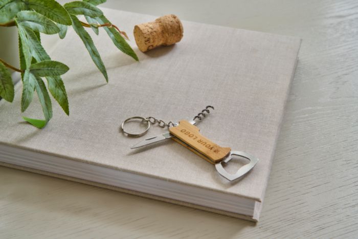 Bambus-Multitool mit 3 Funktionen, einschließlich eines Schlüsselrings aus Metall. Das Multitool beinhaltet einen Flaschenöffner, ein Taschenmesser und einen Korkenzieher. Einzeln verpackt in einer braunen Pappschachtel.