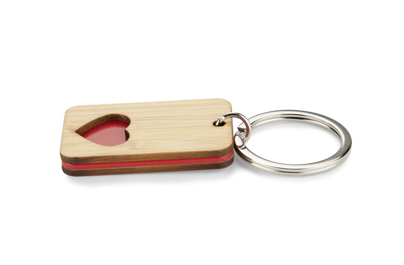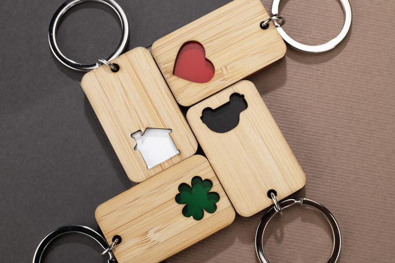 CARVE ist ein Bambus-Schlüsselanhänger mit einem präzise geschnittenen, bunten Motiv (Haus, Auto, Herz oder Klee) - jede Farbe entspricht einem anderen Symbol. Ästhetisch ansprechend und langlebig, eignet er sich perfekt als Werbeartikel mit Platz für ein Branding.