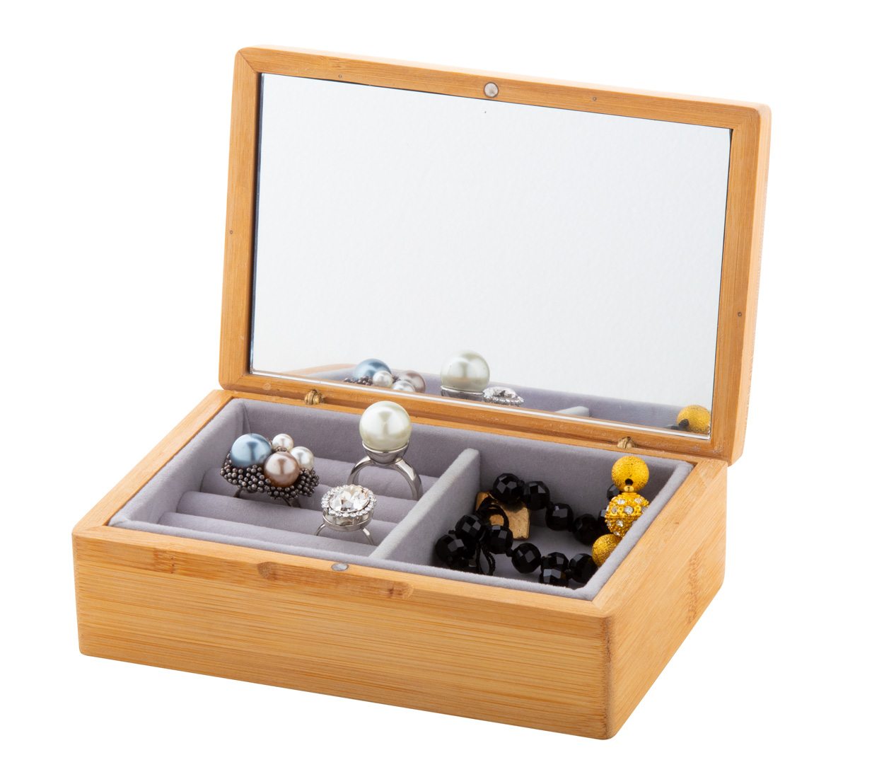 Schmuckkästchen aus Bambus mit Samtpolsterung innen und Spiegel im Deckel.
