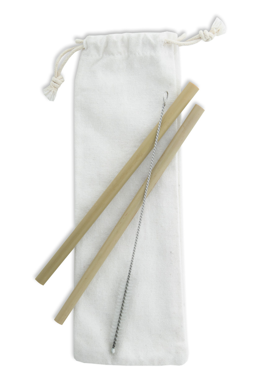 Set aus 2 wiederverwendbaren Trinkhalmen aus natürlichem Bambus mit Reinigungsbürste. Das Set ist verpackt in einen Baumwollbeutel. Der Durchmesser und die Oberfläche der Halme können variiren.