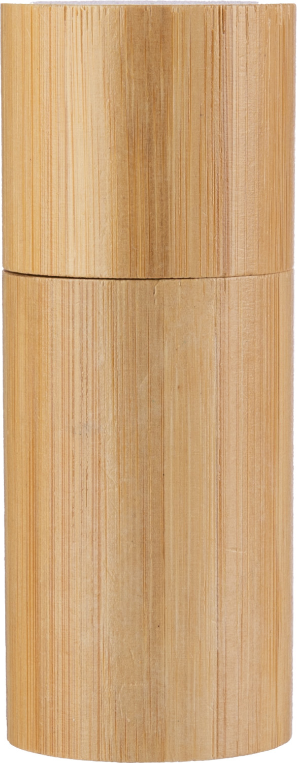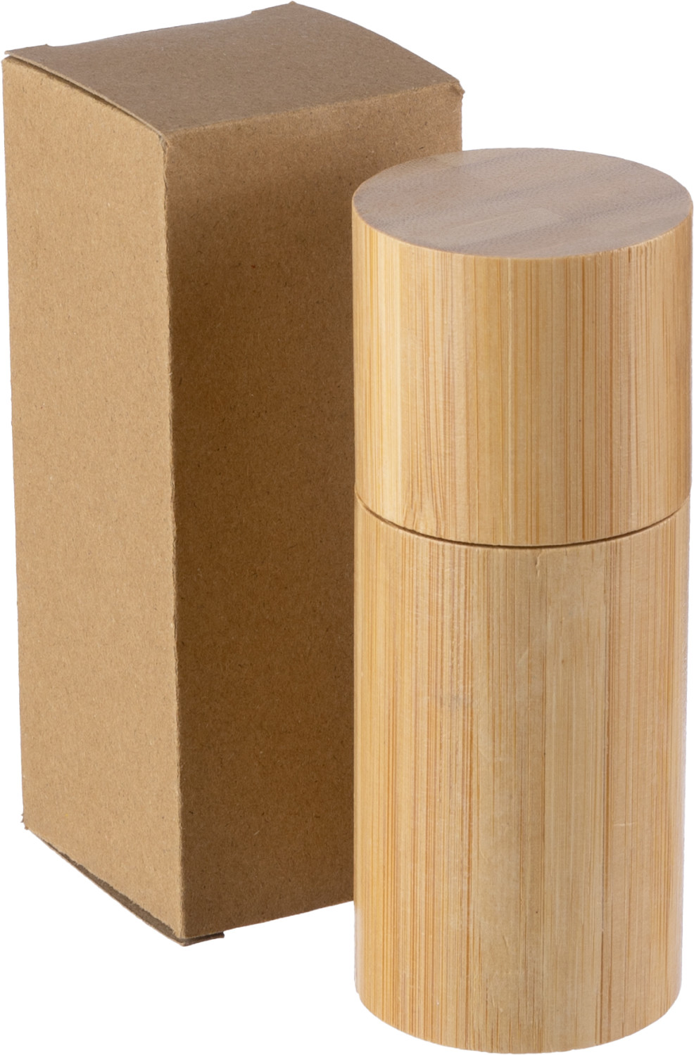 Bambusgewürzmühle mit Keramikmühle. Einzeln verpackt in einer Kraftpapierschachtel.