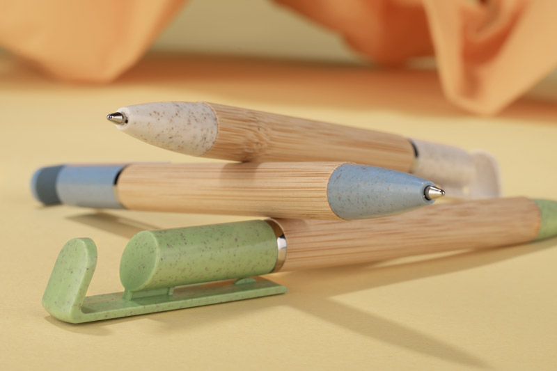 Der FONIK-Stift mit Bambusgehäuse und Clip aus Weizenstroh ist ein praktisches Gadget, das auch als Telefonständer dient.