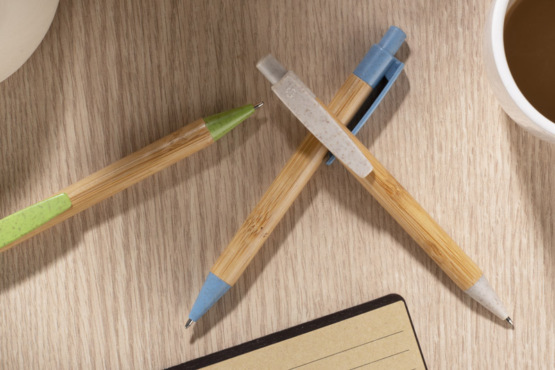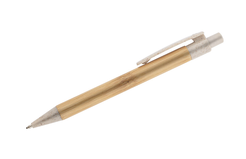 BAMMO ist ein klassischer Stift aus umweltfreundlichen Materialien. Der Bambuskörper wurde mit Elementen aus Kunststoff mit 50% Beimischung von Stroh kombiniert. Automatischer Kugelschreiber, blauschreibend.