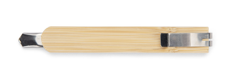 Das technische Messer BAMU in einem eleganten Bambusrahmen ist ein vielseitiges Werkzeug, das in vielen Situationen eingesetzt werden kann. Dank seiner segmentierten Konstruktion kann der abgenutzte Teil der Klinge leicht abgebrochen werden, was eine lange Nutzungsdauer gewährleistet. Die Personalisierung in Form eines Logos oder Werbeslogans macht es nicht nur zu einem praktischen Werkzeug, sondern auch zu einem wirksamen Werbeträger.