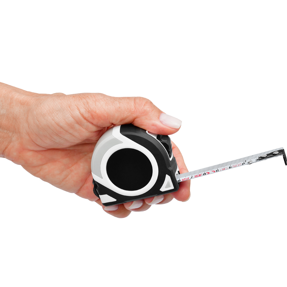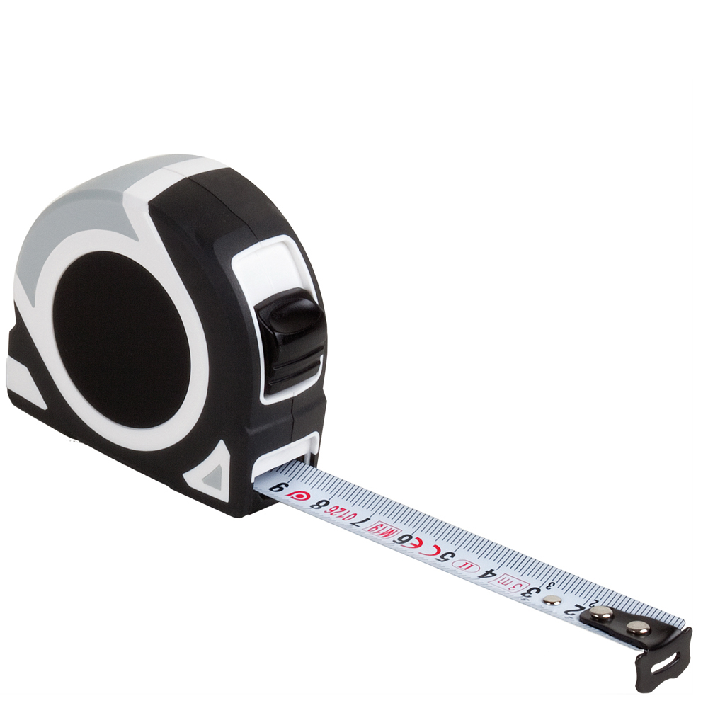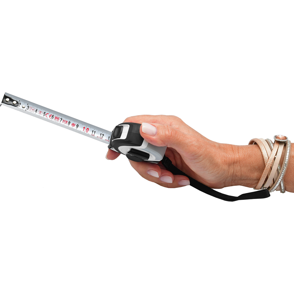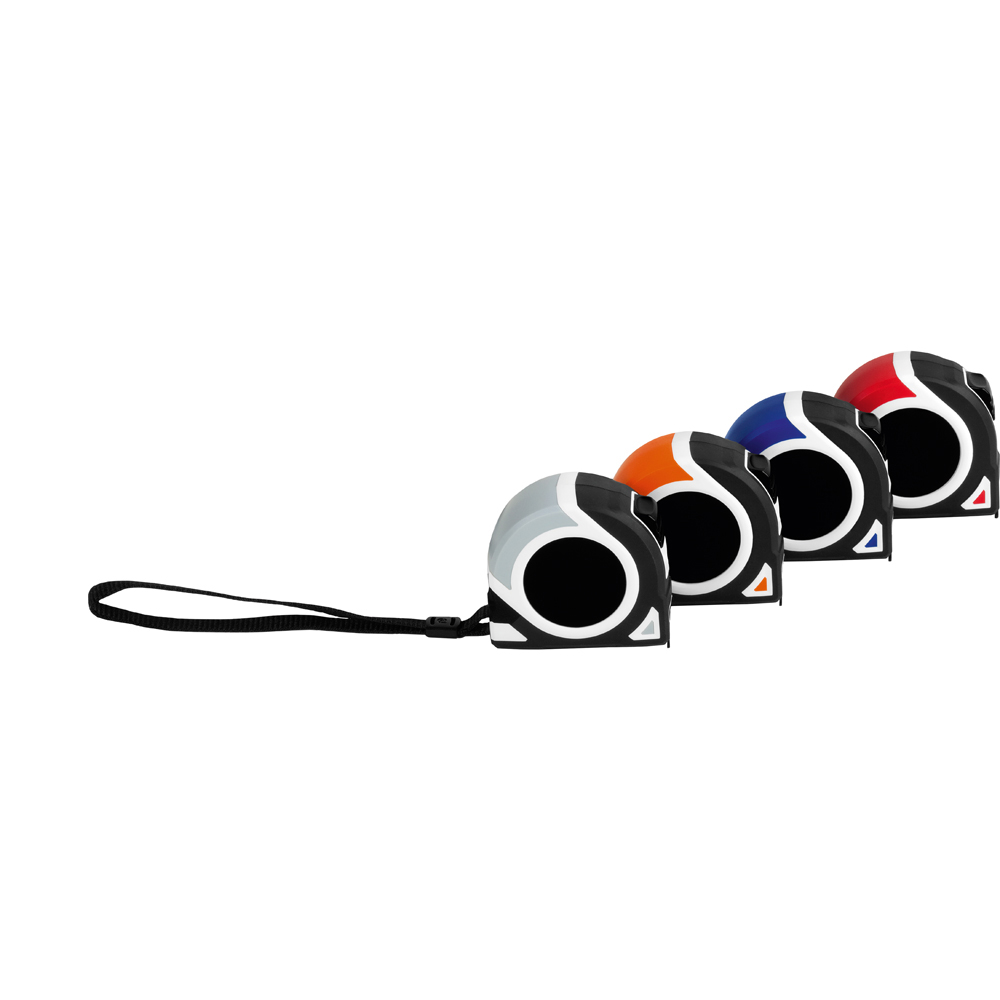 3 Meter Bandmaß mit Bandfeststellmechanismus. Gehäuse: schlagfestes 2-Komponenten-Gehäuse aus ABS und TPR. Band: 3 m/16 mm, lackiert. Knickfestigkeit: 1,50 m. Skalierung: cm, einseitig. Genauigkeitsklasse: EG-Klasse II. Ausstattung: dynamischer Bandrücklauf, beweglicher Bandanfangshaken, Gürtelclip, Textilhandschlaufe. Verpackung: schwarze Geschenkverpackung.