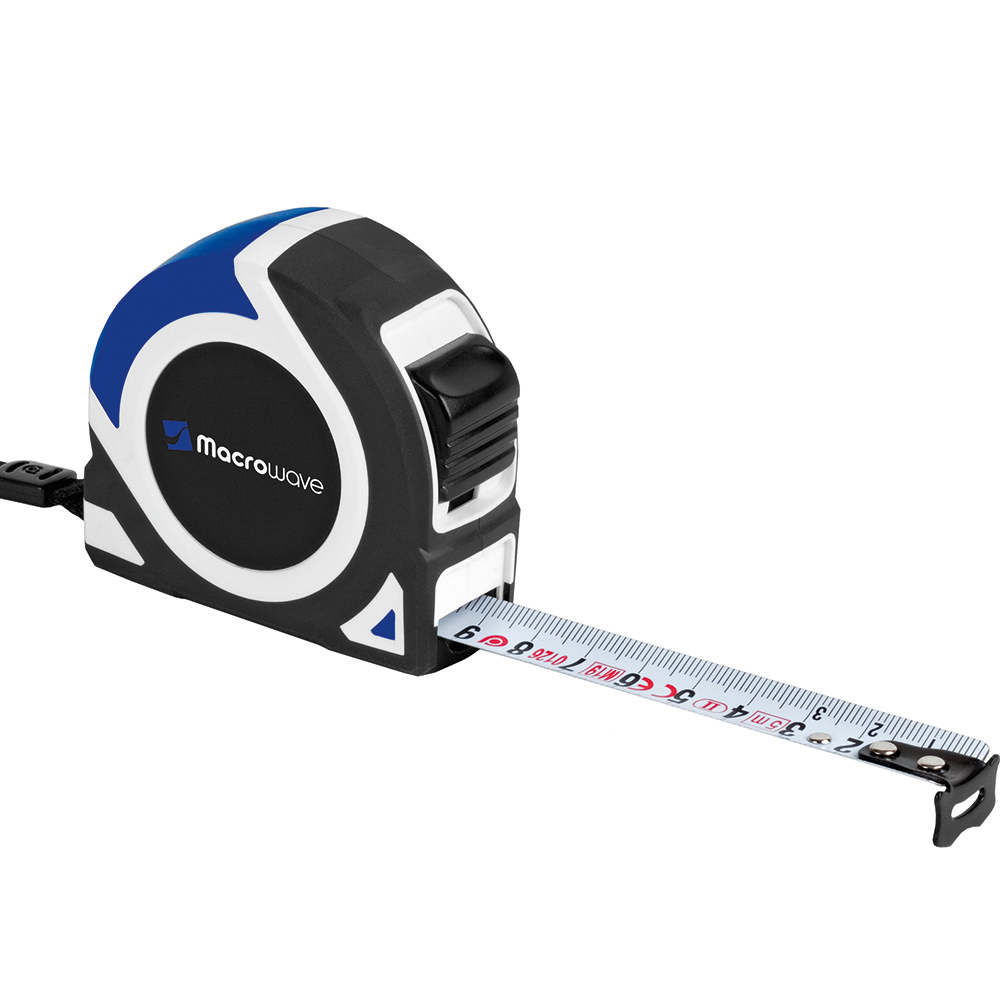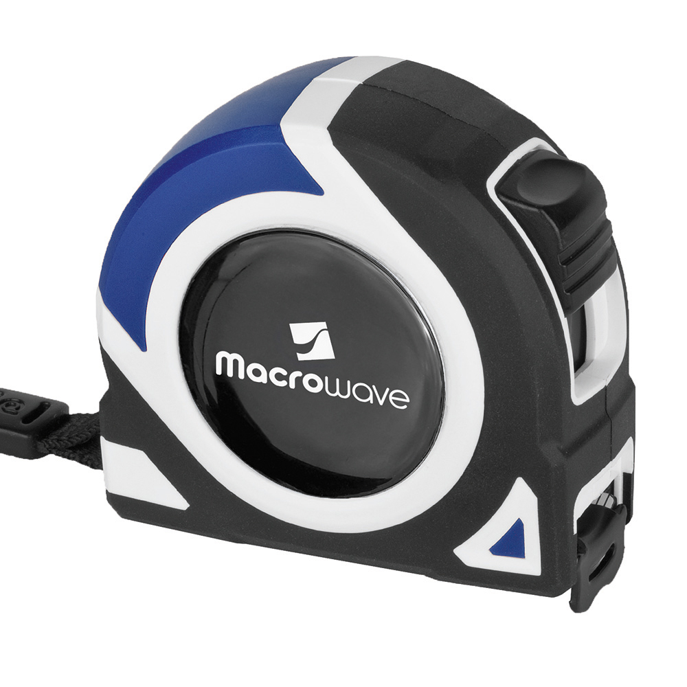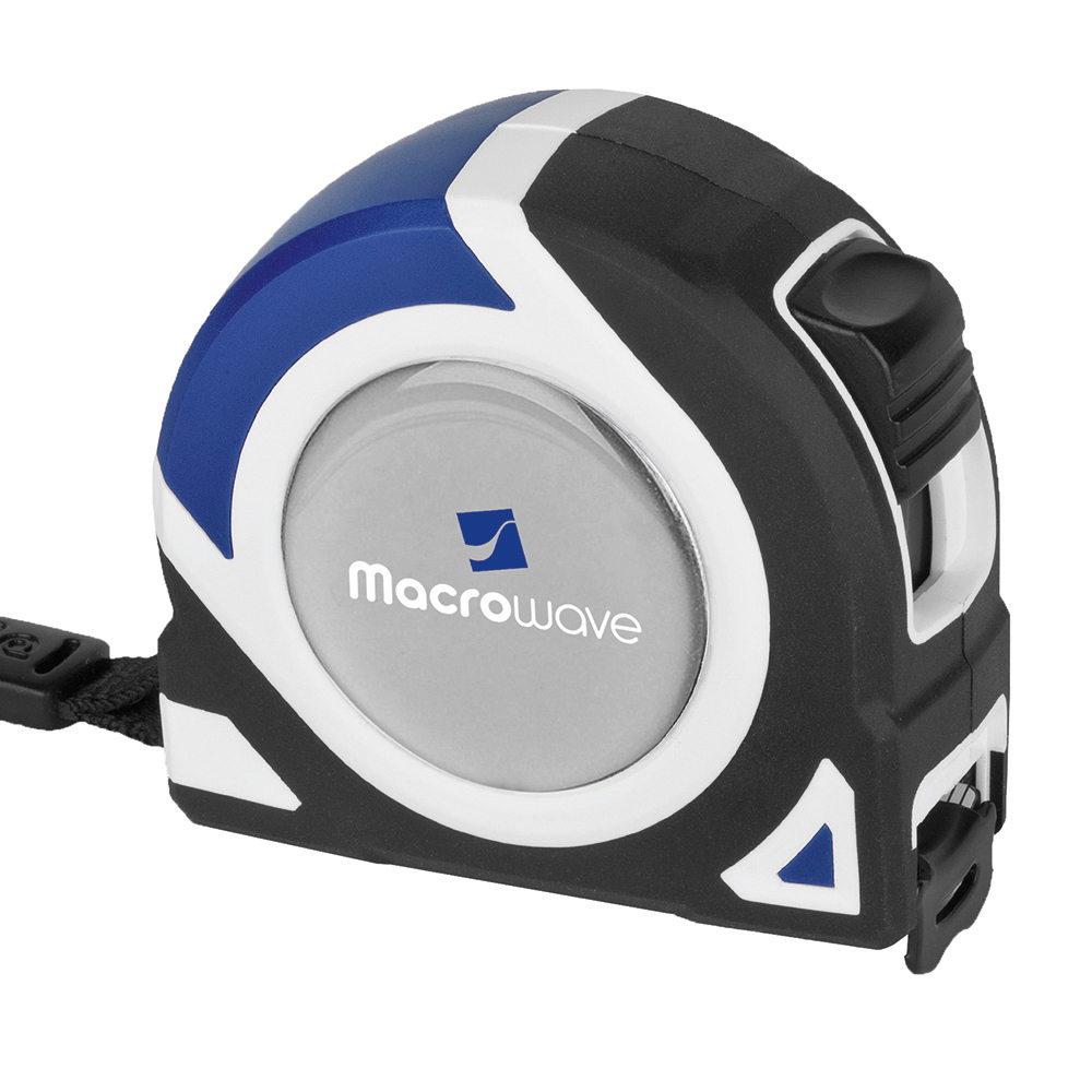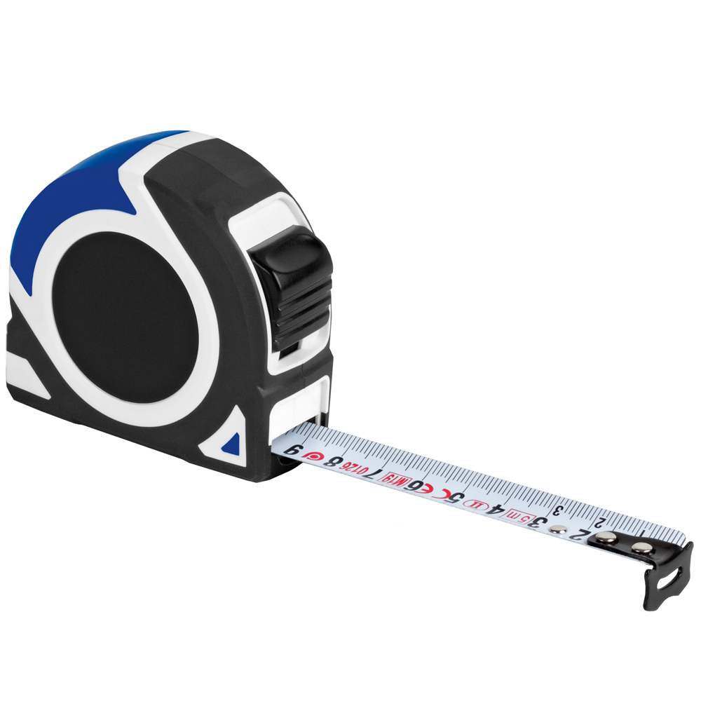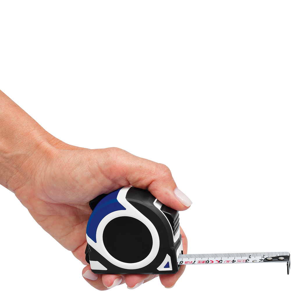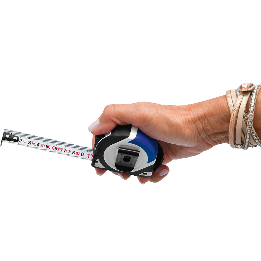 5 Meter Bandmaß mit Bandfeststellmechanismus. Gehäuse: schlagfestes 2-Komponenten-Gehäuse aus ABS und TPR. Band: 5 m/19 mm, lackiert. Knickfestigkeit: 1,80 m. Skalierung: cm, einseitig. Genauigkeitsklasse: EG-Klasse II. Ausstattung: dynamischer Bandrücklauf, beweglicher Bandanfangshaken, Gürtelclip, Textilhandschlaufe. Verpackung: schwarze Geschenkverpackung.