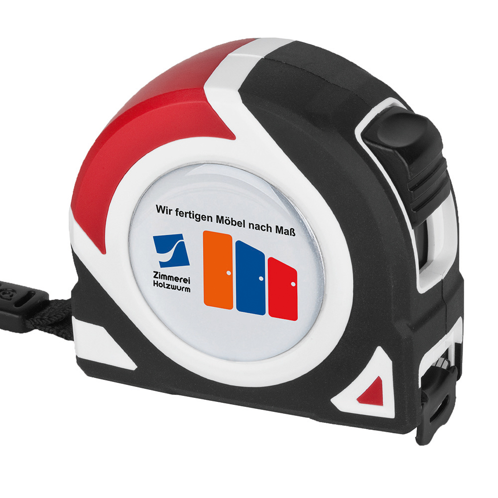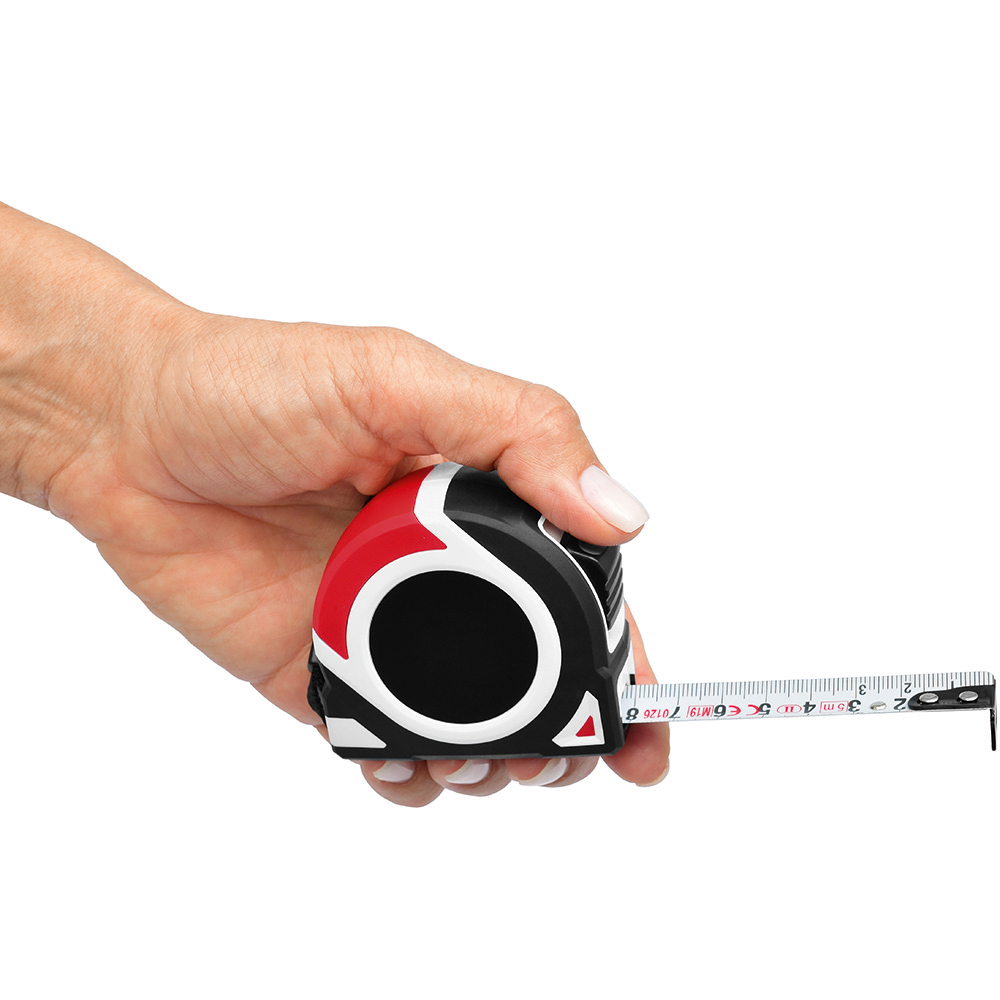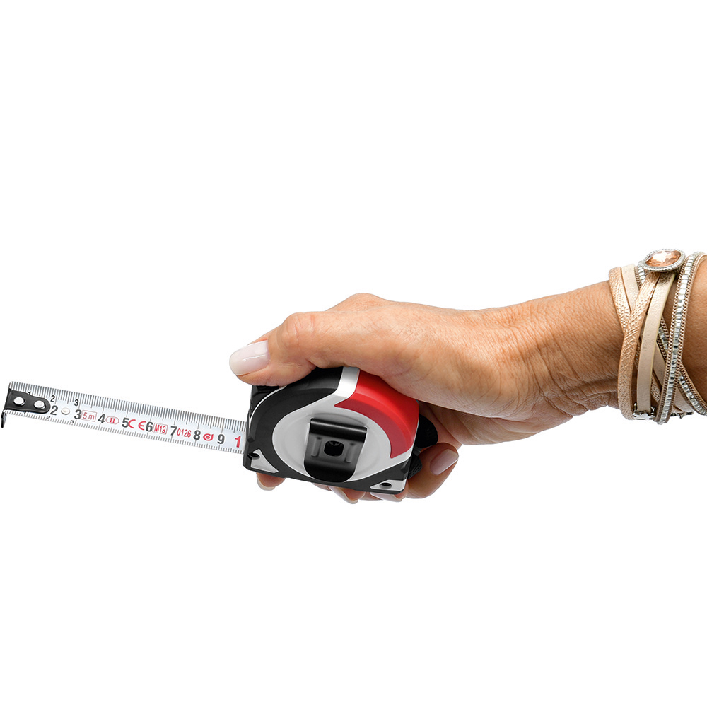 5 Meter Bandmaß mit Bandfeststellmechanismus. Gehäuse: schlagfestes 2-Komponenten-Gehäuse aus ABS und TPR. Band: 5 m/19 mm, lackiert. Knickfestigkeit: 1,80 m. Skalierung: cm, einseitig. Genauigkeitsklasse: EG-Klasse II. Ausstattung: dynamischer Bandrücklauf, beweglicher Bandanfangshaken, Gürtelclip, Textilhandschlaufe. Verpackung: schwarze Geschenkverpackung.