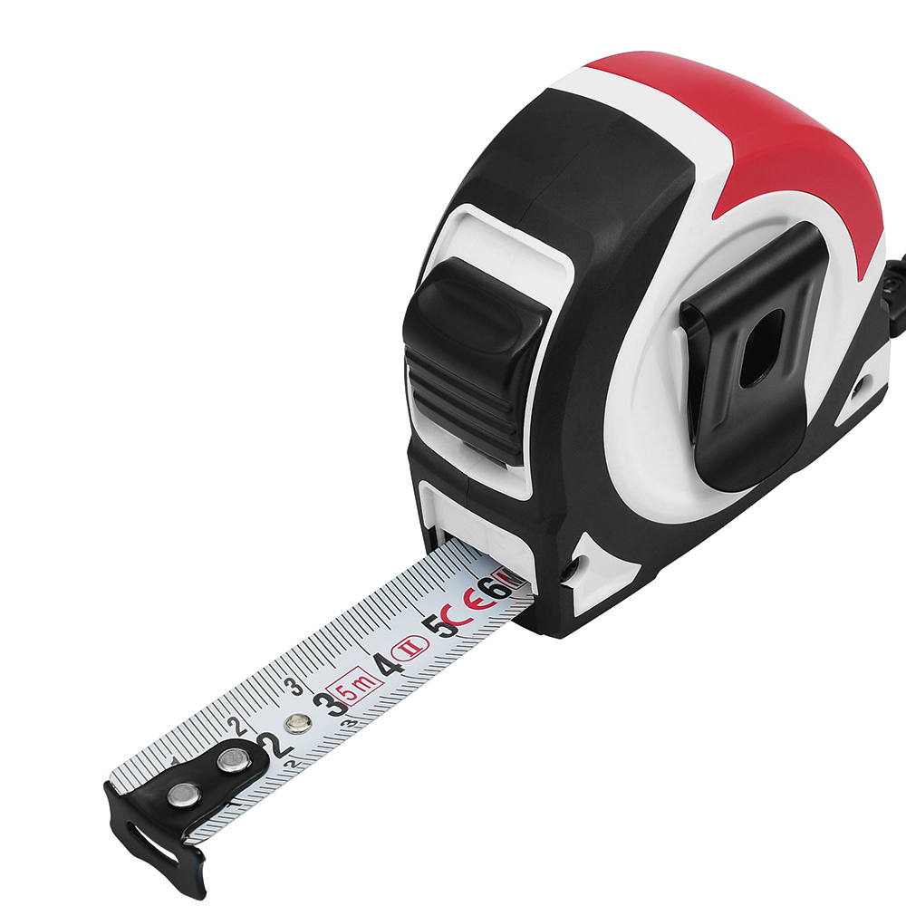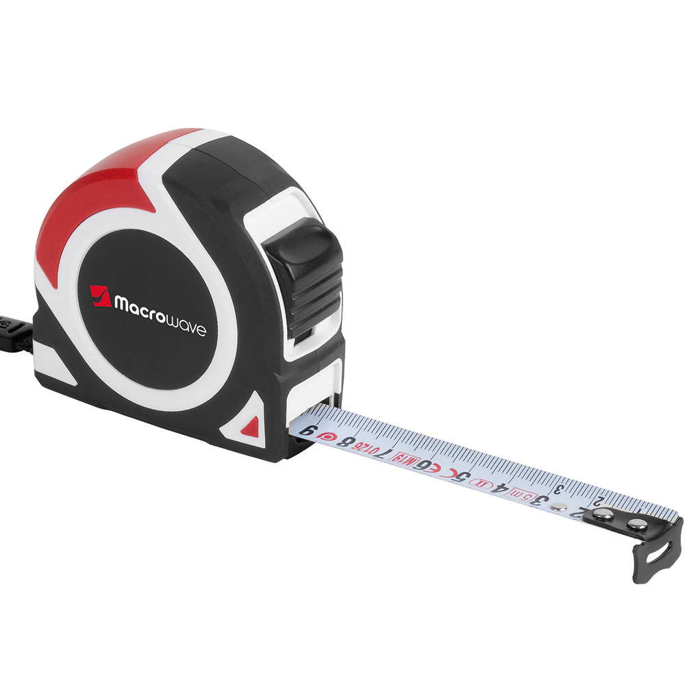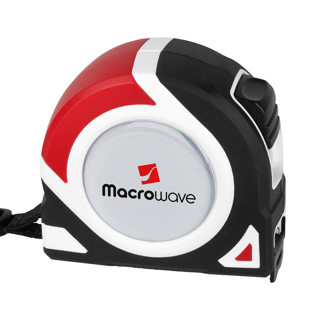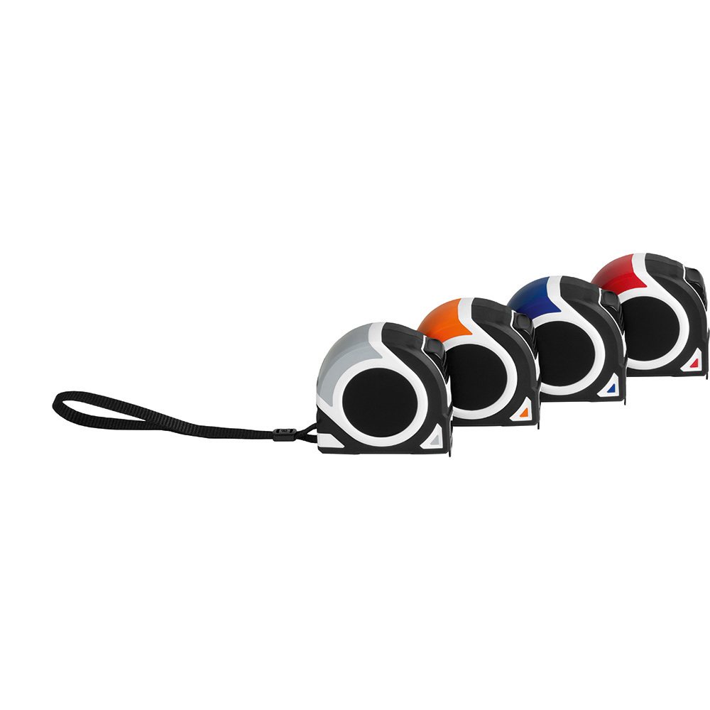 5 Meter Bandmaß mit Bandfeststellmechanismus. Gehäuse: schlagfestes 2-Komponenten-Gehäuse aus ABS und TPR. Band: 5 m/19 mm, lackiert. Knickfestigkeit: 1,80 m. Skalierung: cm, einseitig. Genauigkeitsklasse: EG-Klasse II. Ausstattung: dynamischer Bandrücklauf, beweglicher Bandanfangshaken, Gürtelclip, Textilhandschlaufe. Verpackung: schwarze Geschenkverpackung.