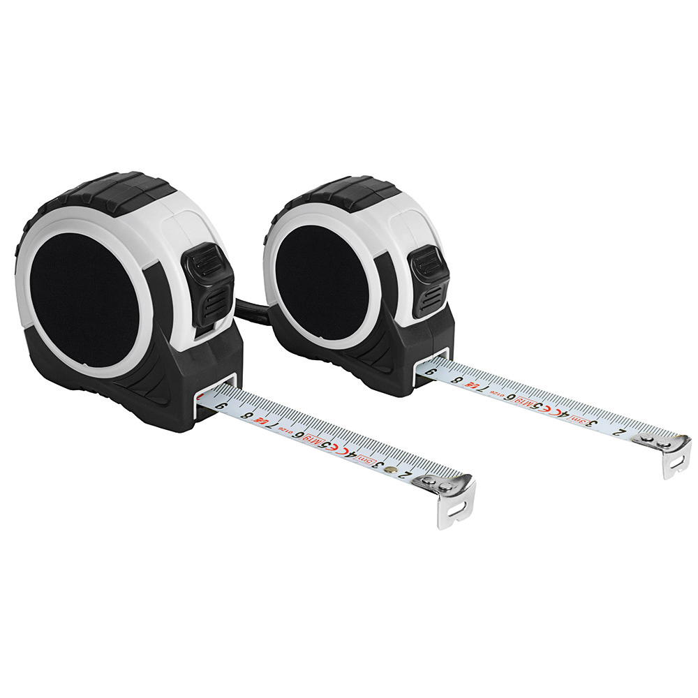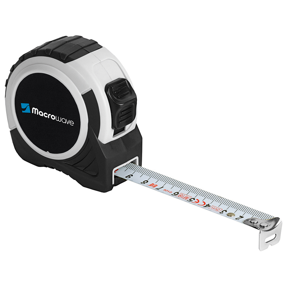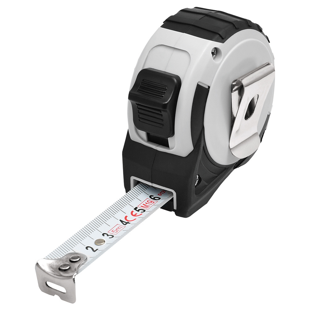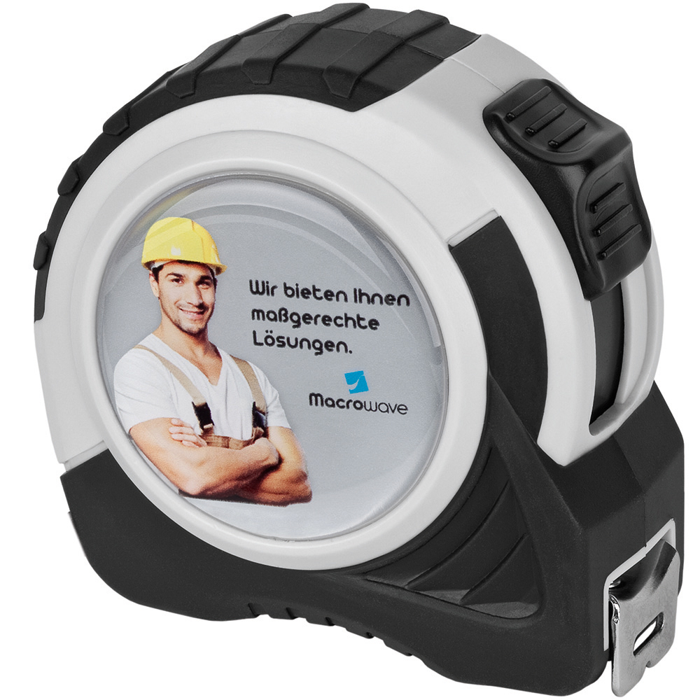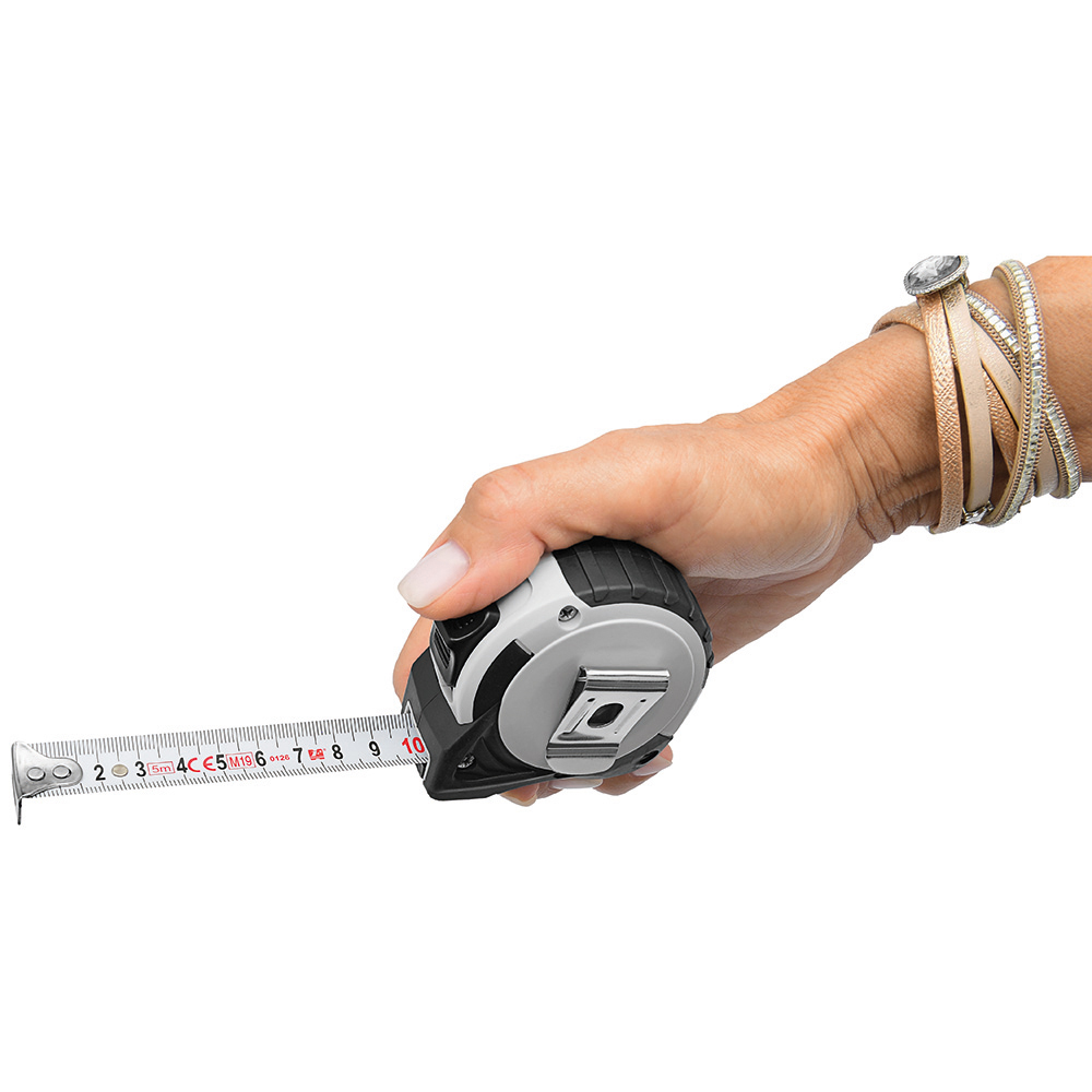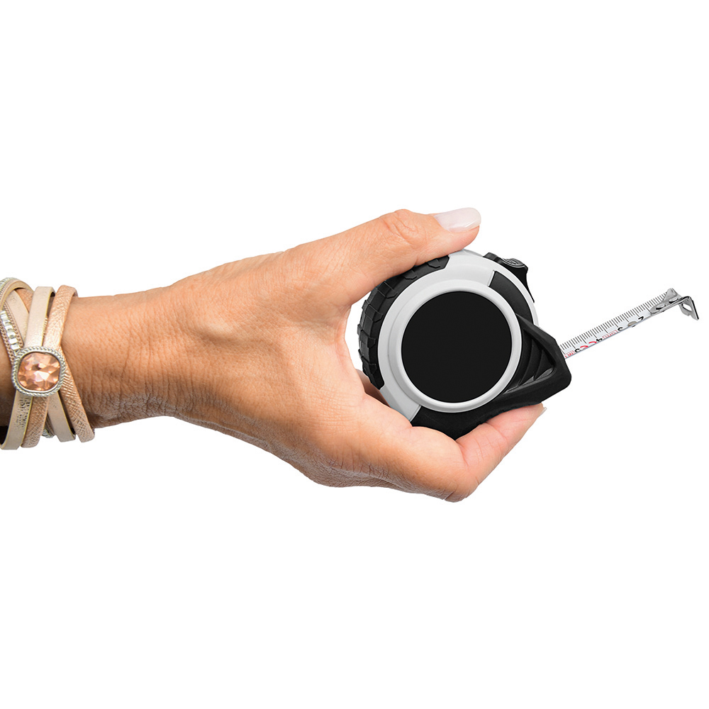 5 Meter Bandmaß mit Bandfeststellmechanismus. Gehäuse: schlagfestes 2-Komponenten-Gehäuse aus ABS und TPR. Band: 5 m/19 mm, lackiert. Knickfestigkeit: 1,70 m. Skalierung: cm, einseitig. Genauigkeitsklasse: EG-Klasse II. Ausstattung: dynamischer Bandrücklauf, beweglicher Bandanfangshaken, Gürtelclip, Gummihandschlaufe. Verpackung: schwarze Geschenkverpackung.
