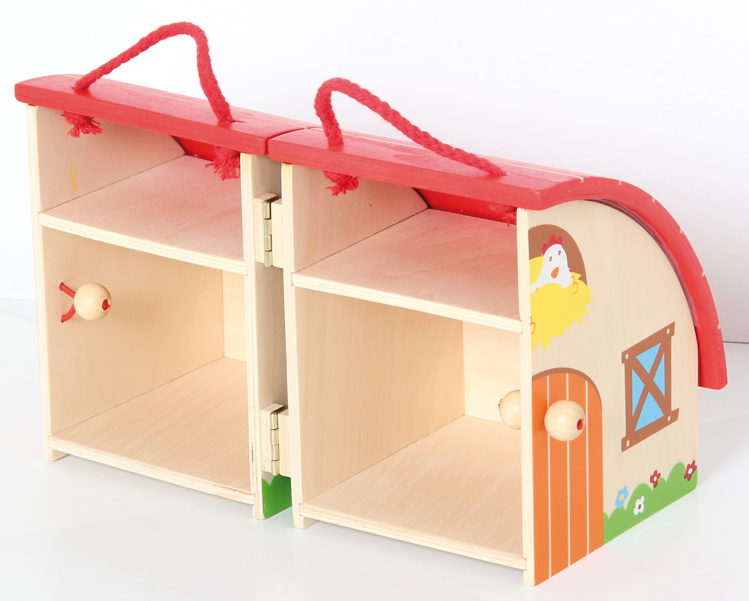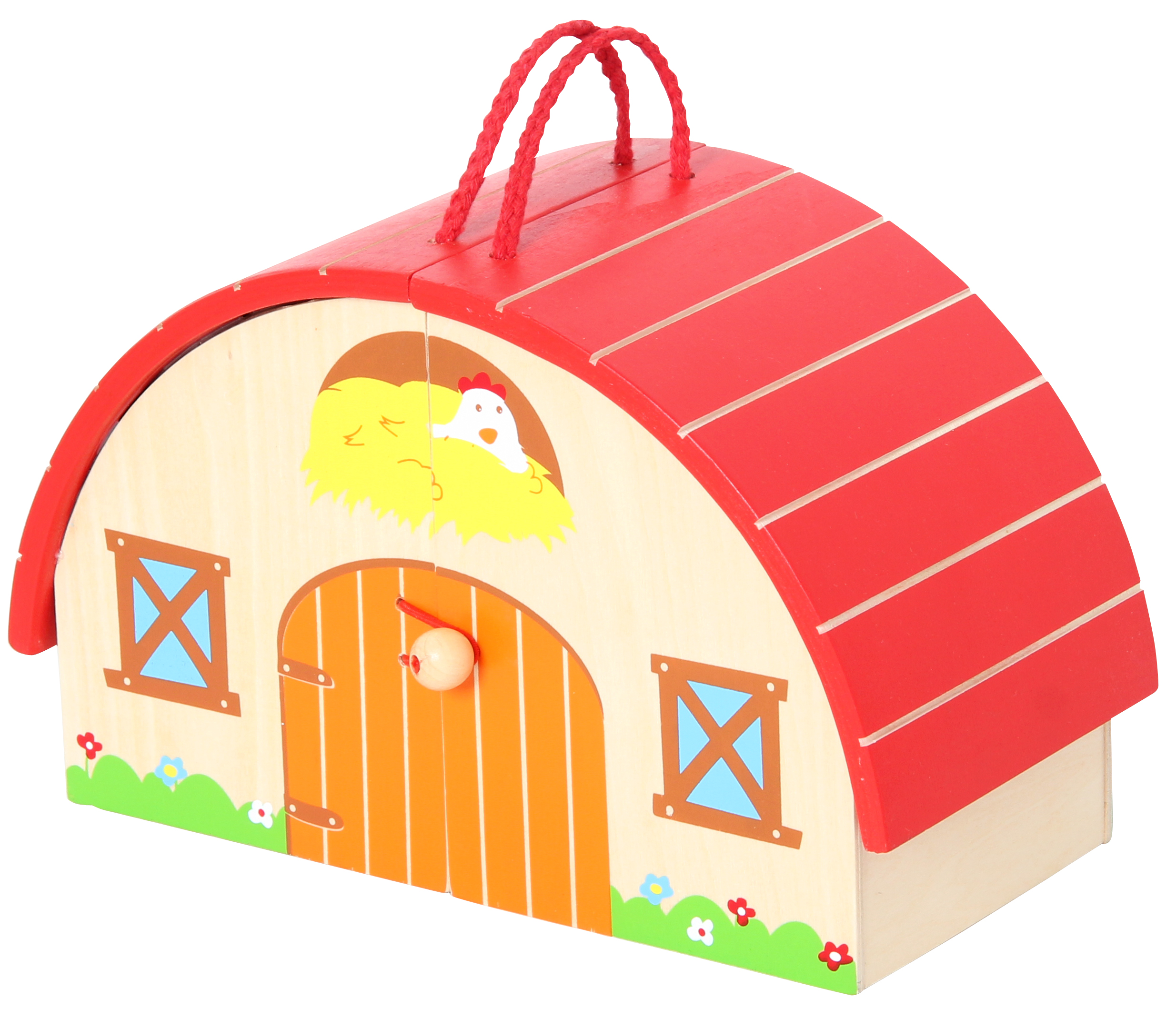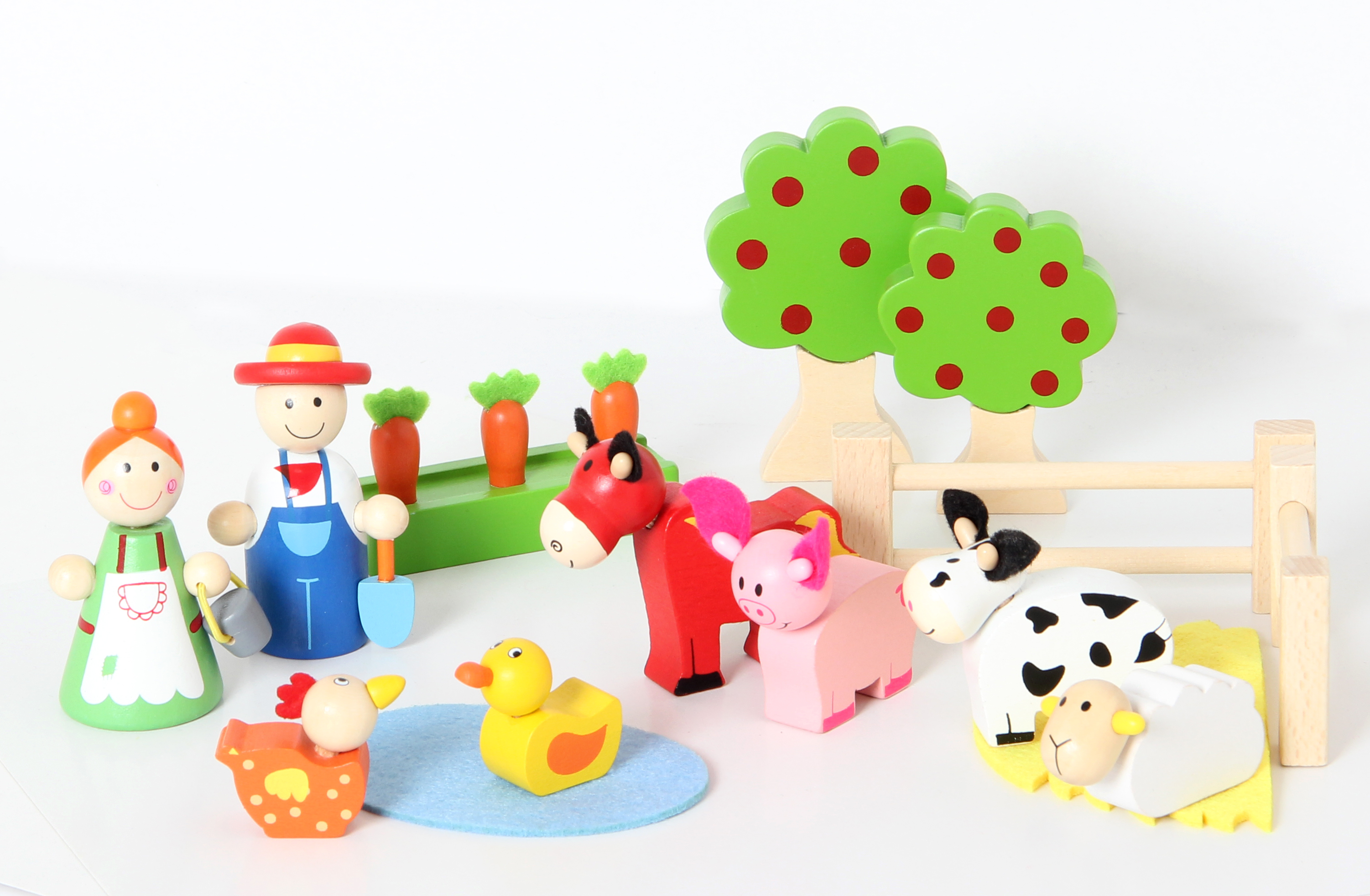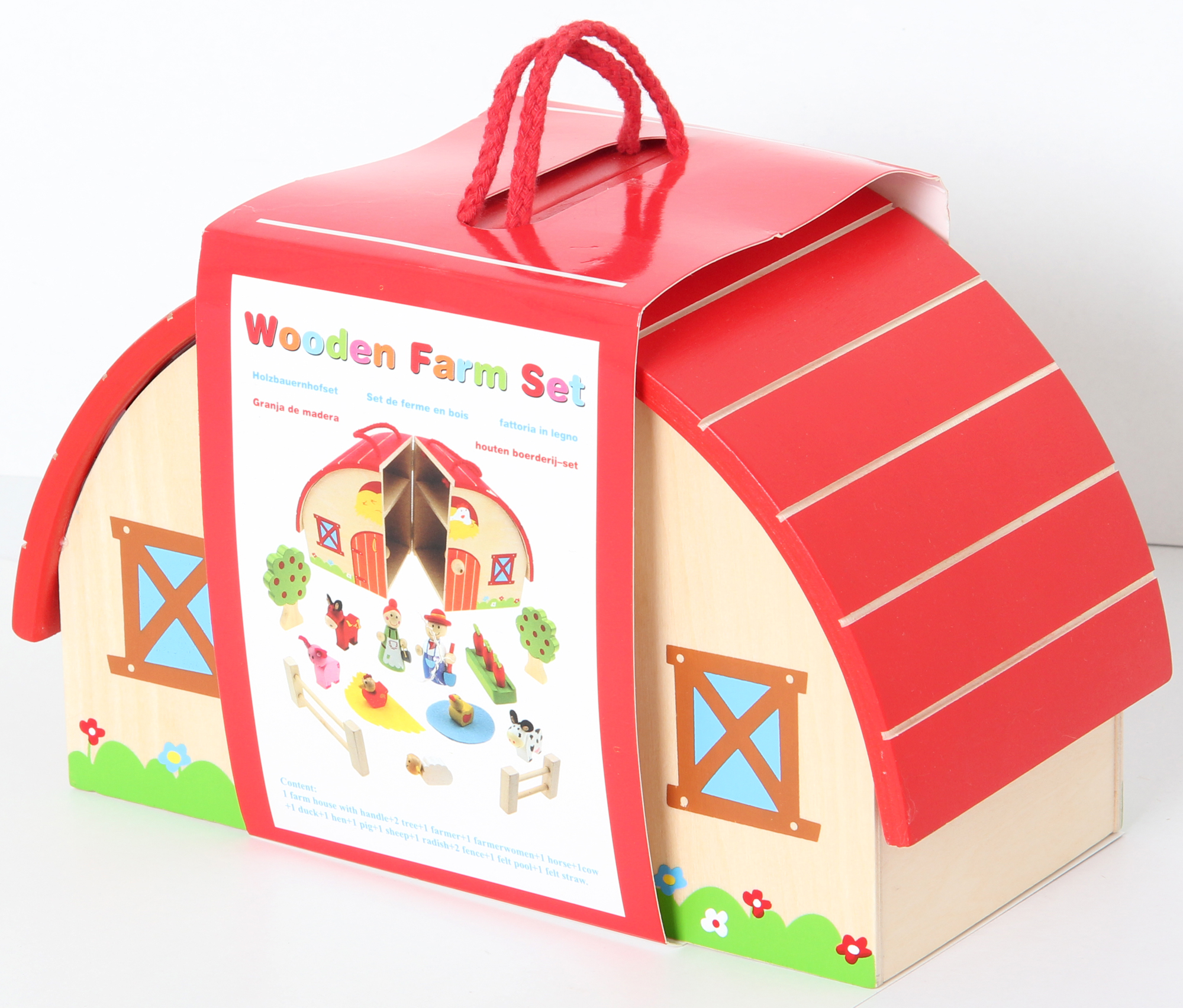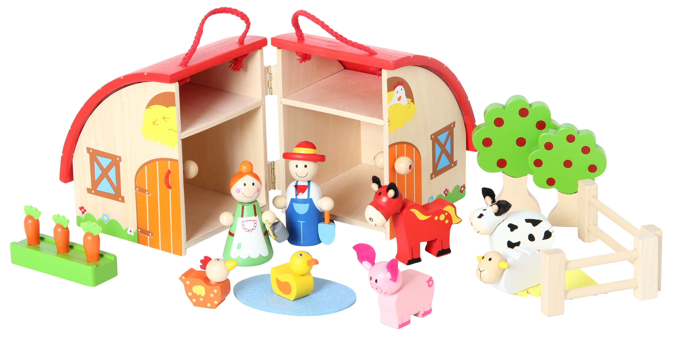Besonders schönes, hochwertiges Spielset für Kids! Inhalt: Bauernhaus mit praktischem Tragegriff, 2 Bäume, 2 Zaunelemente, Bauer, Bäuerin, Pferd, Ente, Huhn, Schaf, Schwein, Kuh, Gemüsebeet, Teich, Stroh. Alles aus Holz mit Stoffelementen.