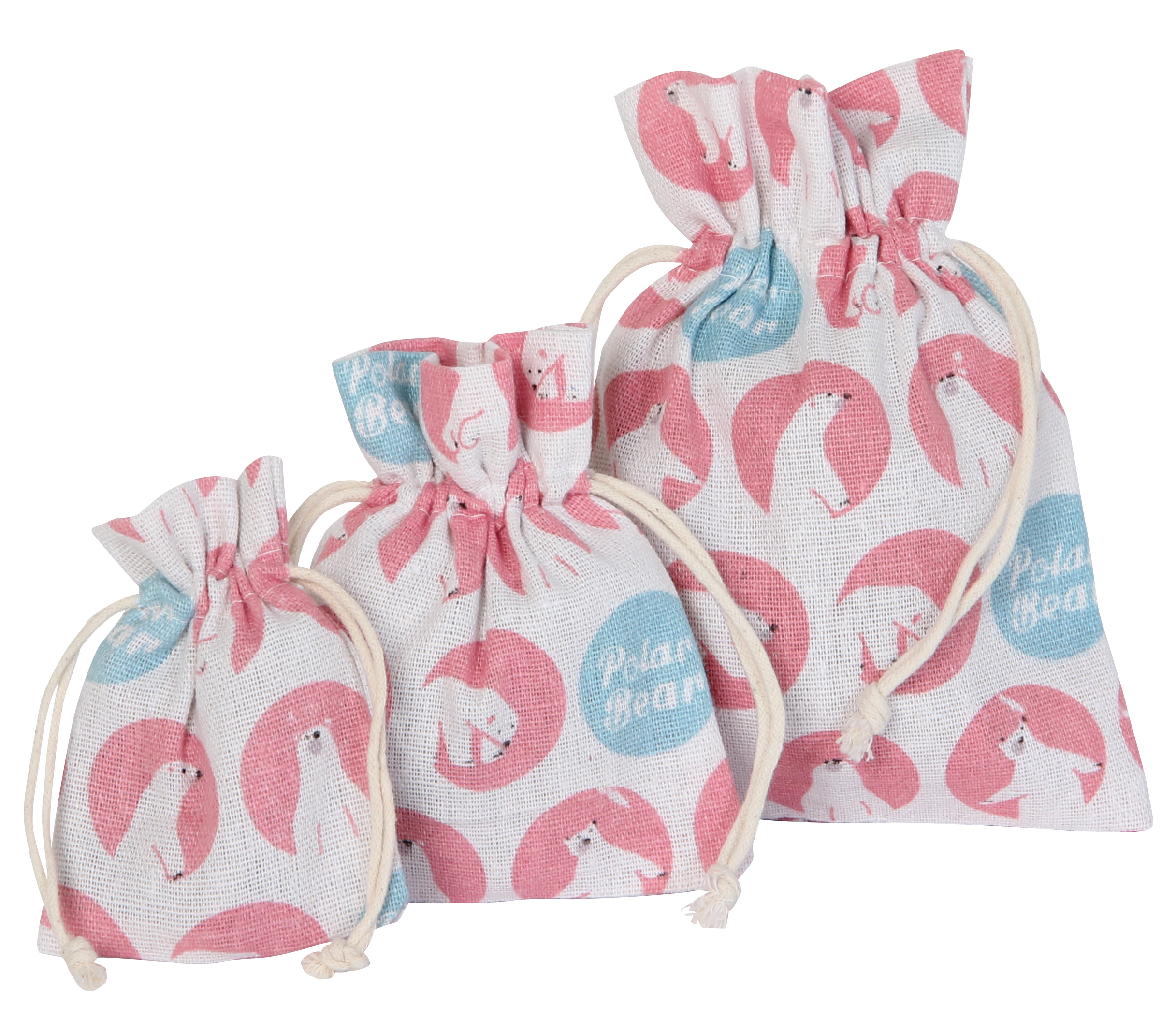 Praktisch und dekorativ sind die niedlichen Beutel aus Baumwolle mit Kodelzug im Polar Bear Desing! Größen: 13 x 18cm, 10 x 12,5cm, 7,5 x 10cm im Set!