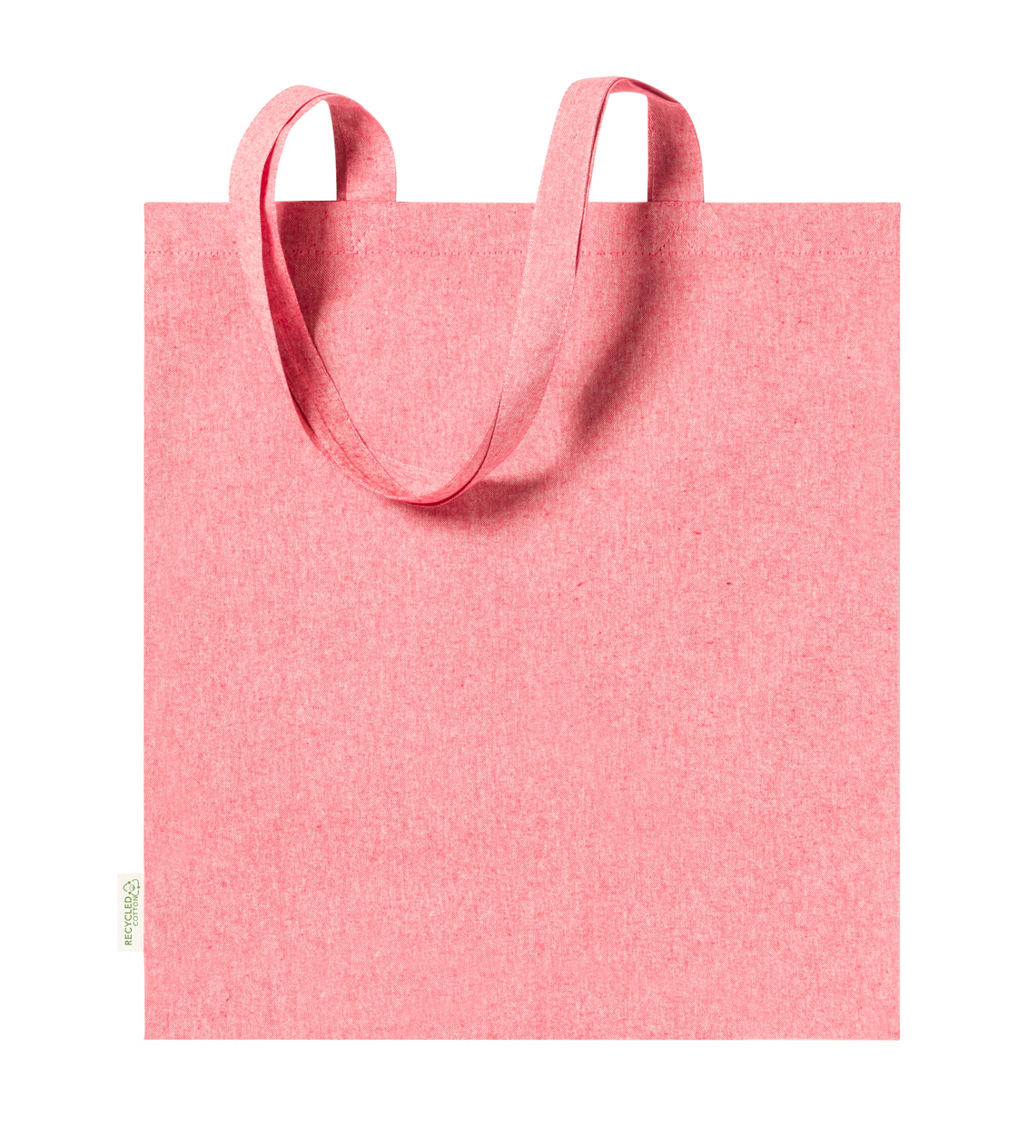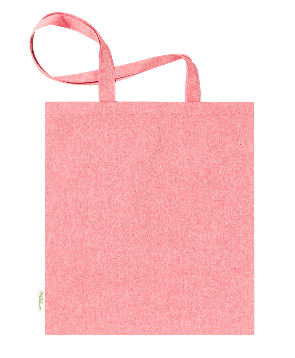 Wiederverwendbare Baumwolltasche aus recycleter Baumwolle mit langen Henkeln. Material: 100% recyclete Baumwolle (140 g / m²). Mit Label recycelte Baumwolle.