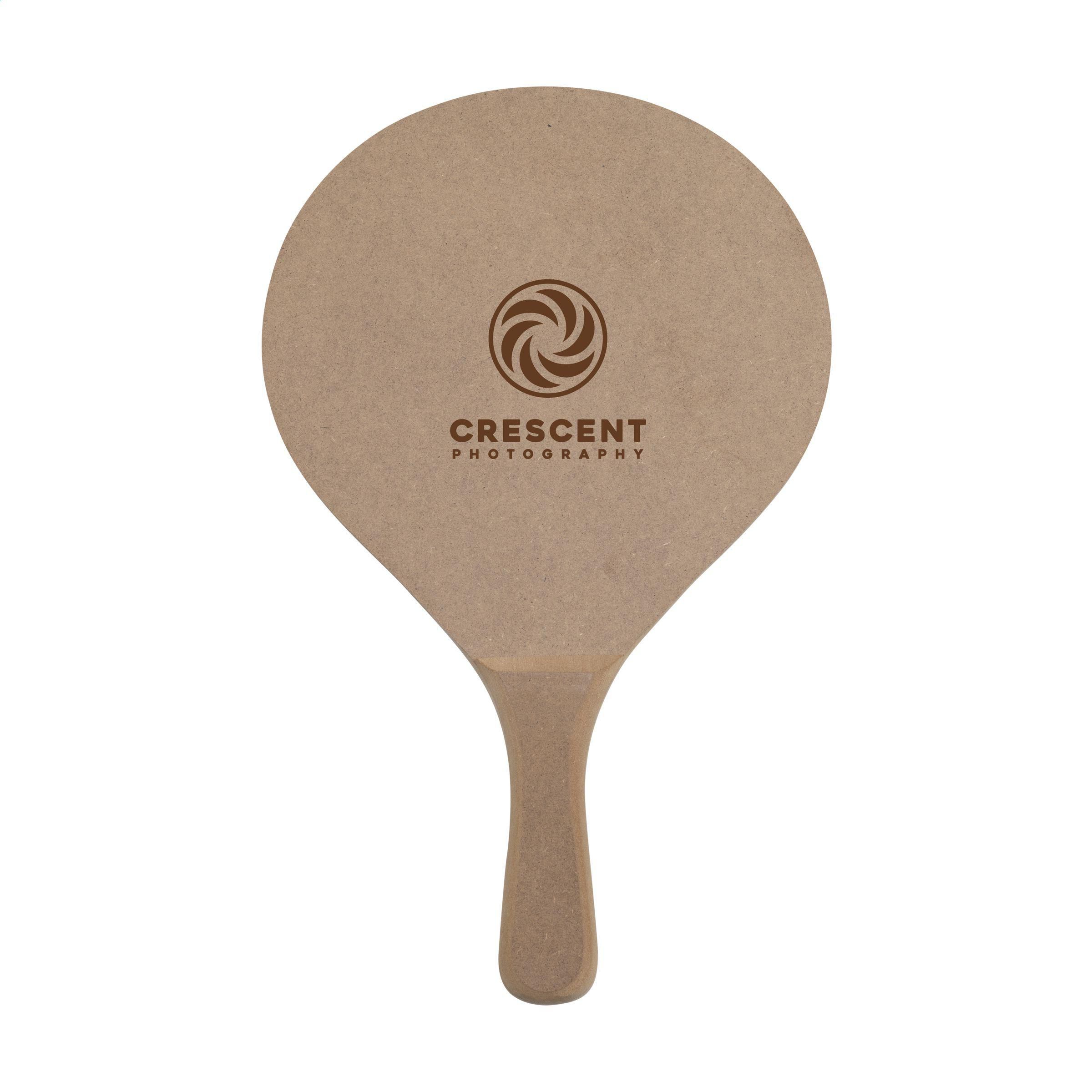 Sportliches Strandset: 2 Schläger aus rohem MDF-Holz und Gummiball. Pro Set im Aufbewahrungsnetz aus Baumwollgewebe.ACHTUNG: Bei einem 2-Farbendruck auf den Schlägern ist keine perfekte Passgenauigkeit möglich - dies ist nur gewährleistet, wenn sich die Farben nicht berühren.