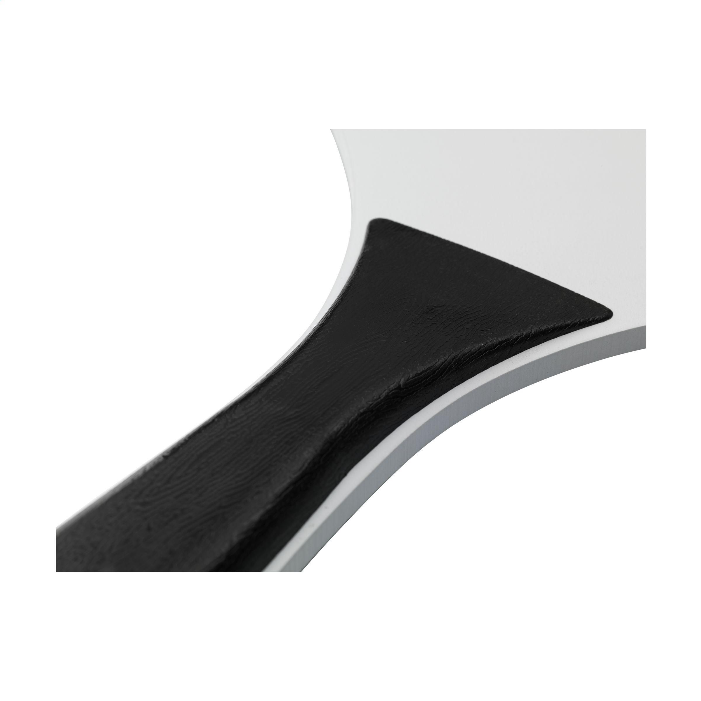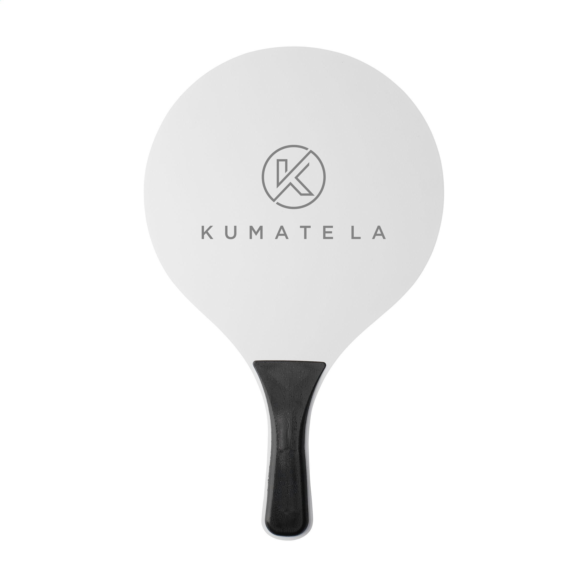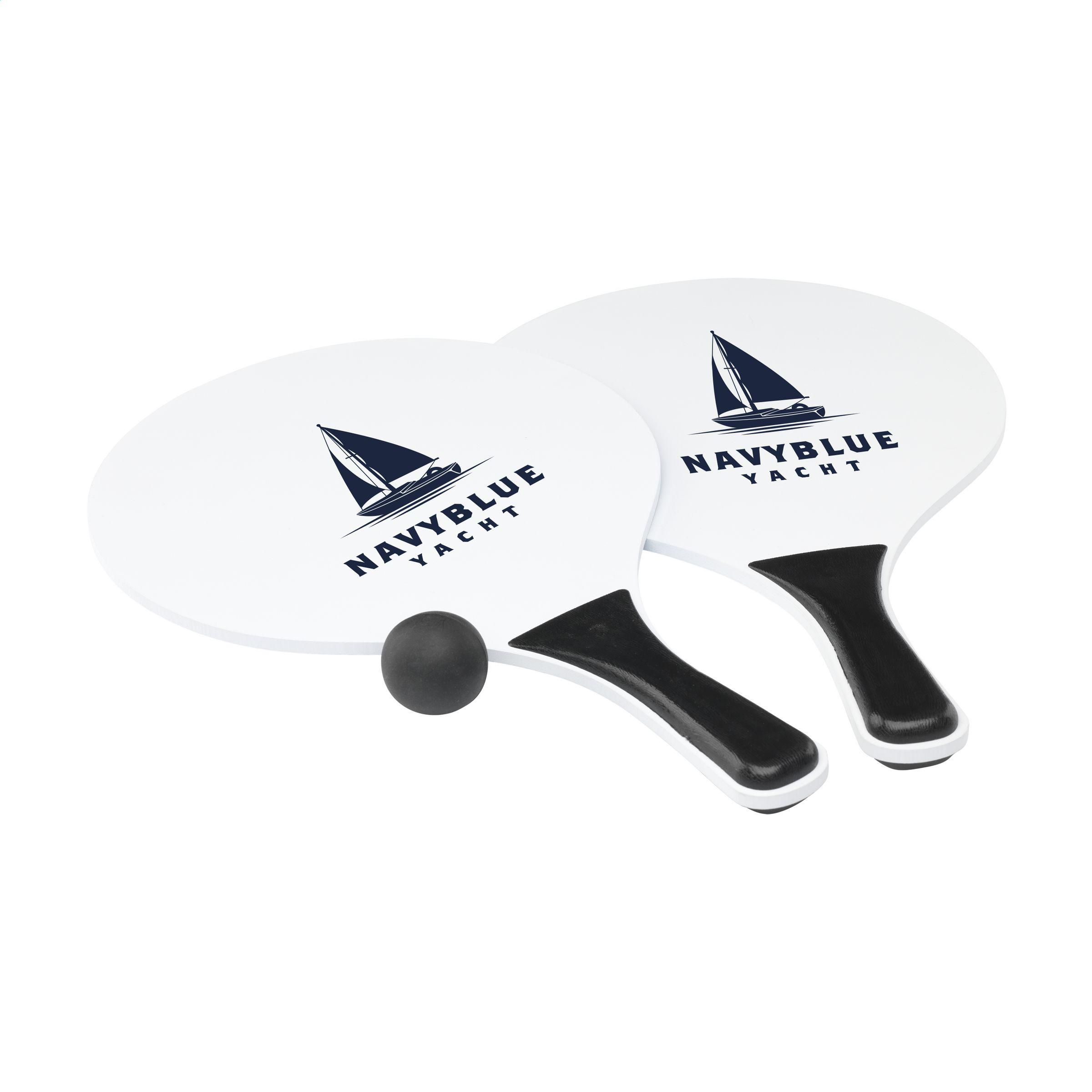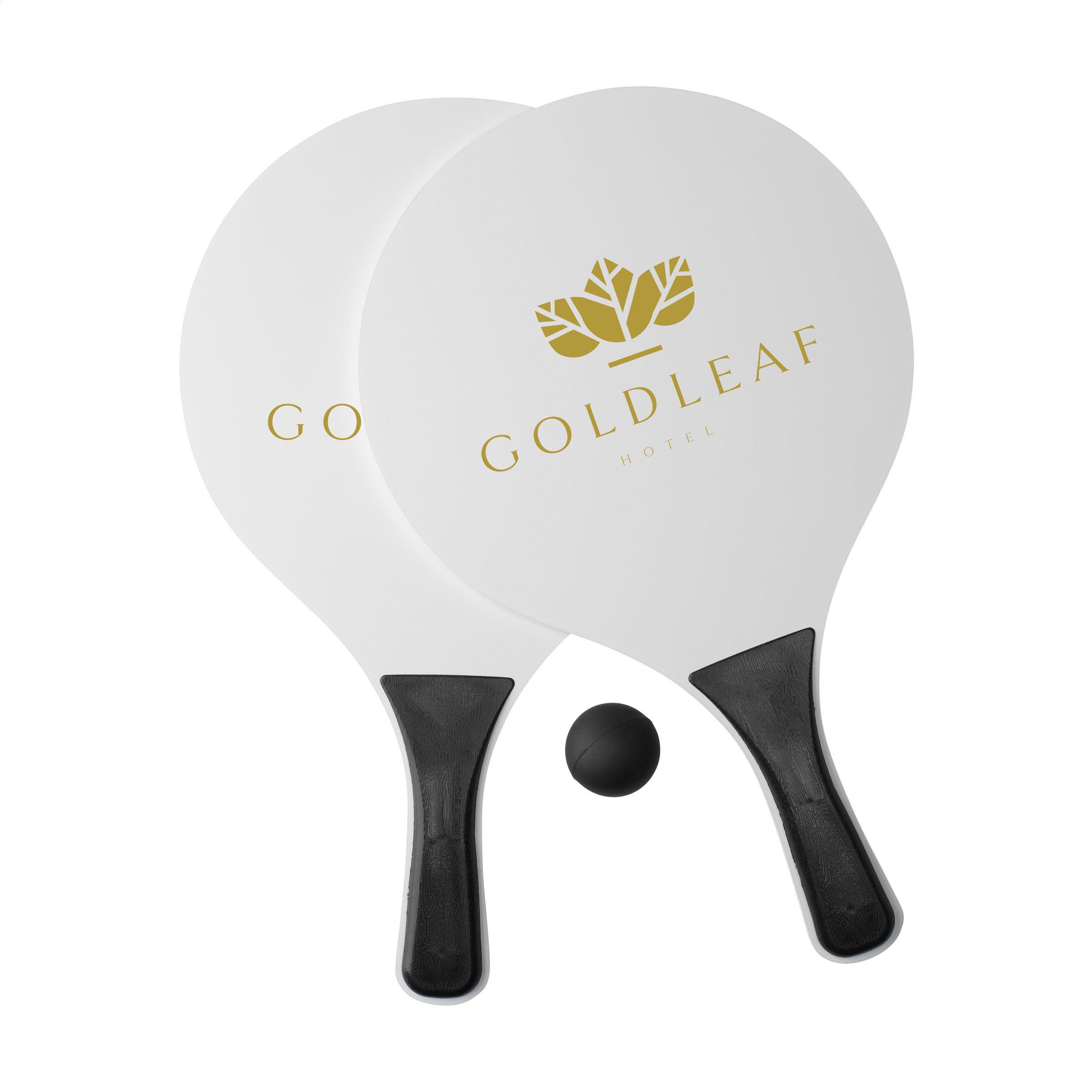Sportliches Strandset: 2 Schläger aus MDF-Holz mit PP-Kunststoffgriffen und Gummiball. Pro Set in einem Netz zur Aufbewahrung.ACHTUNG: Bei einem 2-Farbendruck auf den Schlägern ist keine perfekte Passgenauigkeit möglich - dies ist nur gewährleistet, wenn sich die Farben nicht berühren.